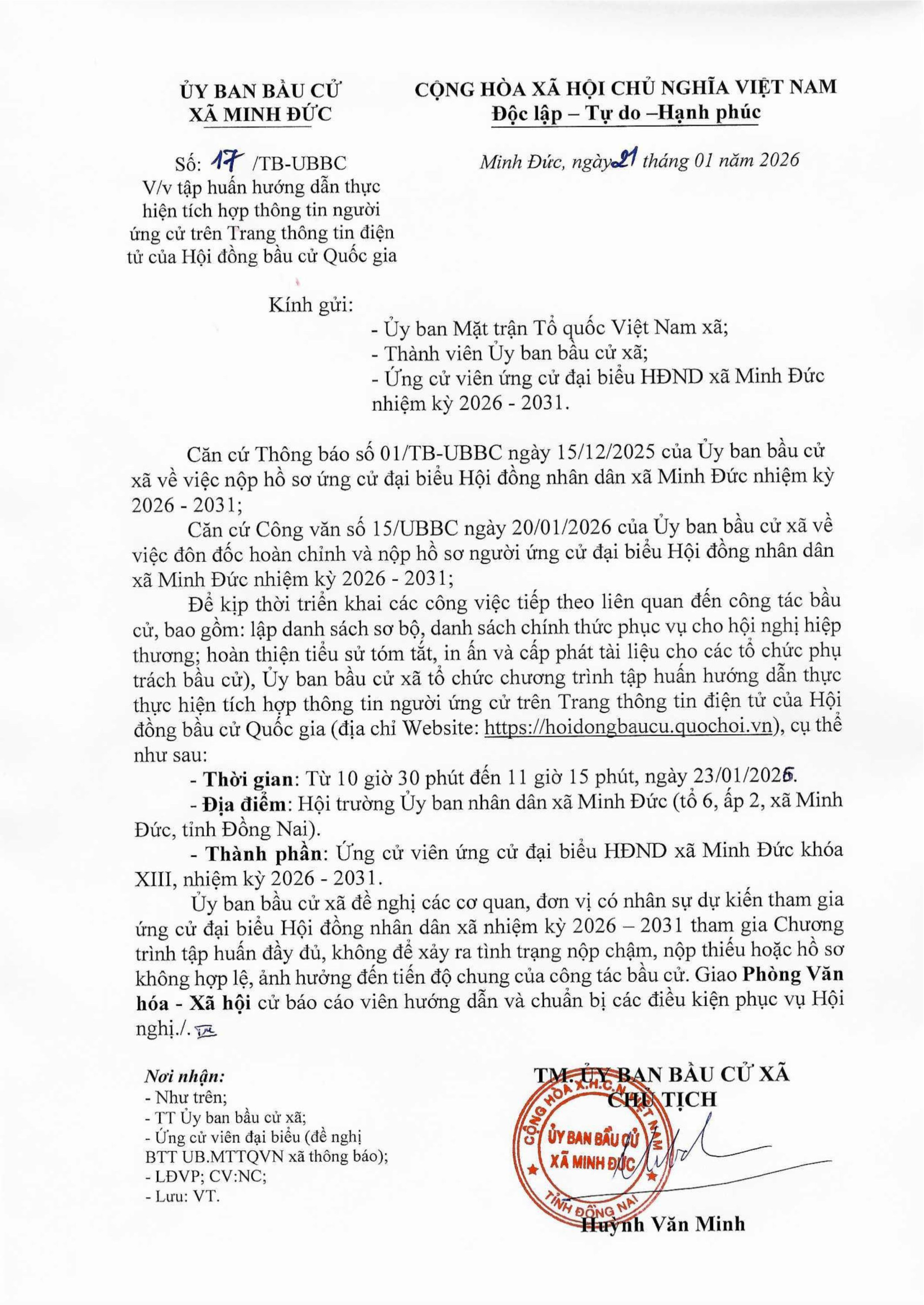 Nhằm đảm bảo tiến độ và tính chính xác trong công tác chuẩn bị bầu cử, Ủy ban bầu cử xã Minh Đức thông báo tổ chức chương trình tập huấn hướng dẫn thực hiện tích hợp thông tin người ứng cử trên Trang thông tin điện tử của Hội đồng bầu cử Quốc gia (https://hoidongbaucu.quochoi.vn).