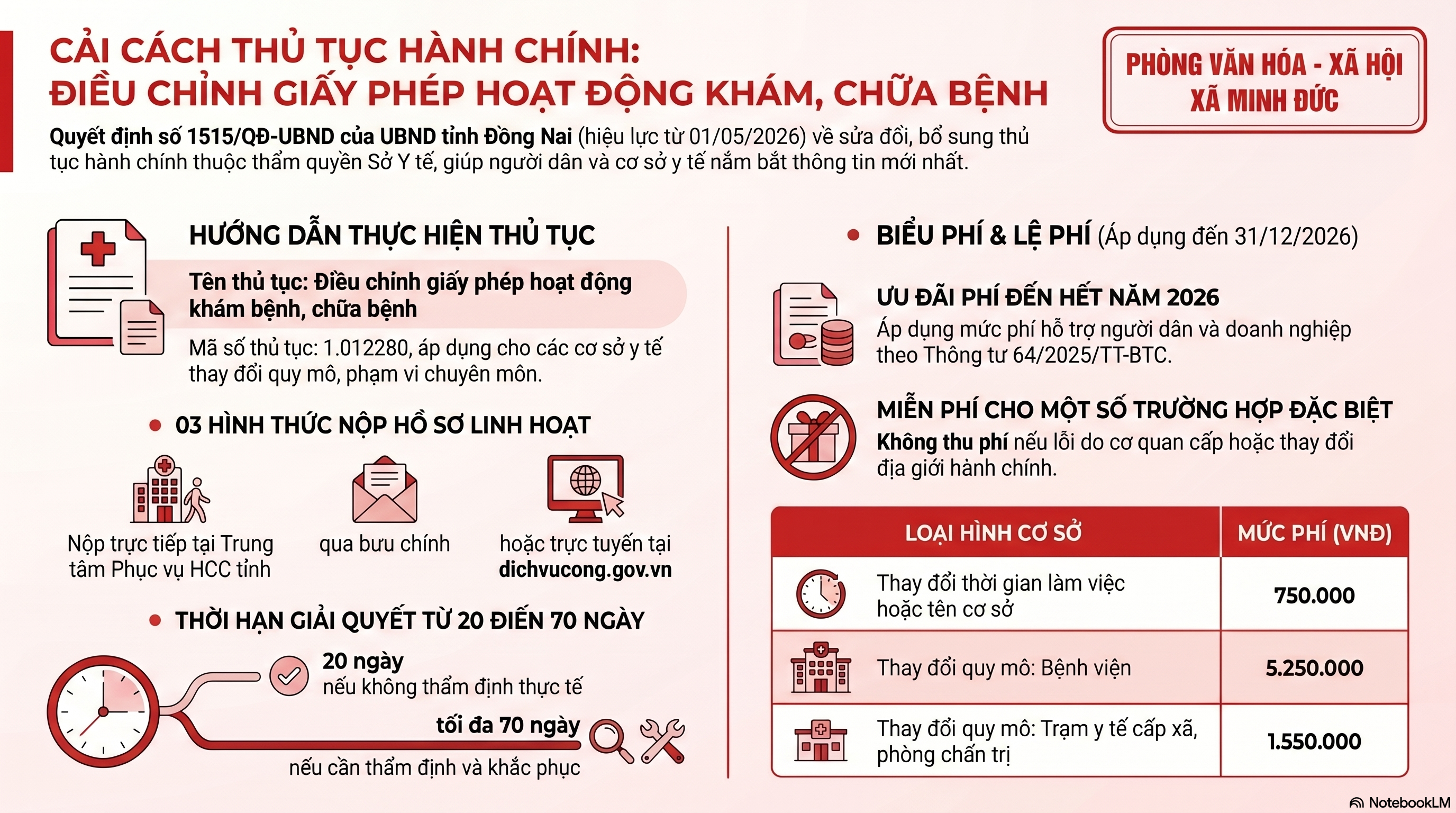 Nội dung trọng tâm của sự thay đổi Điểm nổi bật trong đợt công bố này là việc sửa đổi, bổ sung thủ tục “Điều chỉnh giấy phép hoạt động khám bệnh, chữa bệnh” (Mã TTHC: 1.012280). Việc điều chỉnh này áp dụng cho các trường hợp cơ sở y tế có sự thay đổi về quy mô hoạt động, phạm vi hoạt động chuyên môn, thay đổi thời gian làm việc hoặc thay đổi tên gọi,. Quyết định mới này có hiệu lực thi hành kể từ ngày 01/5/2026, thay thế cho các quy định trước đây tại Quyết định số 968/QĐ-UBND.