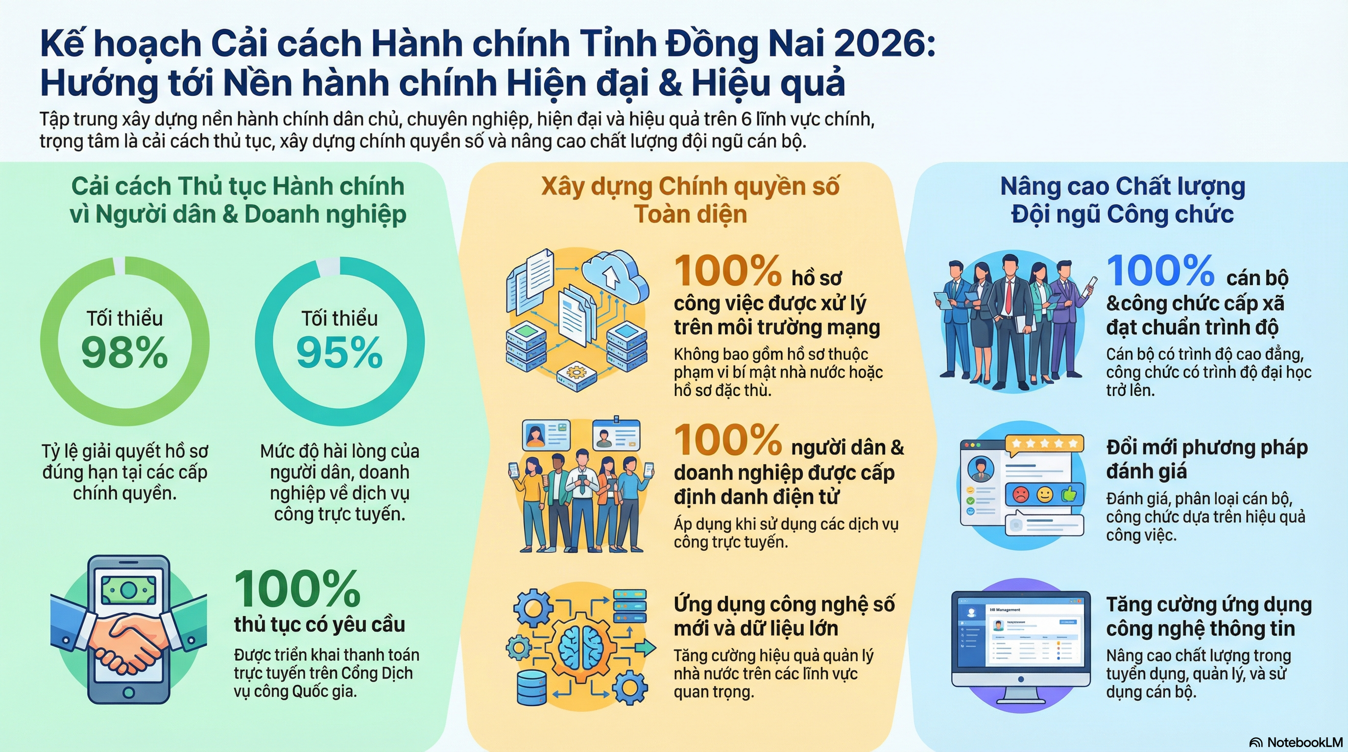 Trọng tâm đầu tiên của kế hoạch là cải cách thủ tục hành chính vì người dân và doanh nghiệp. Theo đó, tỉnh đặt mục tiêu tối thiểu 98% hồ sơ hành chính được giải quyết đúng hạn tại các cấp chính quyền, góp phần nâng cao tính minh bạch, kỷ cương và hiệu quả trong hoạt động của bộ máy hành chính nhà nước. Song song với đó, Đồng Nai phấn đấu đạt mức độ hài lòng của người dân, doanh nghiệp tối thiểu 95% đối với việc sử dụng dịch vụ công trực tuyến. Đây là chỉ số quan trọng phản ánh chất lượng phục vụ và mức độ tin cậy của xã hội đối với nền hành chính.
