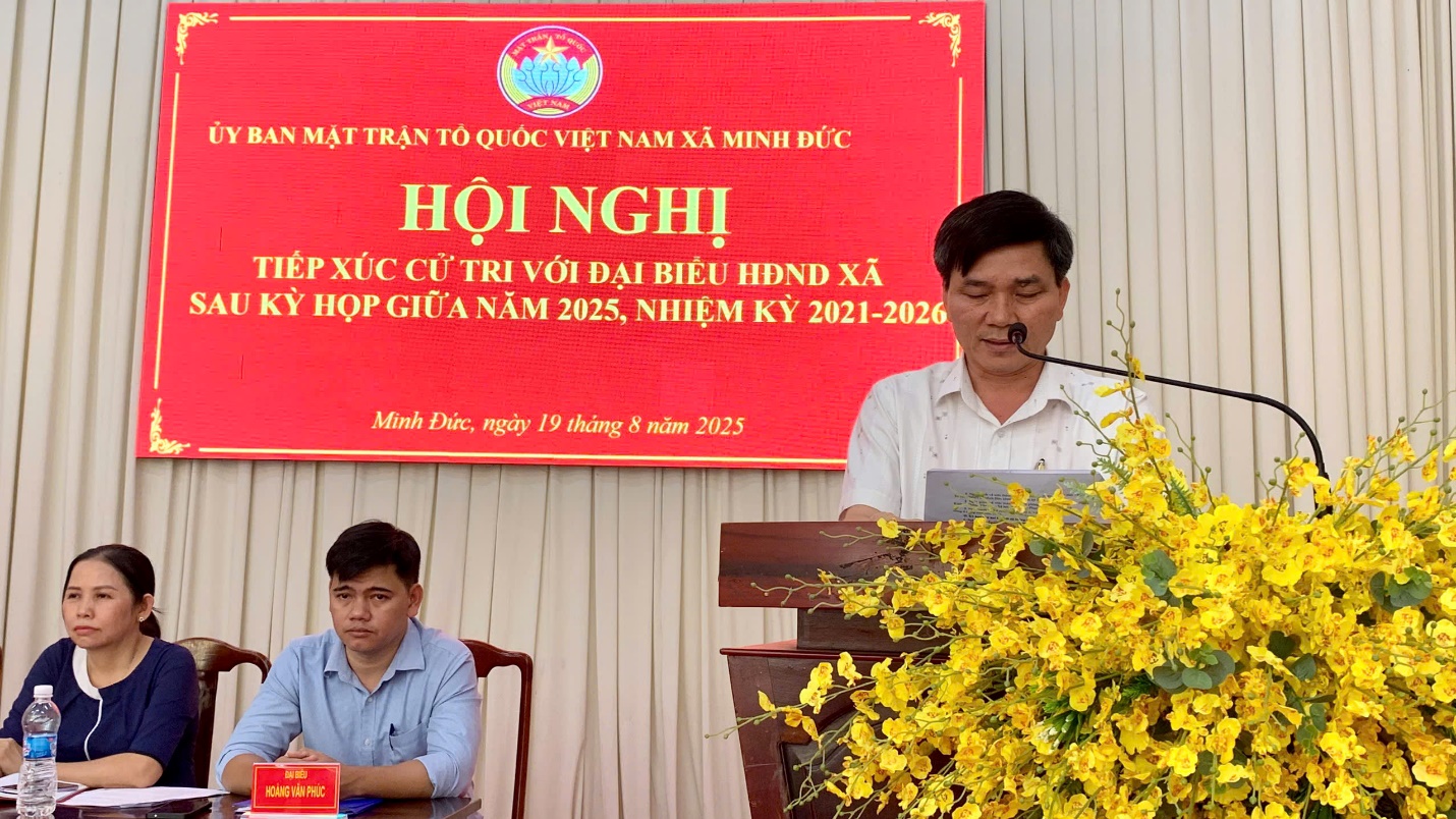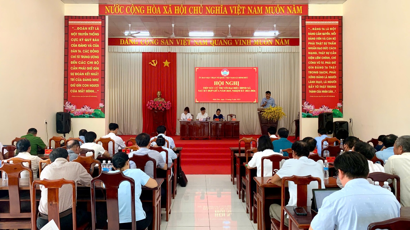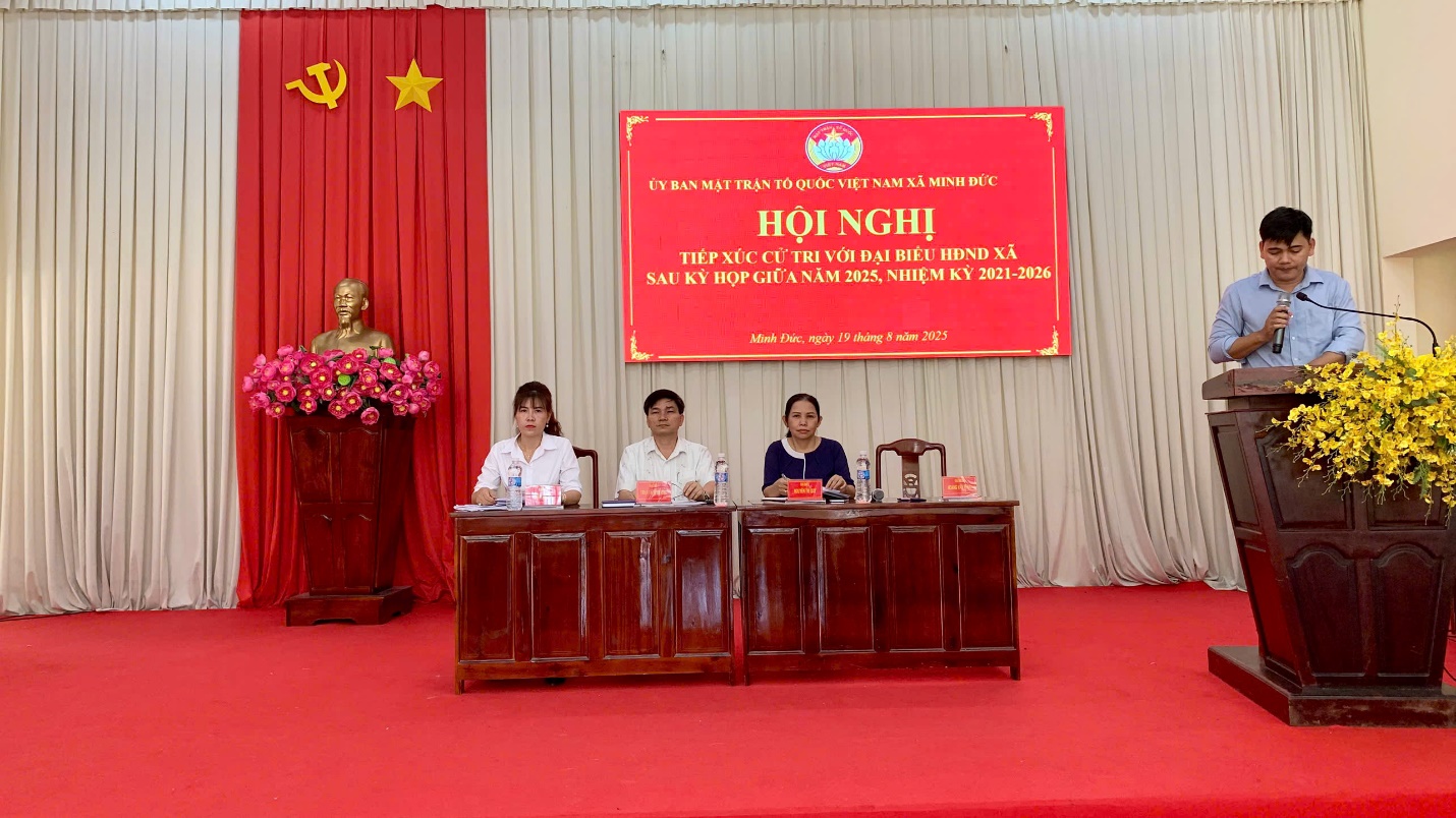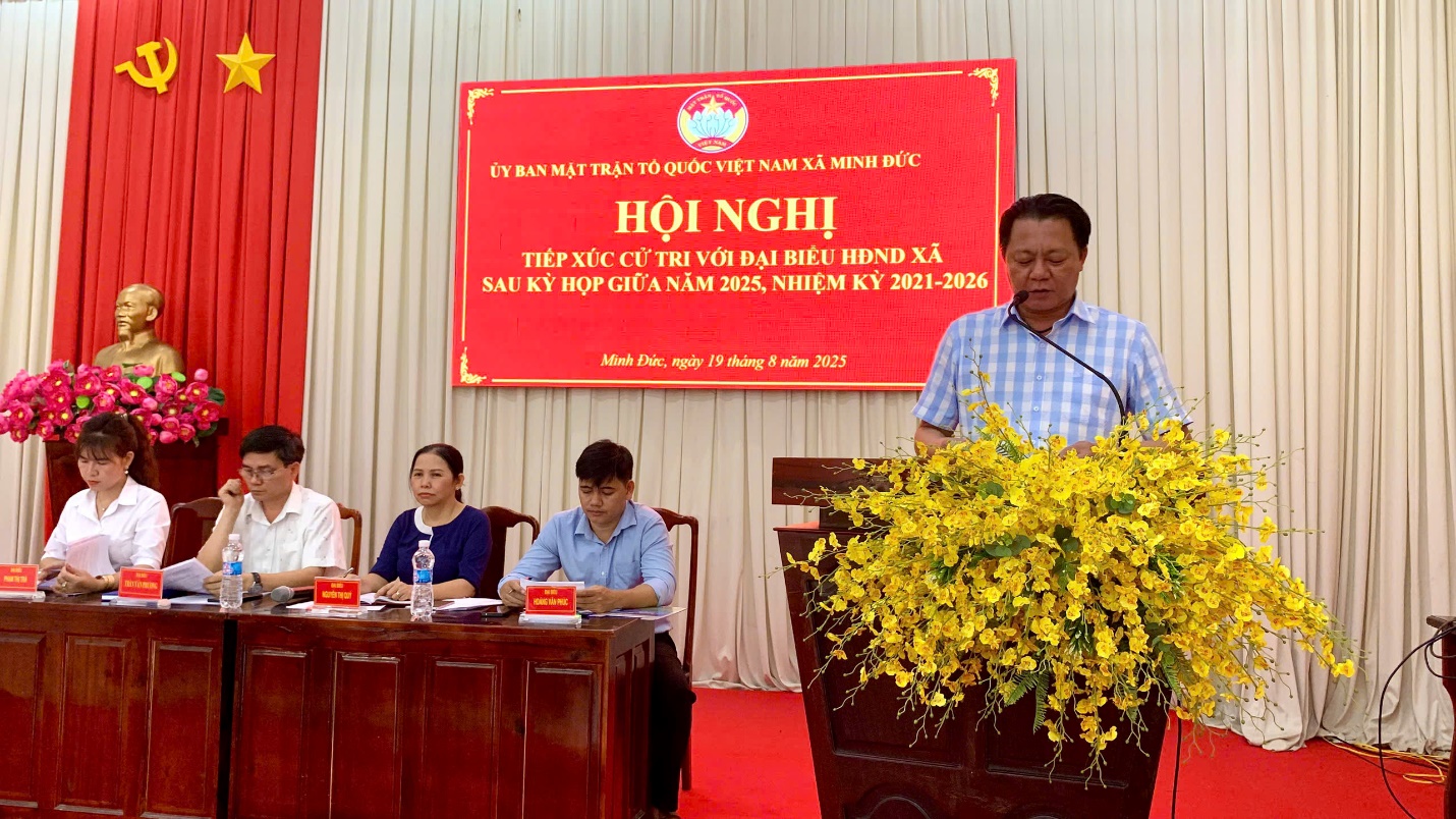Chiều ngày 19/8/2025, tại Hội trường Ủy ban nhân dân xã Minh Đức, Ủy ban Mặt trận Tổ quốc Việt Nam xã Minh Đức phối hợp với Thường trực Hội đồng nhân dân xã tổ chức hội nghị tiếp xúc cử tri của Tổ đại biểu số 3 và Tổ đại biểu số 4 Hội đồng nhân dân xã đối với cử tri các ấp, sóc gồm: ấp 1, ấp 2, ấp 3, ấp 4, sóc 5, sóc 6 và sóc Vàng.