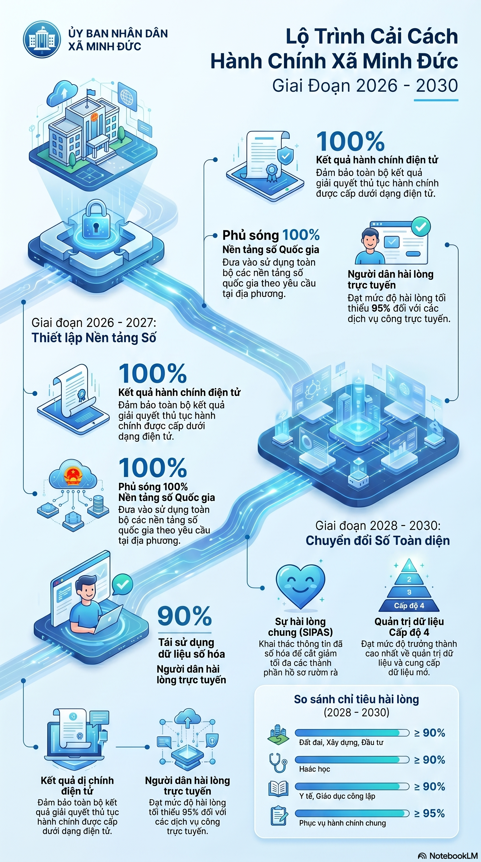 <p style="text-align:justify;">Cải cách hành chính là một trong những nhiệm vụ trọng tâm, xuyên suốt nhằm xây dựng nền hành chính hiện đại, chuyên nghiệp, phục vụ Nhân dân ngày càng tốt hơn. Thực hiện chỉ đạo của cấp trên, Ủy ban nhân dân xã Minh Đức đã ban hành Kế hoạch cải cách hành chính trọng tâm giai đoạn 2026–2030 với nhiều mục tiêu, nhiệm vụ và giải pháp cụ thể, thiết thực.</p><p style="text-align:justify;">Theo Kế hoạch, xã xác định rõ quan điểm lấy người dân, doanh nghiệp làm trung tâm phục vụ; lấy mức độ hài lòng của người dân làm thước đo đánh giá chất lượng hoạt động của bộ máy hành chính. Đây không chỉ là yêu cầu mà còn là cam kết mạnh mẽ của chính quyền địa phương trong việc nâng cao hiệu lực, hiệu quả quản lý nhà nước, góp phần thúc đẩy phát triển kinh tế – xã hội bền vững.</p><p style="text-align:justify;">Trong giai đoạn 2026–2030, xã Minh Đức tập trung thực hiện đồng bộ các nội dung cải cách, trọng tâm là cải cách thể chế, cải cách thủ tục hành chính, tổ chức bộ máy, chế độ công vụ, tài chính công và xây dựng chính quyền số. Đặc biệt, việc đẩy mạnh ứng dụng công nghệ thông tin, chuyển đổi số được xác định là khâu đột phá nhằm nâng cao chất lượng phục vụ và tạo thuận lợi tối đa cho người dân, doanh nghiệp trong giải quyết thủ tục hành chính.</p><p style="text-align:justify;">Nhiều chỉ tiêu cụ thể đã được đề ra như: 100% thủ tục hành chính đủ điều kiện được cung cấp trực tuyến; 100% kết quả giải quyết thủ tục hành chính được cấp dưới dạng điện tử; tối thiểu 95% người dân, doanh nghiệp hài lòng với dịch vụ công; tăng tỷ lệ thanh toán trực tuyến và khai thác hiệu quả dữ liệu số trong giải quyết công việc. Những mục tiêu này thể hiện quyết tâm xây dựng nền hành chính công khai, minh bạch, hiện đại và thân thiện.</p><figure class="image"><img style="aspect-ratio:1536/2752;" src="https://minhduc.dongnai.gov.vn/uploads/minhduc/news/thuhuong/2026/04/16/unnamed-1.png" width="1536" height="2752" /></figure><p style="text-align:justify;">Bên cạnh đó, xã cũng chú trọng xây dựng đội ngũ cán bộ, công chức có phẩm chất, năng lực, uy tín; tăng cường kỷ luật, kỷ cương hành chính; nâng cao trách nhiệm của người đứng đầu. Đồng thời, đẩy mạnh phân cấp, phân quyền gắn với kiểm soát chặt chẽ, bảo đảm hoạt động thông suốt, hiệu quả, không chồng chéo.</p><p style="text-align:justify;">Để Kế hoạch cải cách hành chính đạt hiệu quả cao, cần có sự vào cuộc đồng bộ của cả hệ thống chính trị và sự tham gia tích cực của người dân, doanh nghiệp. Mỗi tổ chức, cá nhân cần chủ động tìm hiểu, thực hiện các thủ tục hành chính theo quy định; tích cực sử dụng dịch vụ công trực tuyến; đồng thời phản ánh, góp ý để cơ quan nhà nước kịp thời điều chỉnh, hoàn thiện.</p><p style="text-align:justify;">Cải cách hành chính không chỉ là nhiệm vụ của cơ quan nhà nước mà còn là trách nhiệm chung của toàn xã hội. Với quyết tâm cao và sự đồng lòng của Nhân dân, xã Minh Đức tin tưởng sẽ xây dựng được nền hành chính hiện đại, minh bạch, phục vụ ngày càng tốt hơn, góp phần nâng cao chất lượng cuộc sống của người dân trong giai đoạn mới.</p>