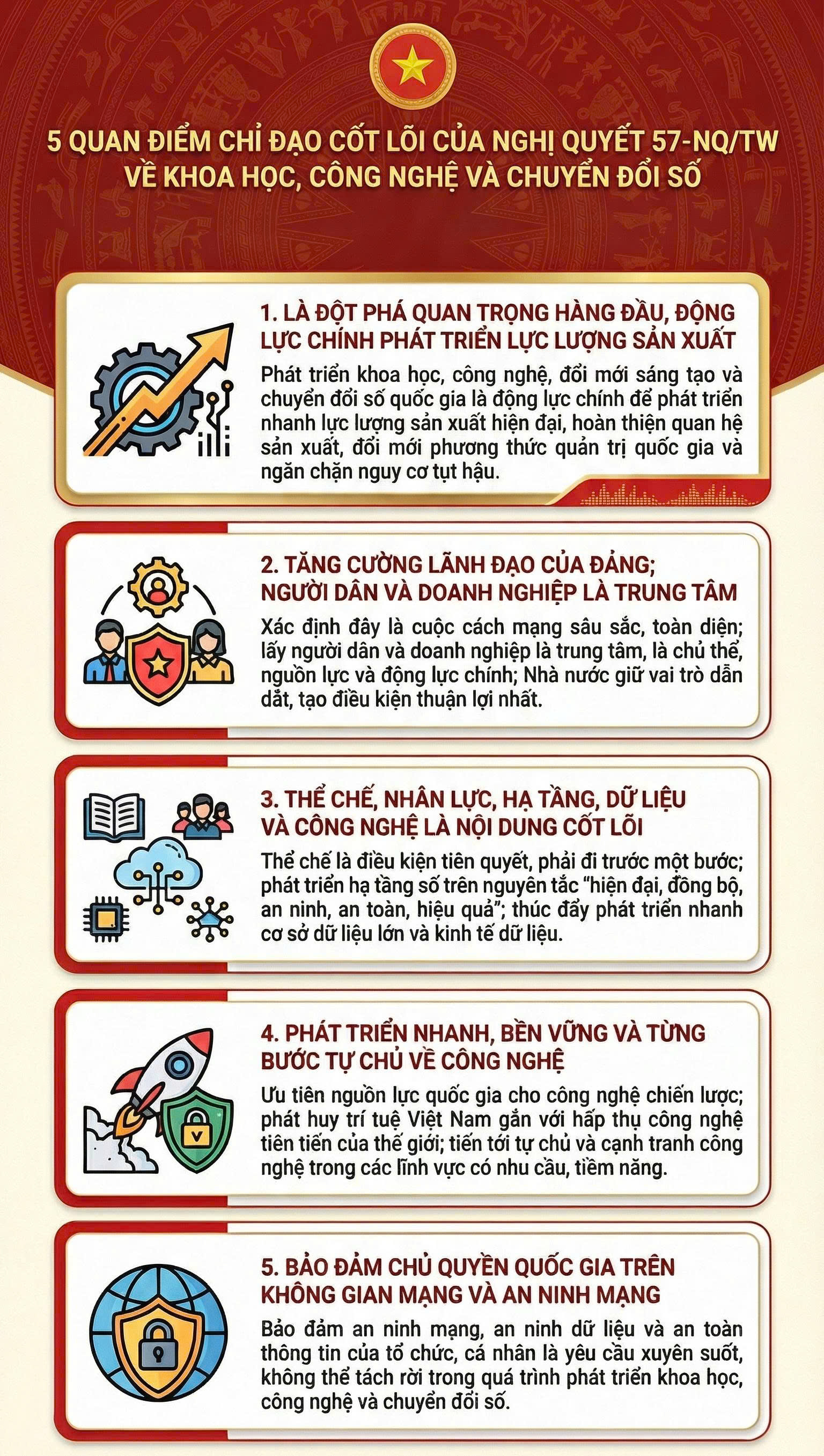 <figure class="image"><img style="aspect-ratio:768/1256;" src="https://minhduc.dongnai.gov.vn/uploads/minhduc/news/thuhuong/2026/04/02/1_1.jpg" width="768" height="1256" /></figure><p style="text-align:justify;">Nghị quyết 57-NQ/TW của Trung ương Đảng là một dấu mốc quan trọng, thể hiện quyết tâm mạnh mẽ trong việc thúc đẩy phát triển khoa học, công nghệ, đổi mới sáng tạo và chuyển đổi số quốc gia. Đây không chỉ là yêu cầu tất yếu trong bối cảnh cuộc Cách mạng công nghiệp lần thứ tư, mà còn là động lực then chốt để nâng cao năng suất lao động, chất lượng tăng trưởng và năng lực cạnh tranh của đất nước.</p><p style="text-align:justify;">Nghị quyết xác định rõ 5 quan điểm chỉ đạo cốt lõi. Trước hết, phát triển khoa học, công nghệ, đổi mới sáng tạo và chuyển đổi số là đột phá quan trọng hàng đầu, là động lực chính để phát triển lực lượng sản xuất hiện đại. Đồng thời, cần tăng cường vai trò lãnh đạo của Đảng, đặt người dân và doanh nghiệp vào vị trí trung tâm, là chủ thể của quá trình phát triển. Bên cạnh đó, thể chế, nhân lực, hạ tầng và dữ liệu được xác định là những yếu tố nền tảng, có ý nghĩa quyết định. Phát triển phải đi đôi với bền vững, từng bước làm chủ công nghệ, đồng thời bảo đảm vững chắc chủ quyền quốc gia trên không gian mạng và an ninh dữ liệu.</p><figure class="image"><img style="aspect-ratio:1536/2714;" src="https://minhduc.dongnai.gov.vn/uploads/minhduc/news/thuhuong/2026/04/02/2_1.jpg" width="1536" height="2714" /></figure><p style="text-align:justify;">Để hiện thực hóa các mục tiêu đề ra, Nghị quyết nhấn mạnh 7 nhóm nhiệm vụ và giải pháp trọng tâm. Trong đó, nổi bật là yêu cầu đổi mới tư duy, nâng cao nhận thức và trách nhiệm của người đứng đầu; hoàn thiện thể chế, chấp nhận rủi ro có kiểm soát trong nghiên cứu khoa học; phát triển hạ tầng số hiện đại như 5G, 6G, trí tuệ nhân tạo (AI), điện toán đám mây và Internet vạn vật (IoT). Đồng thời, chú trọng đào tạo nguồn nhân lực chất lượng cao trong các ngành then chốt như bán dẫn và AI, đẩy mạnh chuyển đổi số toàn diện trong hệ thống chính trị, xây dựng chính phủ số, kinh tế số và xã hội số.</p><figure class="image"><img style="aspect-ratio:768/1355;" src="https://minhduc.dongnai.gov.vn/uploads/minhduc/news/thuhuong/2026/04/02/3_1.jpg" width="768" height="1355" /></figure><p style="text-align:justify;">Nghị quyết cũng đặt ra những mục tiêu cụ thể đến năm 2030: đóng góp của năng suất các yếu tố tổng hợp (TFP) vào tăng trưởng kinh tế đạt trên 55%; tỷ trọng kinh tế số đạt khoảng 30% GDP; chi cho nghiên cứu và phát triển (R&amp;D) đạt tối thiểu 2% GDP. Việt Nam phấn đấu thuộc nhóm 3 nước dẫn đầu Đông Nam Á và nhóm 50 quốc gia hàng đầu thế giới về năng lực cạnh tranh và đổi mới sáng tạo.</p><p style="text-align:justify;">Tầm nhìn đến năm 2045, kinh tế số sẽ chiếm ít nhất 50% GDP, và Việt Nam trở thành một trong 30 quốc gia dẫn đầu thế giới về đổi mới sáng tạo. Đây là mục tiêu lớn, đòi hỏi sự vào cuộc đồng bộ của cả hệ thống chính trị, cộng đồng doanh nghiệp và toàn thể nhân dân.</p><figure class="image"><img style="aspect-ratio:768/1250;" src="https://minhduc.dongnai.gov.vn/uploads/minhduc/news/thuhuong/2026/04/02/4_1.jpg" width="768" height="1250" /></figure><p style="text-align:justify;">Có thể khẳng định, Nghị quyết 57-NQ/TW là kim chỉ nam quan trọng, tạo động lực mạnh mẽ để đất nước bứt phá, phát triển nhanh và bền vững. Mỗi cán bộ, đảng viên và người dân cần nâng cao nhận thức, chủ động học tập, ứng dụng khoa học công nghệ và tích cực tham gia chuyển đổi số, góp phần xây dựng một Việt Nam hiện đại, thịnh vượng trong tương lai.</p>