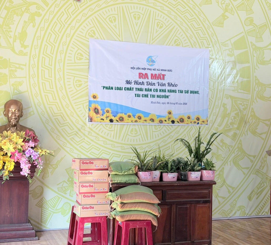 <p style="text-align:justify;"><span class="text-big">Chiều ngày 26/3/2026, tại Nhà văn hóa ấp An Tân, Hội Liên hiệp Phụ nữ xã Minh Đức tổ chức lễ ra mắt mô hình “Dân vận khéo” phân loại chất thải rắn có khả năng tái sử dụng, tái chế tại nguồn.</span></p><p style="text-align:justify;"><span class="text-big">Tham dự buổi lễ có đ/c Phạm Thị Trà – ĐUV, PCT UBMTTQ Việt Nam, Chủ tịch Hội LHPN xã; đ/c Cao Thanh Nhàn – Bí thư Chi bộ kiêm Trưởng ấp; đ/c Lương Thị Tơ – Phó Bí thư Chi bộ, Trưởng Ban Công tác Mặt trận ấp An Tân; cùng các chị trong Ban Chấp hành Hội Phụ nữ xã, Chi hội PN Công An, đại diện các chi hội bạn và hội viên, phụ nữ ấp An Tân.</span></p><p style="text-align:justify;"><span class="text-big">Mở đầu chương trình là các tiết mục văn nghệ đặc sắc do Câu lạc bộ văn nghệ Chi hội Phụ nữ ấp An Tân biểu diễn, tạo không khí sôi nổi, phấn khởi. Tại buổi lễ, Ban Tổ chức đã thông qua quyết định thành lập mô hình, quy chế hoạt động, đăng ký cam kết và nêu rõ ý nghĩa thiết thực của mô hình trong việc nâng cao ý thức bảo vệ môi trường, xây dựng nếp sống văn minh, góp phần thực hiện hiệu quả cuộc vận động xây dựng gia đình “5 không, 3 sạch, 3 an”.</span></p><p style="text-align:justify;"><span class="text-big">Dịp này, Hội LHPN xã đã trao tặng 05 phần quà trị giá 1.500.000đ cho hội viên phụ nữ có hoàn cảnh khó khăn trên địa bàn, thể hiện tinh thần sẻ chia, tương thân tương ái.</span></p><p style="text-align:justify;"><span class="text-big">Đặc biệt, chương trình có phần giao lưu ý nghĩa với Chi hội bạn. Chị Hồng Diệu – CHT Chi hội PN Ấp Sóc Rul đã giới thiệu và tặng những sản phẩm sáng tạo từ vật dụng tái chế như các chậu hoa đẹp mắt, góp phần tạo không gian xanh – sạch – đẹp, truyền cảm hứng cho hội viên phụ nữ trong việc tận dụng rác thải tái chế.</span></p><p style="text-align:justify;"><span class="text-big">Sau buổi lễ, chị em phụ nữ tích cực hưởng ứng bằng việc thu gom rác thải tái chế đưa về “Ngôi nhà xanh”. Số tiền thu được từ việc bán rác thải sẽ được sử dụng để thăm hỏi, tặng quà cho phụ nữ khó khăn và trẻ em nghèo hiếu học tại địa phương.</span></p><p style="text-align:justify;"><span class="text-big">Mô hình “Dân vận khéo” phân loại chất thải rắn tại nguồn là hoạt động thiết thực, ý nghĩa, góp phần nâng cao nhận thức cộng đồng trong bảo vệ môi trường. Hội LHPN xã Minh Đức kêu gọi toàn thể hội viên, phụ nữ tích cực tham gia, chung tay lan tỏa và nhân rộng mô hình trong thời gian tới.</span></p><figure class="image"><img style="aspect-ratio:1030/930;" src="https://minhduc.dongnai.gov.vn/uploads/minhduc/news/duc-hoang/657384517_1544693670999182_1096415381707936287_n.jpg" width="1030" height="930" /></figure><figure class="image"><img style="aspect-ratio:1280/960;" src="https://minhduc.dongnai.gov.vn/uploads/minhduc/news/duc-hoang/660308989_1544693597665856_8144593352367765033_n.jpg" width="1280" height="960" /></figure><figure class="image"><img style="aspect-ratio:1796/1148;" src="https://minhduc.dongnai.gov.vn/uploads/minhduc/news/duc-hoang/658993456_1544693554332527_4337775709198622305_n.jpg" width="1796" height="1148" /></figure><figure class="image"><img style="aspect-ratio:2040/1148;" src="https://minhduc.dongnai.gov.vn/uploads/minhduc/news/duc-hoang/656182843_1544693784332504_1450612261772218023_n.jpg" width="2040" height="1148" /></figure><figure class="image"><img style="aspect-ratio:1794/1968;" src="https://minhduc.dongnai.gov.vn/uploads/minhduc/news/duc-hoang/656882333_1544693747665841_4967596096463991912_n.jpg" width="1794" height="1968" /></figure><figure class="image"><img style="aspect-ratio:1280/960;" src="https://minhduc.dongnai.gov.vn/uploads/minhduc/news/duc-hoang/659115285_1544693444332538_588497256103325566_n.jpg" width="1280" height="960" /></figure><figure class="image"><img style="aspect-ratio:1280/960;" src="https://minhduc.dongnai.gov.vn/uploads/minhduc/news/duc-hoang/656872118_1544693397665876_2279802910177589817_n.jpg" width="1280" height="960" /></figure><figure class="image"><img style="aspect-ratio:1920/1945;" src="https://minhduc.dongnai.gov.vn/uploads/minhduc/news/duc-hoang/658963424_1544693714332511_908833651807114535_n.jpg" width="1920" height="1945" /></figure><figure class="image"><img style="aspect-ratio:1656/1136;" src="https://minhduc.dongnai.gov.vn/uploads/minhduc/news/duc-hoang/657405499_1544693324332550_5673793413785209511_n.jpg" width="1656" height="1136" /></figure><figure class="image"><img style="aspect-ratio:949/1128;" src="https://minhduc.dongnai.gov.vn/uploads/minhduc/news/duc-hoang/657226044_1544693287665887_5937996261620029914_n.jpg" width="949" height="1128" /></figure><figure class="image"><img style="aspect-ratio:960/1280;" src="https://minhduc.dongnai.gov.vn/uploads/minhduc/news/duc-hoang/657247922_1544693244332558_4460282992882862169_n.jpg" width="960" height="1280" /></figure><figure class="image"><img style="aspect-ratio:1280/960;" src="https://minhduc.dongnai.gov.vn/uploads/minhduc/news/duc-hoang/658159374_1544693200999229_3840858309023508159_n.jpg" width="1280" height="960" /></figure><figure class="image"><img style="aspect-ratio:1070/928;" src="https://minhduc.dongnai.gov.vn/uploads/minhduc/news/duc-hoang/657670438_1544693164332566_461989417639811625_n.jpg" width="1070" height="928" /></figure><figure class="image"><img style="aspect-ratio:1267/889;" src="https://minhdu
