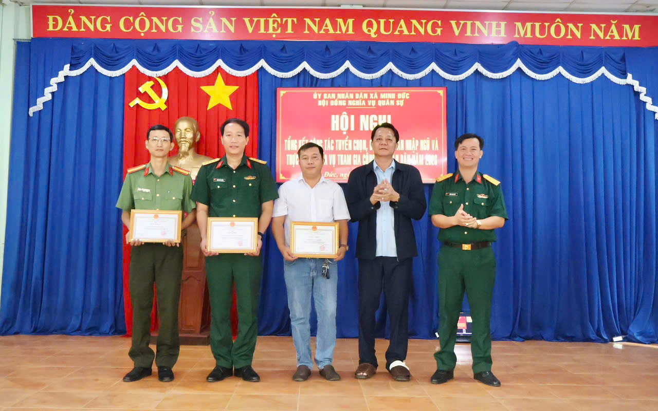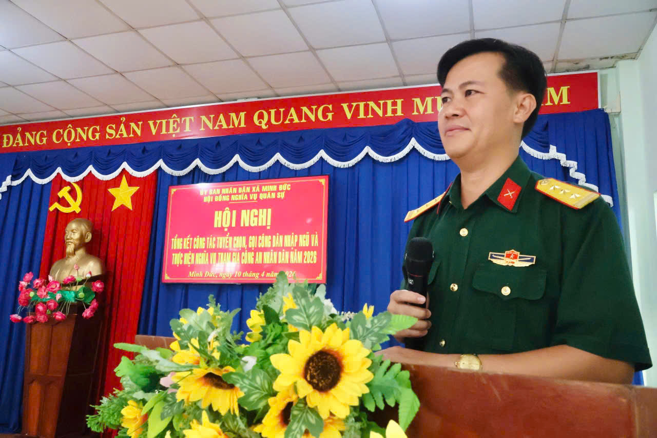 <p style="text-align:justify;"><span class="text-big">Sáng ngày 10/4/2026, UBND xã Minh Đức, Hội đồng Nghĩa vụ quân sự xã tổ chức Hội nghị tổng kết công tác tuyển chọn, gọi công dân nhập ngũ, thực hiện nghĩa vụ tham gia Công an nhân dân và tổ chức Hội trại tòng quân năm 2026; đồng thời triển khai phương hướng, nhiệm vụ năm 2027.</span></p><p style="text-align:justify;"><span class="text-big">Dự Hội nghị có đồng chí Thượng tá Trần Thanh Lâm – Phó Chính ủy, Ban Chỉ huy PTKV4 Bình Long, đồng chí Huỳnh Văn Minh – Phó Bí thư Đảng ủy, Chủ tịch UBND, Chủ tịch Hội đồng Nghĩa vụ quân sự xã; cùng các thành viên Hội đồng Nghĩa vụ quân sự xã; lãnh đạo các ban, ngành, đoàn thể cùng Bí thư Chi bộ, Trưởng ấp, sóc trên địa bàn.</span></p><p style="text-align:justify;"><span class="text-big">Theo báo cáo tại hội nghị, năm 2026 công tác tuyển chọn, gọi công dân nhập ngũ và thực hiện nghĩa vụ tham gia Công an nhân dân được cấp ủy, chính quyền địa phương quan tâm lãnh đạo, chỉ đạo chặt chẽ. Hội đồng Nghĩa vụ quân sự xã đã triển khai đồng bộ, đúng quy trình các bước từ đăng ký, quản lý nguồn; xét duyệt chính trị, chính sách; sơ tuyển, khám tuyển sức khỏe đến bình cử công khai và phát lệnh gọi nhập ngũ, bảo đảm công khai, dân chủ, đúng quy định. Công tác tuyên truyền Luật Nghĩa vụ quân sự, Luật Công an nhân dân được đẩy mạnh với nhiều hình thức phong phú, góp phần nâng cao nhận thức của nhân dân, nhất là thanh niên trong độ tuổi sẵn sàng nhập ngũ. Đồng thời, các hoạt động thăm hỏi, tặng quà, tổ chức Hội trại tòng quân được thực hiện chu đáo, tạo khí thế phấn khởi cho thanh niên lên đường làm nhiệm vụ.</span></p><p style="text-align:justify;"><span class="text-big" style="background-color:white;color:rgb(33,37,41);">Nhờ sự vào cuộc quyết liệt của cả hệ thống chính trị, xã Minh Đức đã hoàn thành 100% chỉ tiêu giao quân năm 2026 với tổng số 30 công dân ưu tú lên đường nhập ngũ (trong đó có 22 công dân thực hiện nghĩa vụ Quân sự và 08 công dân thực hiện nghĩa vụ Công an nhân dân). Quá trình giao, nhận quân diễn ra nhanh gọn và bảo đảm an toàn tuyệt đối về mọi mặt.</span></p><p style="text-align:justify;"><span class="text-big">Bên cạnh những kết quả đạt được, hội nghị cũng thẳng thắn chỉ ra một số hạn chế như công tác quản lý nguồn thanh niên có thời điểm chưa chặt chẽ, nhất là đối tượng đi làm ăn xa; công tác tuyên truyền ở một số khu vực còn khó khăn; việc bảo đảm kinh phí có lúc chưa kịp thời. Triển khai nhiệm vụ năm 2027, Hội đồng Nghĩa vụ quân sự xã xác định tiếp tục nâng cao chất lượng công tác tuyển quân; đẩy mạnh tuyên truyền pháp luật; quản lý chặt chẽ nguồn công dân trong độ tuổi; thực hiện nghiêm quy trình tuyển chọn, khám tuyển; tăng cường phối hợp giữa các lực lượng; làm tốt chính sách hậu phương quân đội, phấn đấu hoàn thành 100% chỉ tiêu giao quân với chất lượng cao.&nbsp;</span></p><p style="text-align:justify;"><span class="text-big">Tại hội nghị, các đại biểu đã tập trung thảo luận, phân tích những kết quả đạt được, chỉ ra nguyên nhân tồn tại, rút ra bài học kinh nghiệm nhằm nâng cao hiệu quả công tác tuyển quân trong thời gian tới.</span></p><p style="text-align:justify;"><span class="text-big">Phát biểu chỉ đạo tại hội nghị, <strong>đồng chí Thượng tá Trần Thanh Lâm – Phó Chính ủy, Ban Chỉ huy PTKV4 Bình Long</strong> yêu cầu cấp ủy, chính quyền địa phương và Hội đồng Nghĩa vụ quân sự xã tiếp tục tăng cường lãnh đạo, chỉ đạo thực hiện tốt công tác tuyển chọn, gọi công dân nhập ngũ. Đồng chí nhấn mạnh cần quán triệt, triển khai nghiêm túc các chủ trương của Đảng, chính sách, pháp luật của Nhà nước, quy định của Quân đội và Công an về công tác tuyển quân; đồng thời chú trọng làm tốt công tác tạo nguồn, xây dựng lực lượng dự bị động viên vững mạnh. Bên cạnh đó, cần đẩy mạnh công tác tuyên truyền, nâng cao nhận thức, trách nhiệm của cán bộ, đảng viên và Nhân dân, nhất là thanh niên trong độ tuổi sẵn sàng nhập ngũ, góp phần hoàn thành tốt nhiệm vụ được giao.</span></p><p style="text-align:justify;"><span class="text-big">Phát biểu kết luận hội nghị, đồng chí Huỳnh Văn Minh – Phó Bí thư Đảng ủy, Chủ tịch UBND, Chủ tịch Hội đồng Nghĩa vụ quân sự xã ghi nhận và đánh giá cao sự vào cuộc tích cực, trách nhiệm của các ban, ngành, đoàn thể, cơ quan, đơn vị và các thành viên Hội đồng NVQS xã trong công tác tuyển quân thời gian qua.Để tiếp tục nâng cao chất lượng công tác tuyển chọn, gọi công dân nhập ngũ và tổ chức Hội trại tòng quân năm 2027 và những năm tiếp theo, đồng chí yêu cầu cần tăng cường vai trò lãnh đạo, chỉ đạo của cấp ủy, chính quyền; rà soát, quản lý chặt chẽ nguồn công dân trong độ tuổi sẵn sàng nhập ngũ; nâng cao chất lượng từng khâu trong quy trình tuyển chọn, bảo đảm đúng quy định, cô
