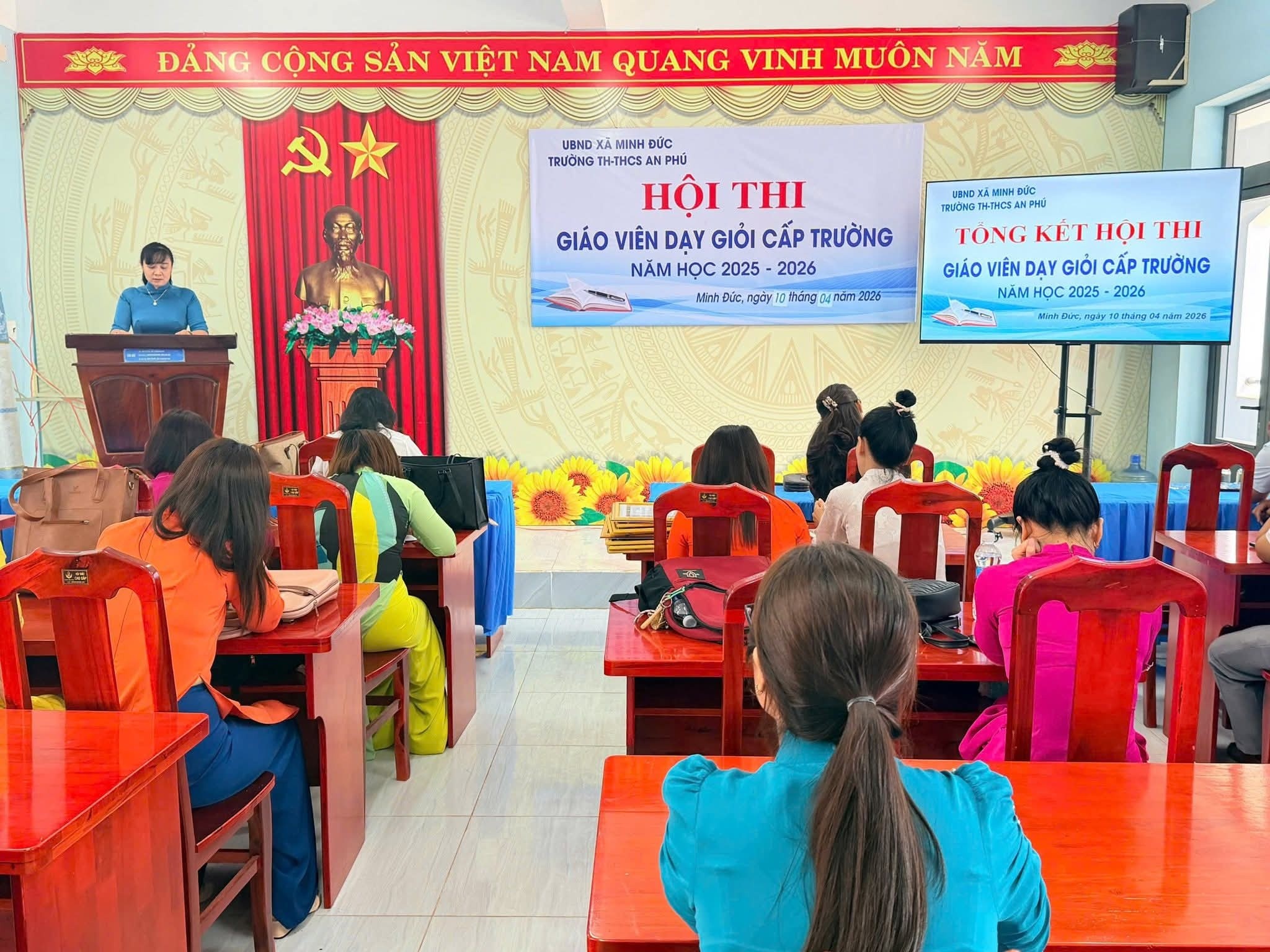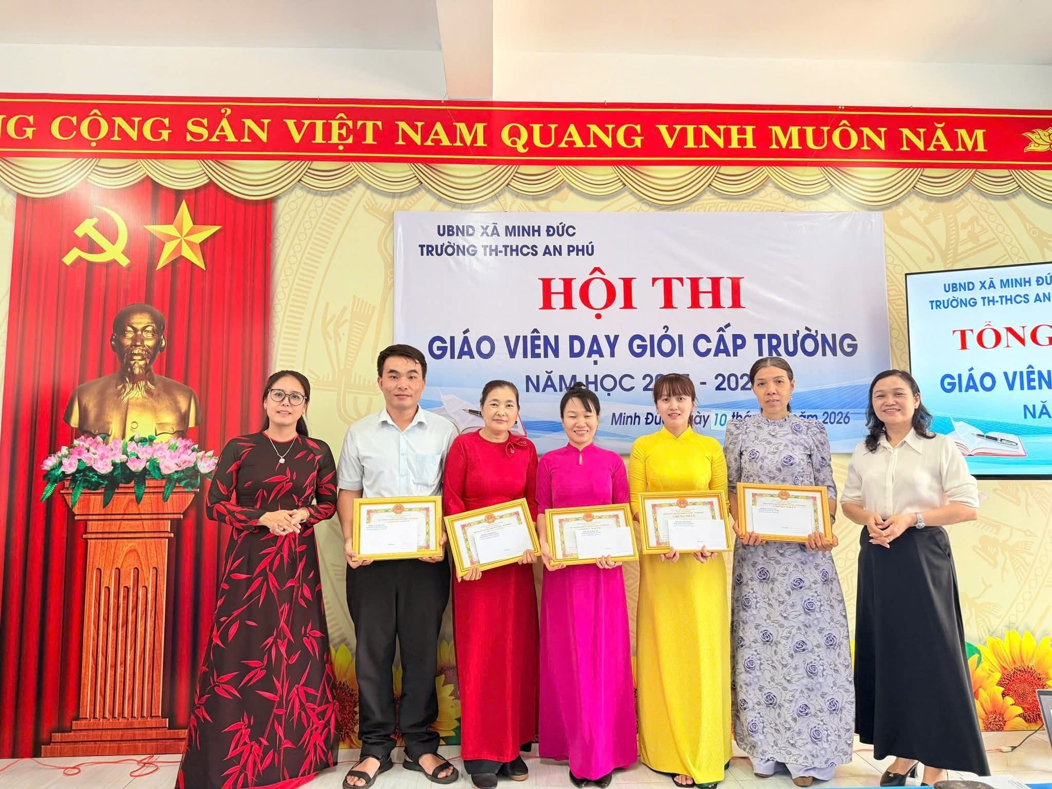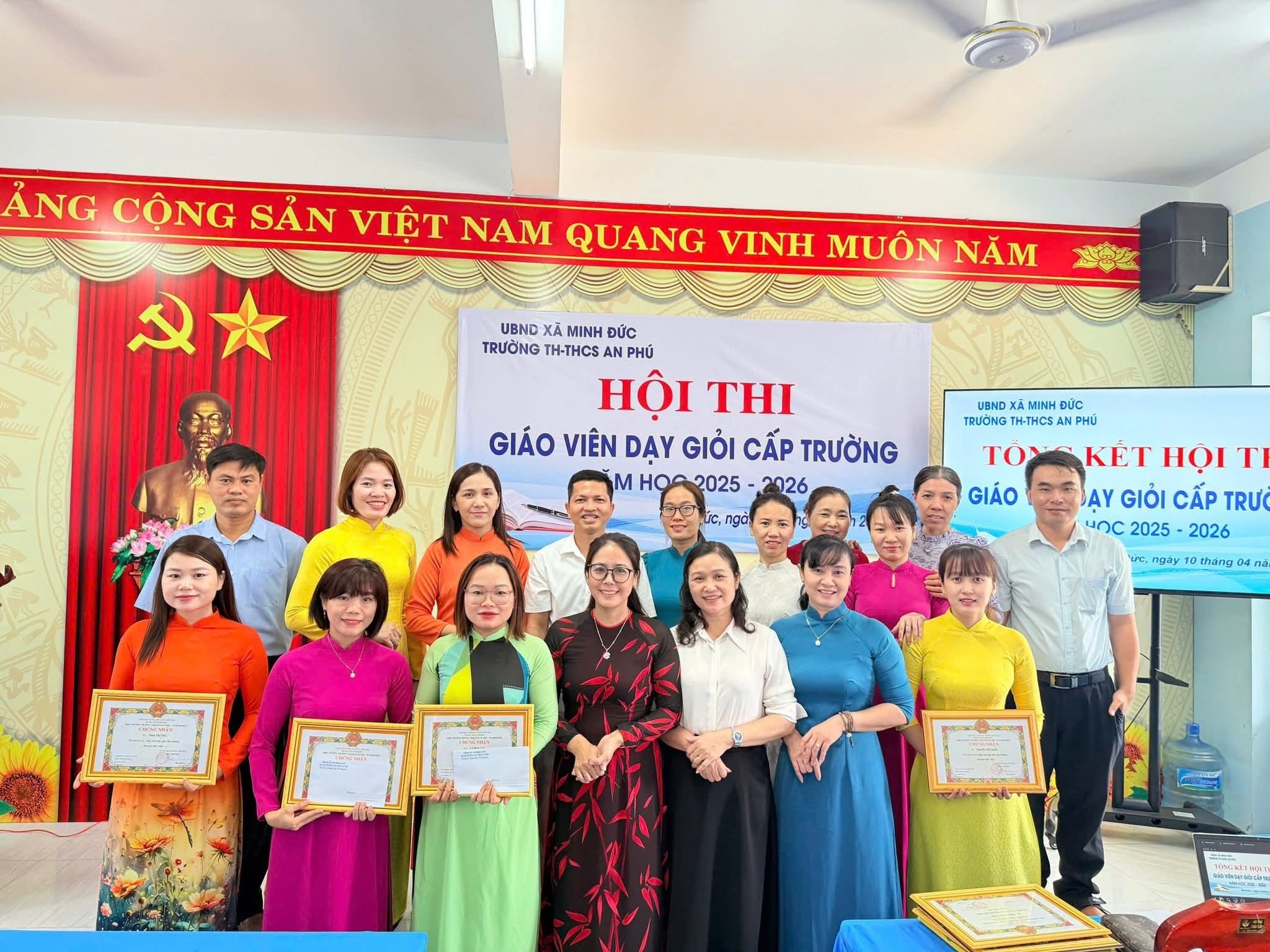 <p style="text-align:justify;"><span class="text-big">Ngày 10/4/2026, Hội thi Giáo viên dạy giỏi cấp trường của Trường TH &amp; THCS An Phú đã khép lại sau những ngày làm việc nghiêm túc, trách nhiệm và đầy cảm hứng. Không đơn thuần là một hội thi chuyên môn, đây thực sự là hành trình lan tỏa tâm huyết, trí tuệ và khát vọng đổi mới của đội ngũ nhà giáo trong sự nghiệp “trồng người”.</span></p><p style="text-align:justify;"><span class="text-big">Tham dự buổi tổng kết có cô Đào Thị Nữ – Bí thư Chi bộ, Hiệu trưởng nhà trường; cô Cù Thị Thoa – Phó Bí thư Chi bộ, Phó Hiệu trưởng; cô Vũ Thị Lợi – Phó Hiệu trưởng, cùng toàn thể cán bộ, giáo viên nhà trường.</span></p><p style="text-align:justify;"><span class="text-big">Điểm nổi bật của hội thi không chỉ nằm ở những tiết dạy đạt chuẩn, mà còn thể hiện chiều sâu trong tư duy đổi mới giáo dục. Mỗi bài giảng là một sự đầu tư công phu, là kết tinh của tri thức, kinh nghiệm và sự sáng tạo không ngừng. Ở đó, người thầy không còn giữ vai trò truyền thụ một chiều, mà trở thành người truyền cảm hứng, người dẫn dắt để học sinh chủ động chiếm lĩnh tri thức, phát triển tư duy và năng lực cá nhân.</span></p><p style="text-align:justify;"><span class="text-big">Việc ứng dụng công nghệ số, trí tuệ nhân tạo trong giảng dạy đã mở ra những không gian học tập mới – nơi bài học trở nên sinh động, trực quan và gần gũi hơn với thực tiễn. Quan trọng hơn, phía sau mỗi tiết dạy là những bài học về tình yêu thương, sự kiên nhẫn và trách nhiệm – những giá trị cốt lõi làm nên phẩm chất cao đẹp của người thầy.</span></p><p style="text-align:justify;"><span class="text-big">Hội thi cũng là dịp để mỗi giáo viên nhìn lại chính mình, tự soi, tự sửa, không ngừng học hỏi và hoàn thiện. Tinh thần cầu thị, ý thức tự bồi dưỡng, khát vọng vươn lên chính là nền tảng để xây dựng đội ngũ nhà giáo vững vàng về chuyên môn, giàu bản lĩnh nghề nghiệp và sâu sắc về nhân cách.</span></p><p style="text-align:justify;"><span class="text-big">Tại buổi tổng kết, 15 thầy, cô giáo tiêu biểu đã được vinh danh với danh hiệu “Giáo viên dạy giỏi” cấp trường năm học 2025 – 2026. Đây không chỉ là sự ghi nhận xứng đáng mà còn là minh chứng cho tinh thần trách nhiệm, sự tận tụy và niềm đam mê nghề nghiệp luôn cháy sáng trong mỗi người thầy.</span></p><p style="text-align:justify;"><span class="text-big">Hội thi khép lại nhưng dư âm còn đọng lại chính là sự chuyển biến mạnh mẽ trong nhận thức và hành động của đội ngũ giáo viên. Từ những bài giảng hôm nay, sẽ mở ra những đổi thay tích cực trong từng tiết học ngày mai; từ những nỗ lực hôm nay, sẽ góp phần nâng cao chất lượng giáo dục một cách bền vững.</span></p><p style="text-align:justify;"><span class="text-big">Với niềm tin, trách nhiệm và khát vọng cống hiến, tập thể cán bộ, giáo viên Trường TH &amp; THCS An Phú sẽ tiếp tục giữ vững ngọn lửa nghề, không ngừng đổi mới, sáng tạo, xứng đáng là những người “kỹ sư tâm hồn” tận tụy, góp phần đào tạo nên những thế hệ học sinh phát triển toàn diện, đáp ứng yêu cầu của thời đại mới. <img src="https://static.xx.fbcdn.net/images/emoji.php/v9/t9e/1/16/1f4d6.png" alt="📖" width="16" height="16" /></span></p><figure class="image"><img style="aspect-ratio:2048/1536;" src="https://minhduc.dongnai.gov.vn/uploads/minhduc/news/duc-hoang/669569593_1558763086258907_1910192965798816597_n.jpg" width="2048" height="1536" /></figure><figure class="image"><img style="aspect-ratio:2048/1536;" src="https://minhduc.dongnai.gov.vn/uploads/minhduc/news/duc-hoang/668715887_1558763036258912_2479295929127486109_n.jpg" width="2048" height="1536" /></figure><figure class="image"><img style="aspect-ratio:2048/1536;" src="https://minhduc.dongnai.gov.vn/uploads/minhduc/news/duc-hoang/668932379_1558763009592248_6553178657878771329_n.jpg" width="2048" height="1536" /></figure><figure class="image"><img style="aspect-ratio:2048/1536;" src="https://minhduc.dongnai.gov.vn/uploads/minhduc/news/duc-hoang/670715319_1558762999592249_5225375109593870551_n.jpg" width="2048" height="1536" /></figure><figure class="image"><img style="aspect-ratio:2048/1536;" src="https://minhduc.dongnai.gov.vn/uploads/minhduc/news/duc-hoang/668762788_1558762962925586_1183784163339977220_n.jpg" width="2048" height="1536" /></figure><figure class="image"><img style="aspect-ratio:2048/1536;" src="https://minhduc.dongnai.gov.vn/uploads/minhduc/news/duc-hoang/670217975_1558762922925590_5461870170253182507_n.jpg" width="2048" height="1536" /></figure><figure class="image"><img style="aspect-ratio:2048/1536;" src="https://minhduc.dongnai.gov.vn/uploads/minhduc/news/duc-hoang/667815161_1558762896258926_6360913763905120076_n.jpg" width="2048" height="1536" /></figure><figure class="image"><img style="aspect-ratio:2048/1536;" src="https://minhduc.dongnai.gov.vn/uploads/minhduc/news/duc-hoang/668543878_1558762816258934_7443503409664243054_n.jpg" width="2048" height="1536" /></figure><figure class="image"><img style="aspect-ratio:1536/2048;" src="https://minhduc.dongnai.gov.vn/uploads/minhduc/news/duc-hoang/669045030_1558762792925603_1472304752852741104_n.jpg" width="1536" height="2048" /></figure><figure class="image"><img style="aspect-ratio:20