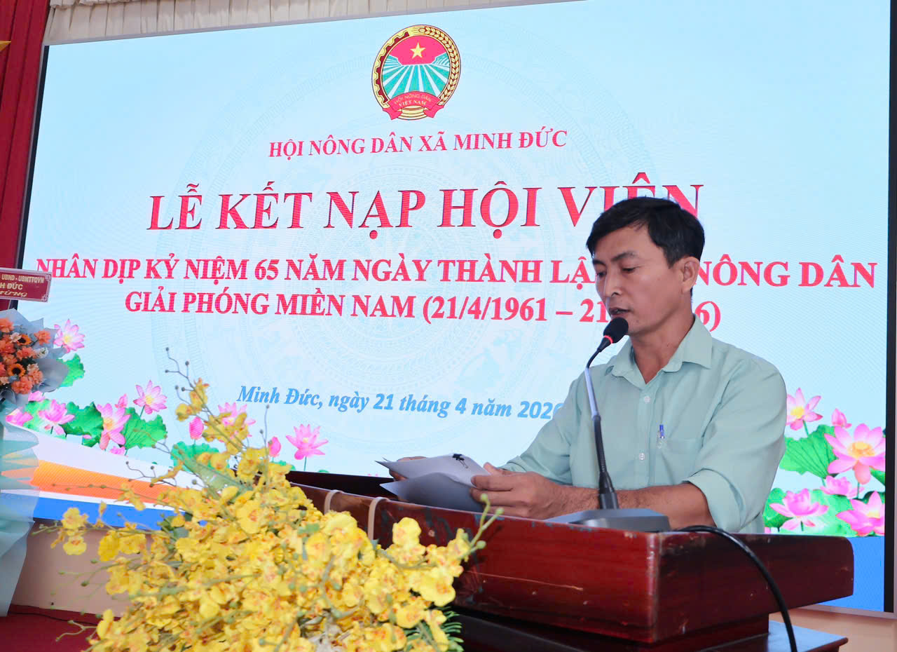 <p style="text-align:justify;"><span style="font-family:&#039;Times New Roman&#039;, Times, serif;font-size:20px;"><span lang="EN-US">Hướng tới kỷ niệm 65 năm Ngày thành lập Hội Nông dân Giải phóng miền Nam (21/4/1961 – 21/4/2026), ngày 21/4/2026, tại Hội trường UBND xã, Ban Chấp hành Hội Nông dân xã Minh Đức đã tổ chức Lễ kết nạp hội viên mới, góp phần củng cố và phát triển tổ chức Hội ngày càng vững mạnh.</span></span></p><figure class="image"><img style="aspect-ratio:1280/916;" src="https://minhduc.dongnai.gov.vn/uploads/minhduc/news/duc-hoang/z7747692028981_608c3c705fa43538d37cbffdd5b8060b.jpg" width="1280" height="916" /></figure><p style="line-height:normal;text-align:justify;"><span style="font-family:&#039;Times New Roman&#039;, Times, serif;font-size:20px;"><span lang="EN-US">Tham dự buổi họp mặt có đồng chí Lưu Quốc Nhật – Phó Bí thư Thường trực Đảng ủy xã; đồng chí Lê Xuân Thắng – UVBTV Đảng ủy, Phó Chủ tịch HĐND xã; đồng chí Mai Ngọc Thoan – ĐUV, Phó Chủ tịch UBMTTQVN, Chủ tịch Hội Nông dân xã; cùng&nbsp;các đồng chí Ủy viên Ban Thường vụ Đảng ủy, Ủy viên Ban Chấp hành Đảng bộ xã; Thường trực&nbsp;Hội đồng nhân dân, Ủy ban nhân dân, Ủy ban Mặt trận tổ quốc Việt Nam xã và đại diện lãnh đạo các phòng, ban chuyên môn và đông đảo hội viên, nông dân tiêu biểu trên địa bàn xã.</span></span></p><figure class="image"><img style="aspect-ratio:1280/970;" src="https://minhduc.dongnai.gov.vn/uploads/minhduc/news/duc-hoang/z7747692458548_42c430e845aab1149f4a71c7e6fd073f.jpg" width="1280" height="970" /></figure><figure class="image"><img style="aspect-ratio:1280/962;" src="https://minhduc.dongnai.gov.vn/uploads/minhduc/news/duc-hoang/z7747692462151_03f664c681c7341d783f76e790dd3fcd.jpg" width="1280" height="962" /></figure><p style="text-align:justify;"><span style="font-family:&#039;Times New Roman&#039;, Times, serif;font-size:20px;"><span lang="EN-US">Tại buổi lễ, Hội Nông dân xã đã công bố quyết định kết nạp 26 hội viên mới. Đây là những cá nhân tiêu biểu, có tinh thần trách nhiệm, tích cực tham gia các phong trào thi đua và hoạt động tại địa phương.</span></span></p><p style="text-align:justify;"><span style="font-family:&#039;Times New Roman&#039;, Times, serif;font-size:20px;"><span lang="EN-US">Phát biểu tại buổi lễ, đồng chí Mai Ngọc Thoan – ĐUV, Phó Chủ tịch UBMTTQVN, Chủ tịch Hội Nông dân xã nhấn mạnh vai trò quan trọng của công tác phát triển hội viên trong giai đoạn hiện nay, đồng thời đề nghị các hội viên mới tiếp tục phát huy tinh thần trách nhiệm, chấp hành tốt chủ trương của Đảng, chính sách, pháp luật của Nhà nước; tích cực tham gia các phong trào thi đua yêu nước, chung tay thực hiện các nhiệm vụ phát triển kinh tế - xã hội tại địa phương.</span></span></p><figure class="image"><img style="aspect-ratio:1280/938;" src="https://minhduc.dongnai.gov.vn/uploads/minhduc/news/duc-hoang/z7747692040112_25ad0d270b37c789755e9cbf9abdc43d.jpg" width="1280" height="938" /></figure><p style="text-align:justify;"><span style="font-family:&#039;Times New Roman&#039;, Times, serif;font-size:20px;"><span lang="EN-US">Tại buổi lễ, đại diện các hội viên mới được kết nạp đã bày tỏ niềm vinh dự khi được đứng vào hàng ngũ của Hội Nông dân xã Minh Đức, đồng thời gửi lời cảm ơn đến Ban Chấp hành Hội đã quan tâm, tạo điều kiện. Các hội viên mới cũng thể hiện quyết tâm sẽ luôn chấp hành tốt chủ trương của Đảng, chính sách, pháp luật của Nhà nước; tích cực tham gia các phong trào thi đua, đẩy mạnh ứng dụng khoa học kỹ thuật vào sản xuất, phát triển kinh tế gia đình; đồng thời tích cực tham gia các hoạt động tại địa phương, góp phần xây dựng nông thôn mới và xây dựng tổ chức Hội ngày càng vững mạnh.</span></span></p><p style="text-align:justify;"><span style="font-family:&#039;Times New Roman&#039;, Times, serif;font-size:20px;"><span lang="EN-US">Lễ kết nạp hội viên mới là hoạt động thiết thực, ý nghĩa, thể hiện sự quan tâm của Hội trong công tác xây dựng, củng cố lực lượng, đồng thời góp phần nâng cao chất lượng, hiệu quả hoạt động của Hội Nông dân xã Minh Đức trong thời gian tới.</span></span></p><figure class="image"><img style="aspect-ratio:1280/930;" src="https://minhduc.dongnai.gov.vn/uploads/minhduc/news/duc-hoang/z7747692029877_347295733cbf7df682532de5d81753fa.jpg" width="1280" height="930" /></figure><figure class="image"><img style="aspect-ratio:1280/854;" src="https://minhduc.dongnai.gov.vn/uploads/minhduc/news/duc-hoang/z7747692036357_9bbb442776f6d4709e46a1fd5843271b.jpg" width="1280" height="854" /></figure><figure class="image"><img style="aspect-ratio:1280/946;" src="https://minhduc.dongnai.gov.vn/uploads/minhduc/news/duc-hoang/z7747692044193_581df0e3d81e978eae54469255ccedeb.jpg" width="1280" height="946" /></figure><figure class="image"><img style="aspect-ratio:1280/790;" src="https://minhduc.dongnai.gov.vn/uploads/minhduc/news/duc-hoang/z7747692050078_69f276fd1ee958144724cbc176c74165.jpg" width="1280" height="790" /></figure>