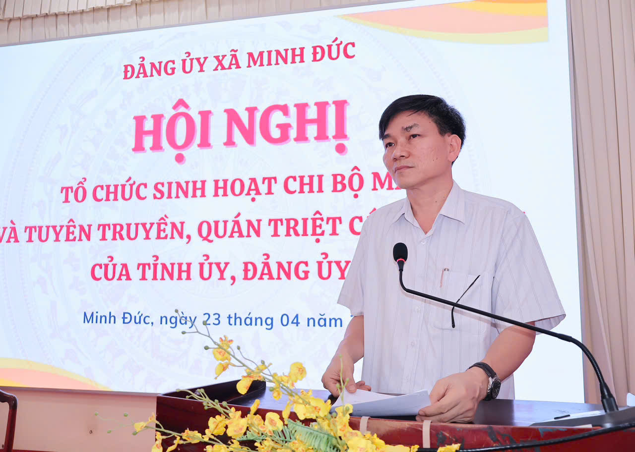 <p style="margin:6.0pt 0cm;text-align:justify;text-indent:36.0pt;"><span style="font-family:&#039;Times New Roman&#039;, Times, serif;font-size:20px;"><span lang="EN-US">Sáng ngày 23/4/2026, tại Hội trường UBND xã, Đảng ủy xã Minh Đức tổ chức hội nghị sinh hoạt chi bộ mẫu kết hợp học tập, quán triệt, tuyên truyền các văn bản của Tỉnh ủy và Đảng ủy xã.</span></span></p><p style="margin:6.0pt 0cm;text-align:justify;text-indent:36.0pt;"><span style="font-family:&#039;Times New Roman&#039;, Times, serif;font-size:20px;"><span lang="EN-US">Tham dự hội nghị có đồng chí Trần Văn Phương – Bí Thư Đảng ủy, Chủ tịch HĐND xã; đồng chí Lưu Quốc Nhật – Phó Bí thư Thường trực Đảng ủy xã; các đồng chí trong </span></span><span style="background-color:white;color:rgb(8,8,9);font-family:&#039;Times New Roman&#039;, Times, serif;font-size:20px;"><span lang="EN-US">Ủy viên Ban Thường vụ Đảng ủy, Ủy viên Ban Chấp hành Đảng bộ xã; các đồng chí Ủy viên UBKT Đảng ủy UBND xã; Bí thư, Phó Bí thư, chi ủy viên, các đồng chí phụ trách công tác kiểm tra của các chi, đảng bộ trực thuộc.</span></span></p><figure class="image"><img style="aspect-ratio:1280/854;" src="https://minhduc.dongnai.gov.vn/uploads/minhduc/news/duc-hoang/z7755595652344_4ada304ce66cd5cc74fe7e3a65447725.jpg" width="1280" height="854" /></figure><p style="text-align:center;"><i>Toàn cảnh hội nghị.</i></p><figure class="image"><img style="aspect-ratio:1280/906;" src="https://minhduc.dongnai.gov.vn/uploads/minhduc/news/duc-hoang/z7755595665430_de0ff59affe690c29464ac588e0bfaa6.jpg" width="1280" height="906" /></figure><p style="text-align:center;"><i>Đồng chí Trần Văn Phương - Bí thư Đảng ủy, Chủ tịch HĐND xã (bên phải), Đồng chí Lưu Quốc Nhật - Phó Bí thư Thường trực Đảng ủy xã (bên trái).</i></p><p style="line-height:normal;margin:6.0pt 0cm;text-align:justify;text-indent:36.0pt;"><span style="font-family:&#039;Times New Roman&#039;, Times, serif;font-size:20px;"><span lang="EN-US">Phát biểu quán triệt, chỉ đạo hội nghị, đồng chí Lưu Quốc Nhật - Phó Bí thư Thường trực Đảng ủy xã khẳng định việc tổ chức sinh hoạt chi bộ mẫu gắn với&nbsp;học tập, quán triệt các văn bản của&nbsp;Đảng có ý nghĩa quan trọng trong nâng cao chất lượng sinh hoạt Đảng ở cơ sở. Đồng chí yêu cầu các chi bộ nghiêm túc tiếp thu, triển khai đầy đủ các nội dung đã được quán triệt; đồng thời nâng cao trách nhiệm của cấp ủy và đảng viên trong đổi mới nội dung, phương thức sinh hoạt, bảo đảm thực hiện đúng các nguyên tắc tổ chức và sinh hoạt Đảng.</span></span></p><figure class="image"><img style="aspect-ratio:1280/944;" src="https://minhduc.dongnai.gov.vn/uploads/minhduc/news/duc-hoang/z7755595681605_aedd4b8b88991755b843afd67ff59708_2.jpg" width="1280" height="944" /></figure><p style="text-align:center;"><i>Đồng chí Lưu Quốc Nhật - Phó Bí thư Thường trực Đảng ủy xã phát biểu quán triệt, chỉ đạo tại hội nghị.</i></p><p style="margin:6.0pt 0cm;text-align:justify;text-indent:36.0pt;"><span style="font-family:&#039;Times New Roman&#039;, Times, serif;font-size:20px;"><span lang="EN-US">Tại hội nghị, các đại biểu đã được nghe các đồng chí Báo cáo viên trình bày những nội dung trọng tâm, cốt lõi của Quy định số 75-QĐ/TU ngày 18/11/2025 của Ban Thường vụ Tỉnh ủy về tiêu chí đánh giá chất lượng, hiệu quả công tác học tập, quán triệt, tuyên truyền các nghị quyết, chỉ thị của Đảng; Quy định số 160-QĐ/TU ngày 25/12/2025 về nâng cao chất lượng sinh hoạt chi bộ và tiêu chí đánh giá chất lượng sinh hoạt chi bộ trong giai đoạn mới; Quyết định số 424-QĐ/TU ngày 09/02/2026 của Tỉnh ủy về quy trình kiểm tra, giám sát, giải quyết tố cáo và thi hành kỷ luật Đảng đối với chi bộ.</span></span></p><figure class="image"><img style="aspect-ratio:1280/854;" src="https://minhduc.dongnai.gov.vn/uploads/minhduc/news/duc-hoang/z7755595692586_1823b9e85fa452a295bacddf7c1caa51_1.jpg" width="1280" height="854" /></figure><p style="margin:6.0pt 0cm;text-align:justify;text-indent:36.0pt;"><span style="font-family:&#039;Times New Roman&#039;, Times, serif;font-size:20px;"><span lang="EN-US">Nội dung trọng tâm của Hội nghị là phần sinh hoạt chi bộ mẫu do Chi ủy Chi bộ Ấp 1 thực hiện. Buổi sinh hoạt được tiến hành bài bản, đầy đủ các nội dung theo quy định 160-QĐ/TU ngày 25/12/2025 của Tỉnh ủy Đồng Nai.&nbsp;Thông qua việc tổ chức sinh hoạt mẫu, các chi bộ sẽ có cơ hội học hỏi, điều chỉnh, áp dụng vào thực tiễn để xây dựng chi bộ ngày càng vững mạnh, dân chủ, đoàn kết và hiệu quả.</span></span></p><p style="margin:6.0pt 0cm;text-align:justify;text-indent:36.0pt;"><span style="font-family:&#039;Times New Roman&#039;, Times, serif;font-size:20px;"><span lang="EN-US">Phát biểu kết luận hội nghị, đồng chí Trần Văn Phương – Bí thư Đảng ủy, Chủ tịch HĐND xã nhấn mạnh: việc tổ chức sinh hoạt chi bộ mẫu gắn với quán triệt các văn bản mới là nhiệm vụ quan trọng, góp phần nâng cao chất lượng sinh hoạt chi bộ, xây dựng tổ chức cơ sở Đảng trong sạch, vững mạnh. Đồng thời yêu cầu các chi bộ tiếp tục đổi mới nội dung, phương thức sinh hoạt, bám sát nhiệm vụ chính trị của địa phương, đơn vị, đưa nghị quy