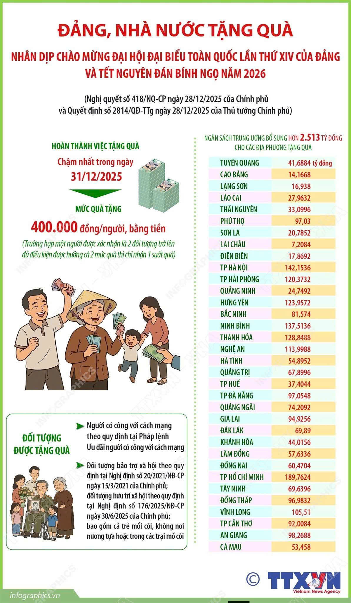 Chính phủ vừa ban hành Nghị quyết số 418/NQ-CP ngày 28/12/2025 về việc tặng quà của Đảng, Nhà nước nhân dịp chào mừng Đại hội đại biểu toàn quốc lần thứ XIV của Đảng và Tết Nguyên đán Bính Ngọ năm 2026 cho người có công với cách mạng, các đối tượng bảo trợ xã hội, hưu trí xã hội và đối tượng yếu thế khác. Ngày 28/12/2025, Thủ tướng Chính phủ Phạm Minh Chính ký Quyết định số 2814/QĐ-TTg bổ sung có mục tiêu từ ngân sách Trung ương năm 2025 cho các địa phương để thực hiện tặng quà của Đảng, Nhà nước nhân dịp chào mừng Đại hội đại biểu toàn quốc lần thứ XIV của Đảng và Tết Nguyên đán Bính Ngọ năm 2026. Cụ thể, bổ sung có mục tiêu từ ngân sách trung ương cho các địa phương số tiền là 2.513.946 triệu đồng từ nguồn dự phòng ngân sách Trung ương năm 2025 được bổ sung theo Nghị quyết số 265/2025/QH15 ngày 11/12/2025 của Quốc hội để thực hiện tặng quà của Đảng, Nhà nước nhân dịp chào mừng Đại hội đại biểu toàn quốc lần thứ XIV của Đảng và Tết Nguyên đán Bính Ngọ năm 2026. Mức quà tặng: 400.000 đồng/người, bằng tiền. Nghị quyết yêu cầu việc tặng quà hoàn thành chậm nhất trong ngày 31/12/2025.