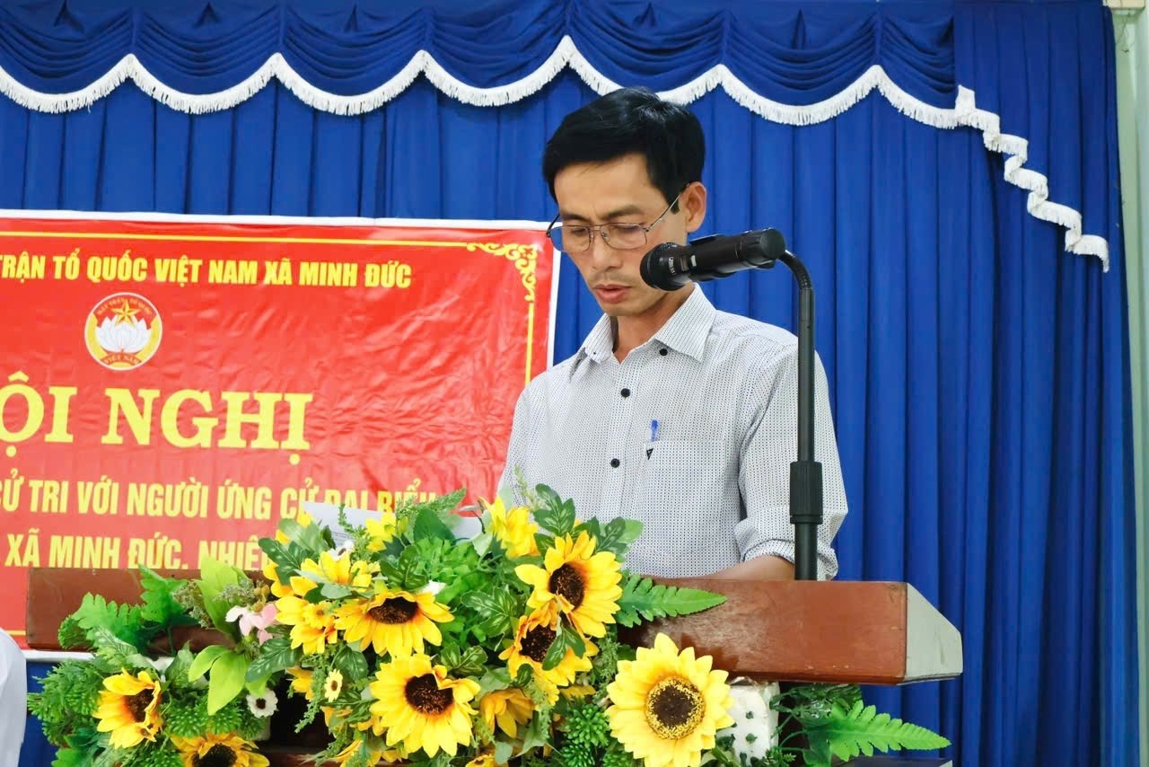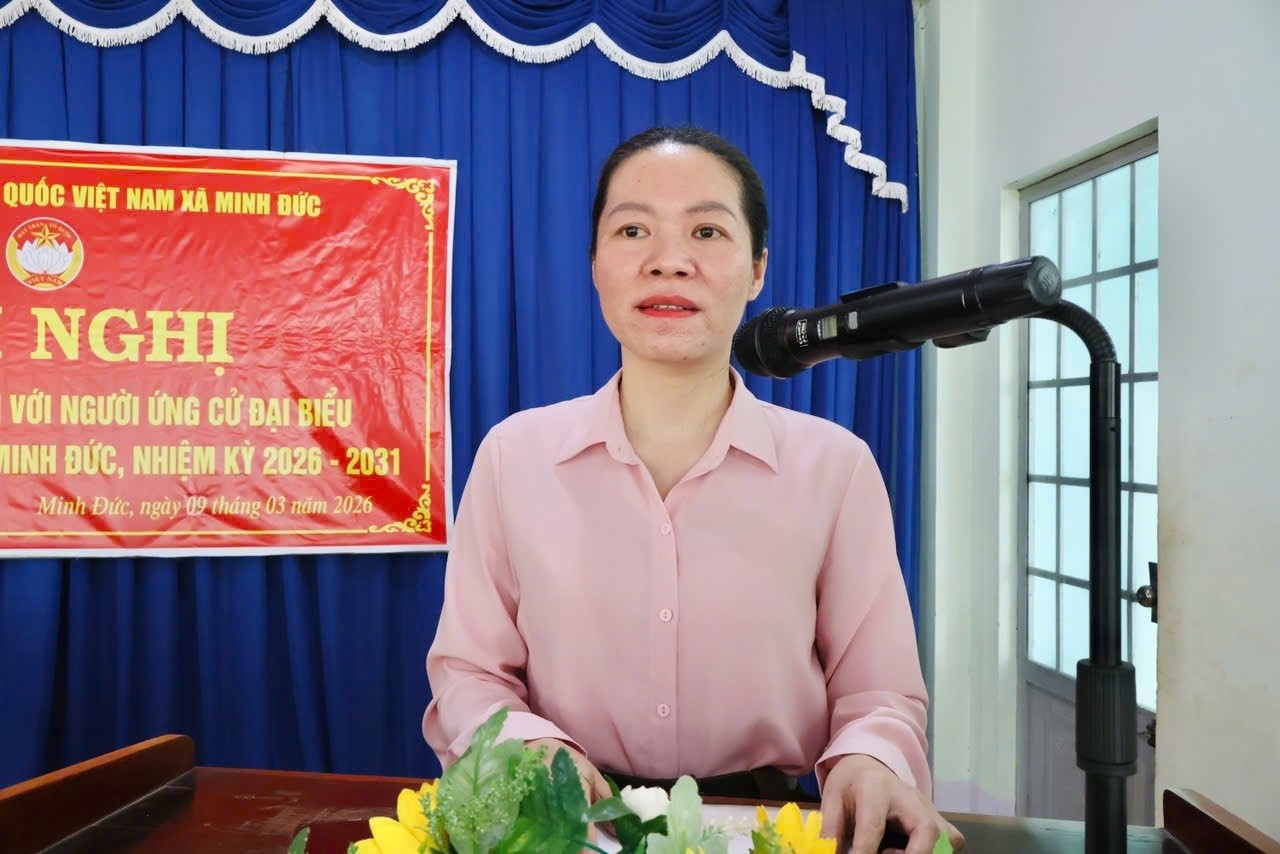 Tại hội nghị, cử tri đã được nghe đại diện Ủy ban MTTQ Việt Nam xã Minh Đức báo cáo tóm tắt tiểu sử của các ứng cử viên đại biểu HĐND xã nhiệm kỳ 2026 – 2031. Đồng thời, các ứng cử viên đã trình bày chương trình hành động của mình nếu được cử tri tín nhiệm bầu làm đại biểu HĐND xã nhiệm kỳ tới. Nội dung chương trình hành động tập trung vào việc phát triển kinh tế - xã hội của địa phương, nâng cao đời sống vật chất và tinh thần của Nhân dân; quan tâm xây dựng cơ sở hạ tầng, giữ vững an ninh trật tự; phát huy vai trò giám sát của HĐND, góp phần xây dựng chính quyền cơ sở ngày càng vững mạnh, hoạt động hiệu lực, hiệu quả.