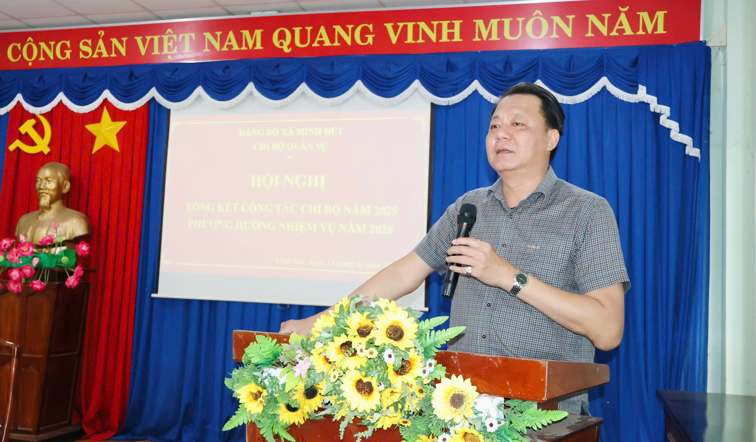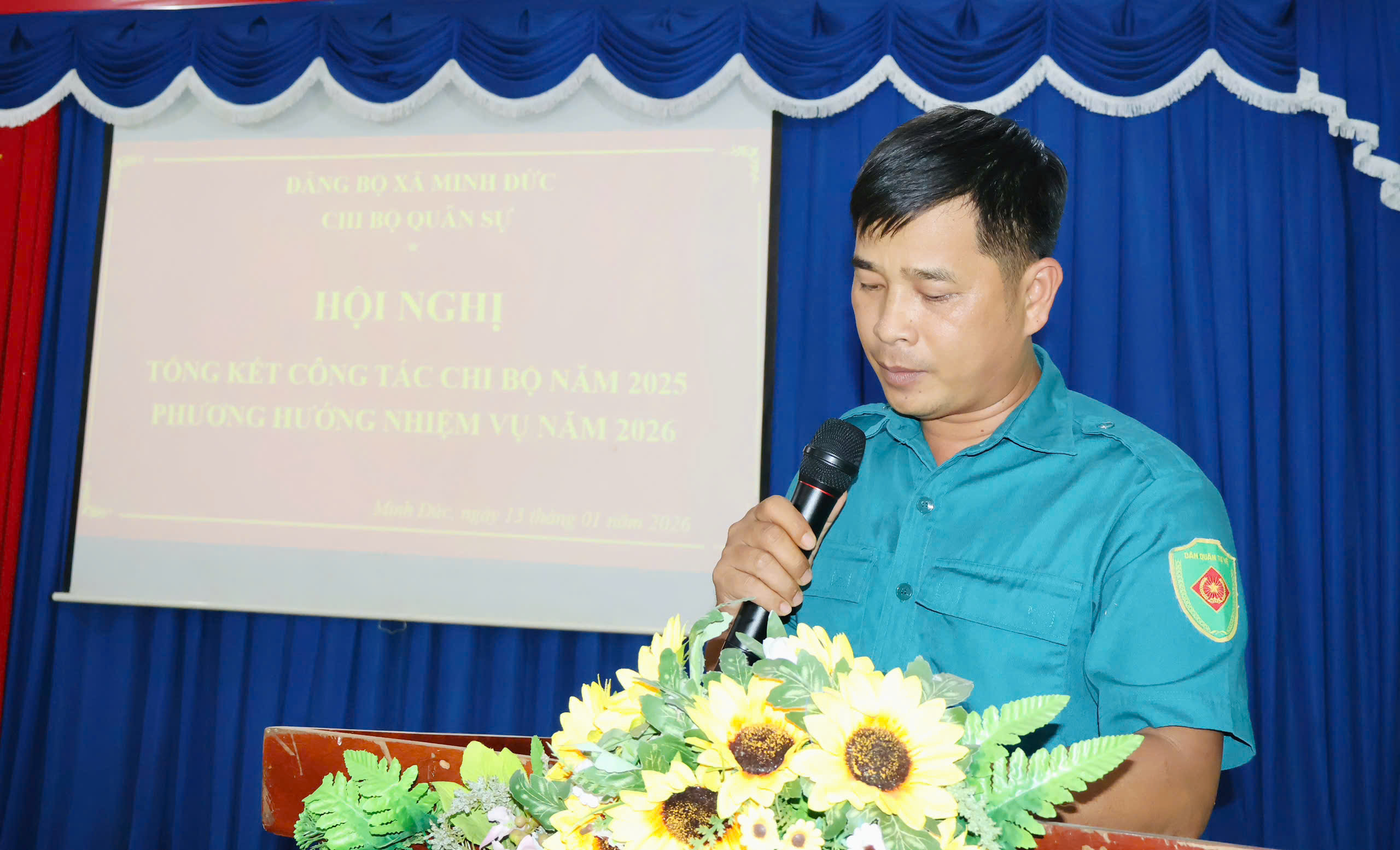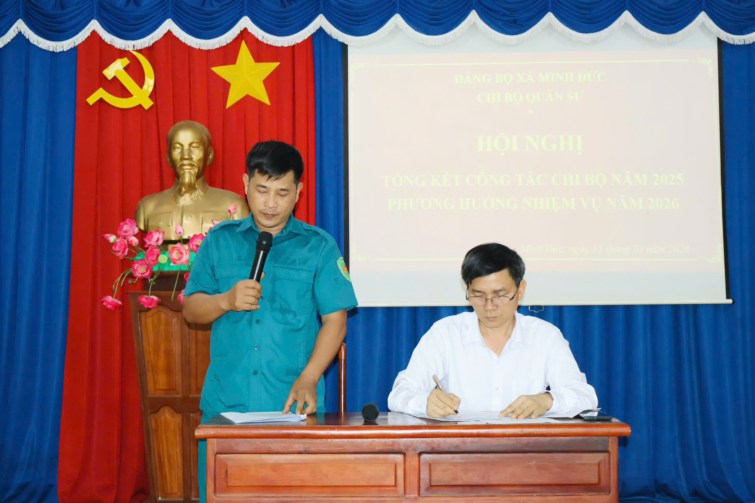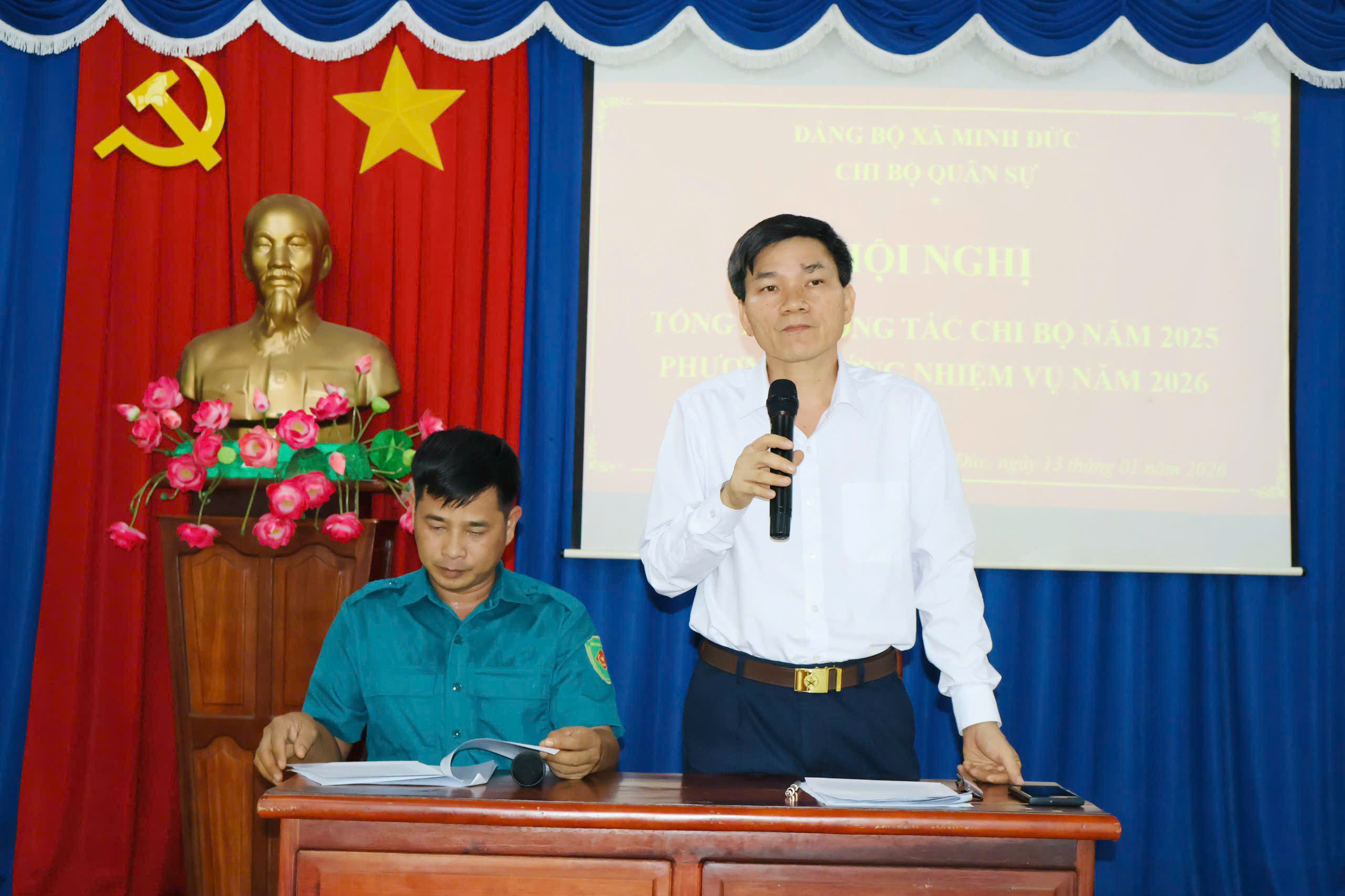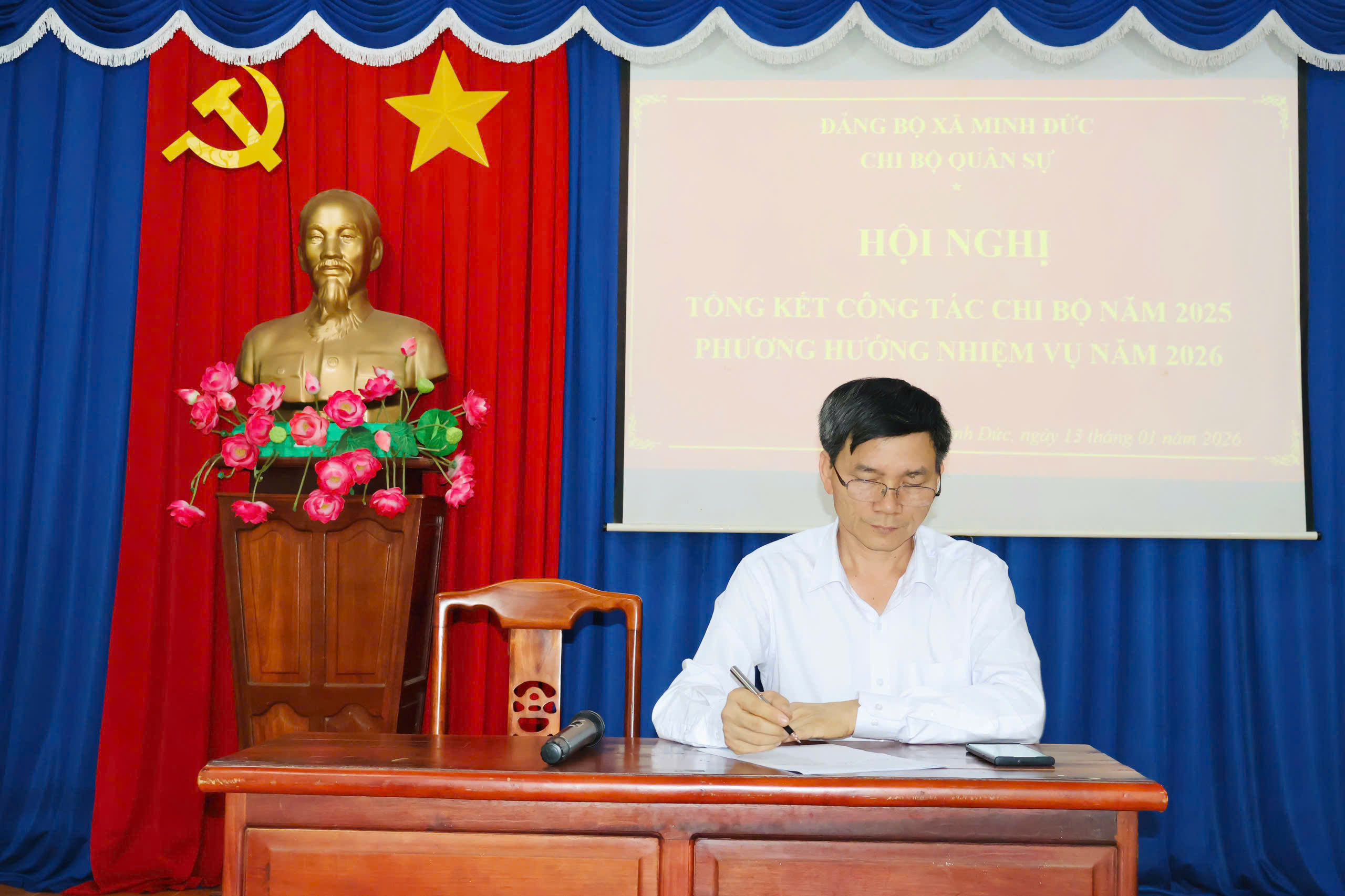 Chiều ngày 13/1/2025, Chi bộ Quân sự xã Minh Đức đã tổ chức Hội nghị tổng kết Chi bộ năm 2025, triển khai phương hướng, nhiệm vụ trọng tâm năm 2026. Hội nghị nhằm đánh giá toàn diện kết quả lãnh đạo, chỉ đạo thực hiện nhiệm vụ quốc phòng – quân sự địa phương trong năm qua, đồng thời đề ra các giải pháp nâng cao chất lượng thực hiện nhiệm vụ trong thời gian tới.
