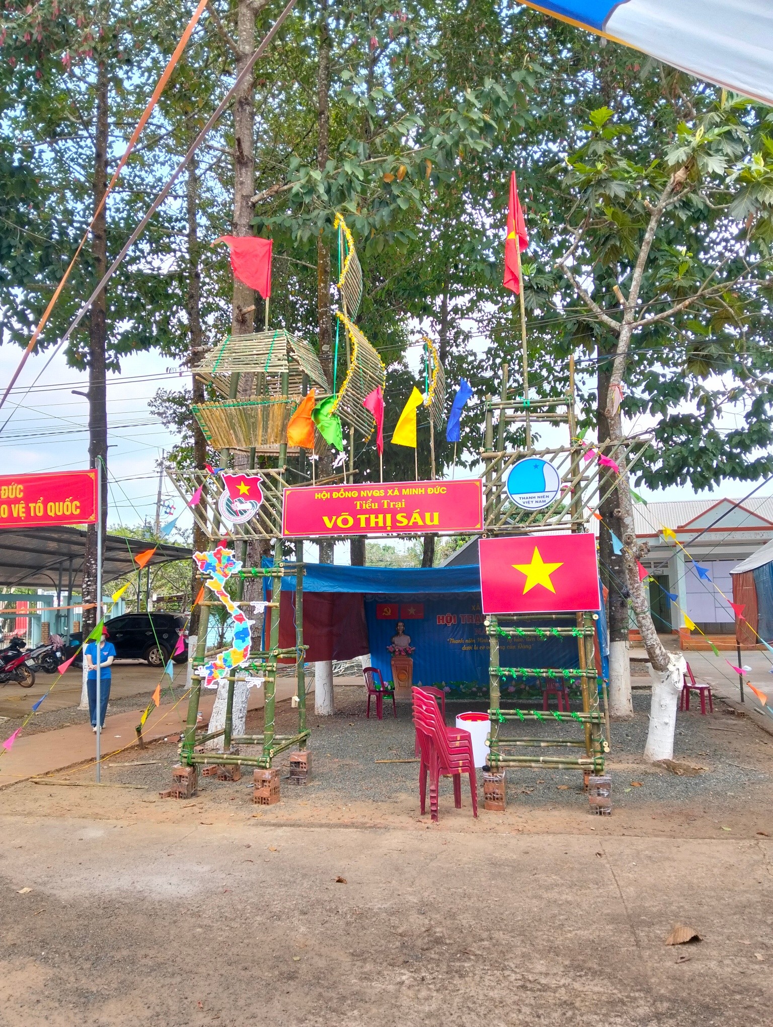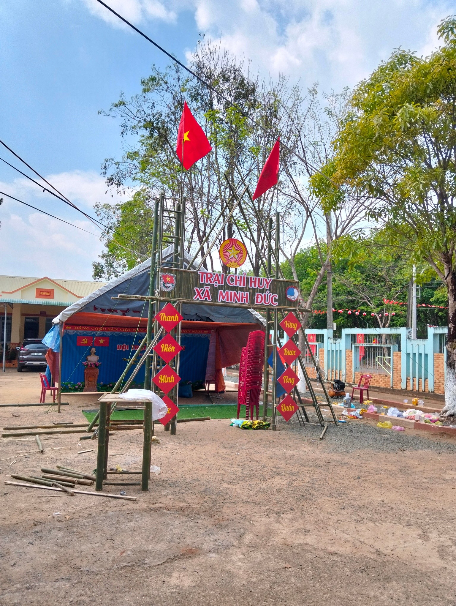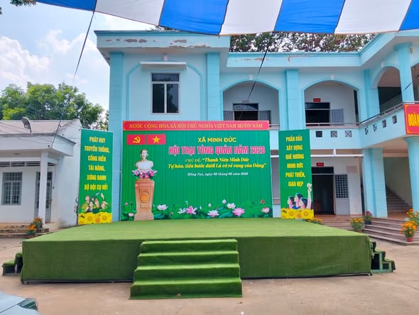Không khí chuẩn bị Hội trại tòng quân năm 2026 trên địa bàn xã Minh Đức diễn ra hết sức khẩn trương, sôi nổi và đầy khí thế. Ngay từ sáng sớm, lực lượng đoàn viên thanh niên, dân quân, công an xã cùng các ban, ngành, đoàn thể đã tích cực tham gia dựng trại, trang trí cổng trại, sân khấu, treo cờ Tổ quốc, băng rôn, khẩu hiệu tuyên truyền.