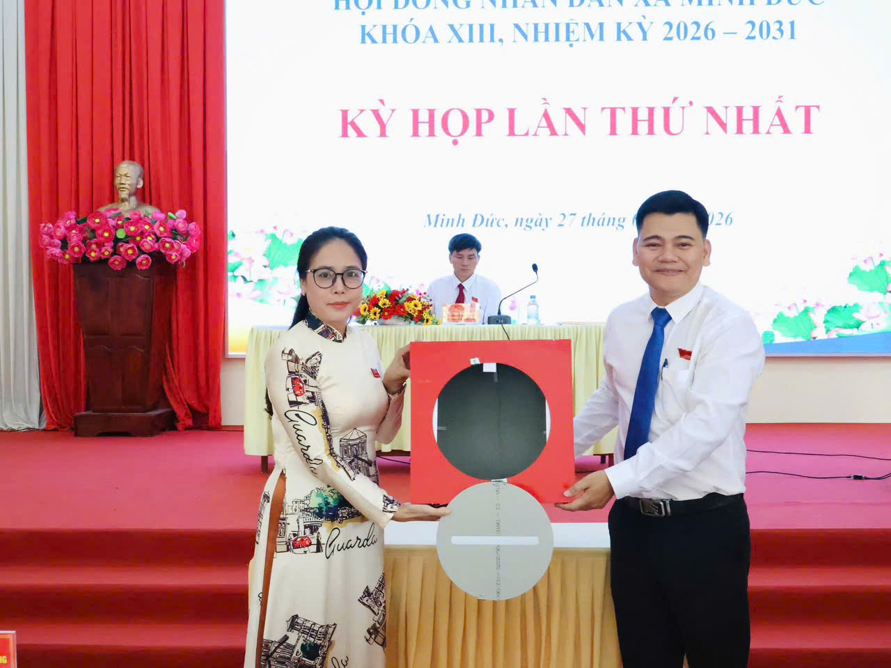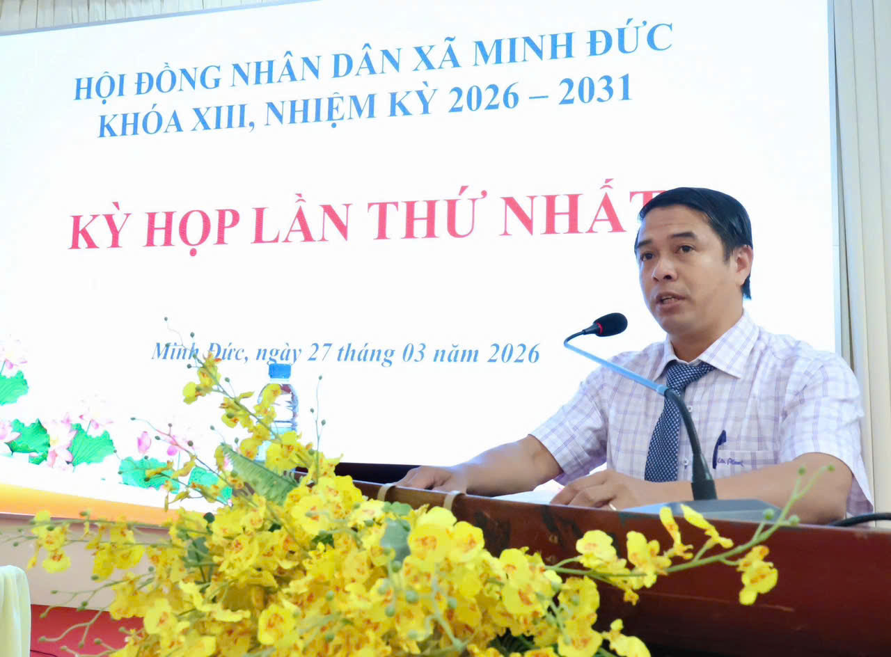 Sáng ngày 27/3/2026, tại Hội trường UBND xã, Hội đồng nhân dân xã Minh Đức đã long trọng tổ chức Kỳ họp thứ nhất, khóa XIII, nhiệm kỳ 2026 – 2031. Tham dự kỳ họp có đồng chí Bùi Xuân Thống – Tỉnh ủy viên, Phó Trưởng đoàn chuyên trách Đoàn Đại biểu Quốc hội tỉnh; đồng chí Nguyễn Ngọc Lương – Phó Trưởng Ban Văn hóa - Xã hội HĐND tỉnh; đại diện lãnh đạo các phòng chuyên môn Văn phòng Đoàn ĐBQH và HĐND tỉnh; đồng chí Trần Văn Phương - Bí thư Đảng ủy xã; đồng chí Lưu Quốc Nhật – Phó Bí thư Thường trực Đảng ủy xã; đồng chí Huỳnh Văn Minh - Phó Bí thư Đảng ủy, Chủ tịch UBND xã; cùng các đồng chí là UV.BTV, UV.BCH Đảng bộ xã, các đồng chí lãnh đạo đại diện các phòng, ban; các đại biểu HĐND xã các ông, bà trưởng các ấp, sóc trên địa bàn xã.