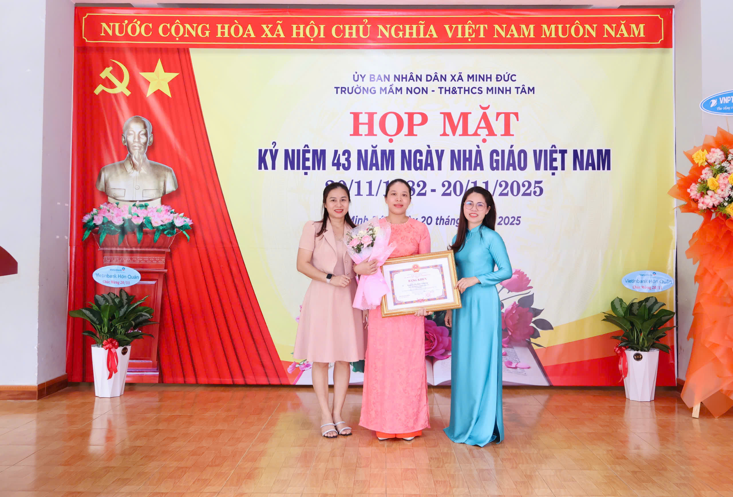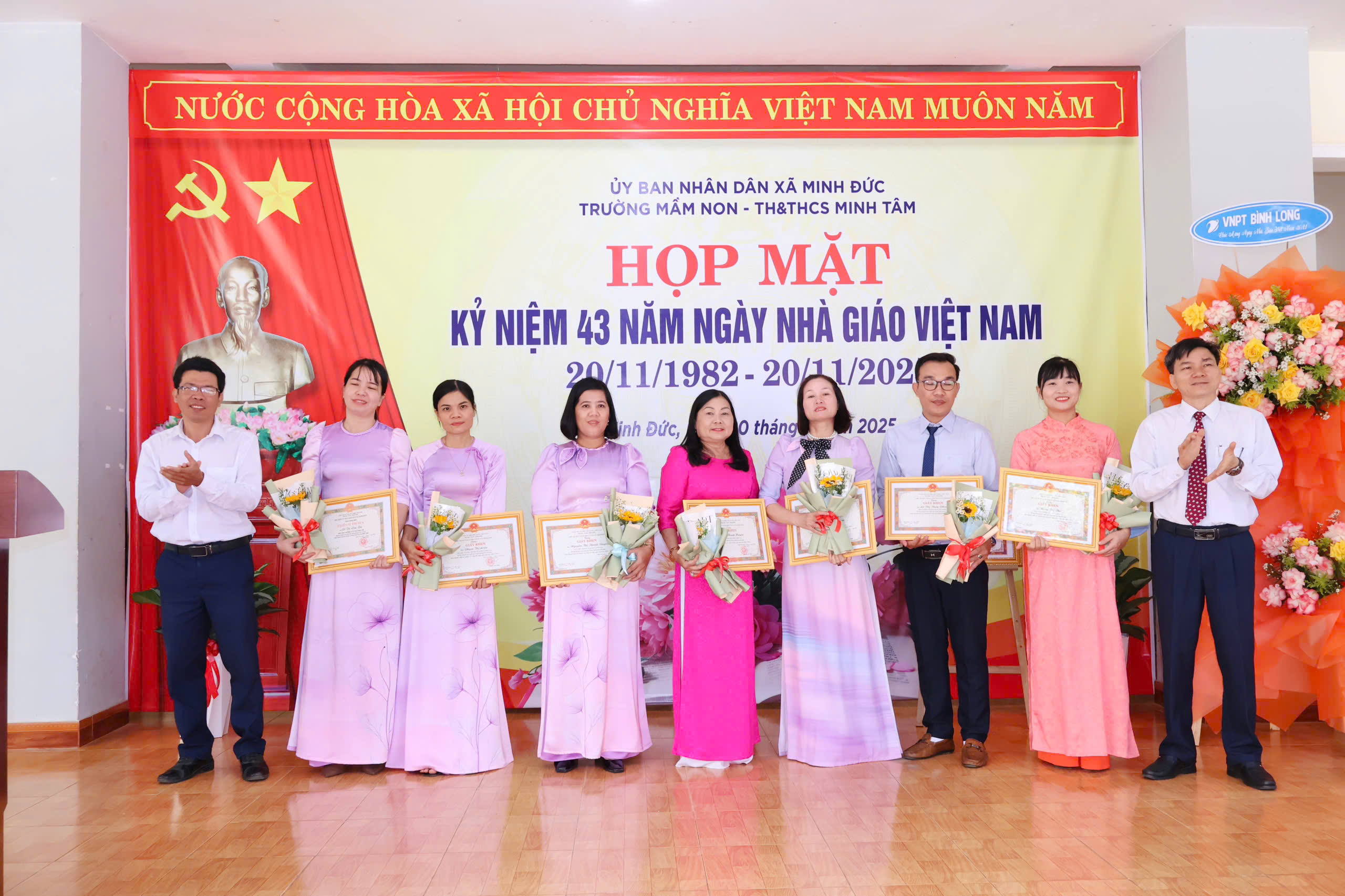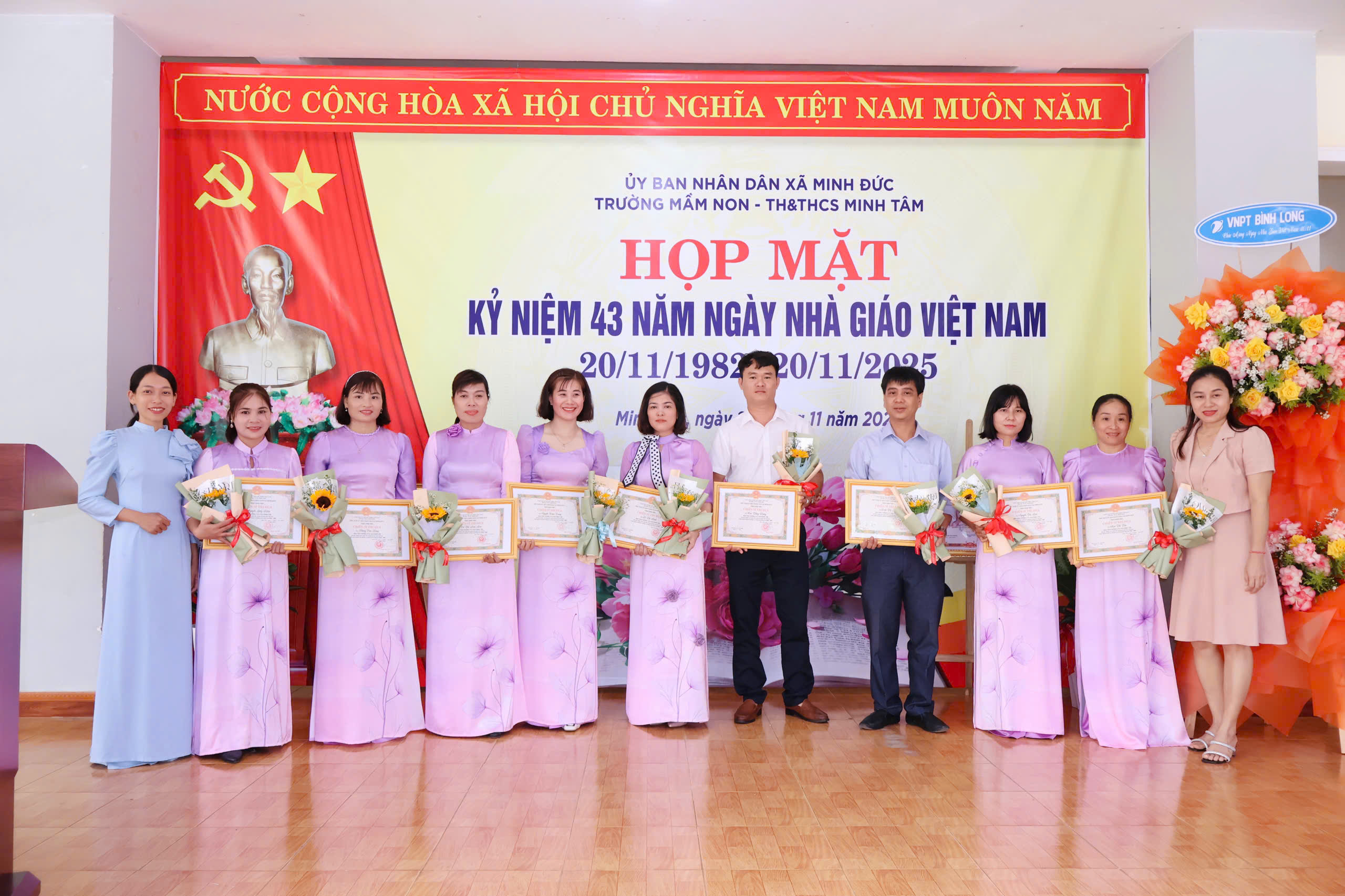 ⭐ Nhằm kịp thời ghi nhận những nỗ lực của các tập thể và cá nhân, lãnh đạo xã Minh Đức đã trao giấy khen cho các tập thể và cá nhân có thành tích xuất sắc trong phong trào thi đua của ngành giáo dục năm học vừa qua. Đây là sự khích lệ đầy ý nghĩa đối với đội ngũ thầy cô giáo trong hành trình cống hiến cho sự nghiệp trồng người.
