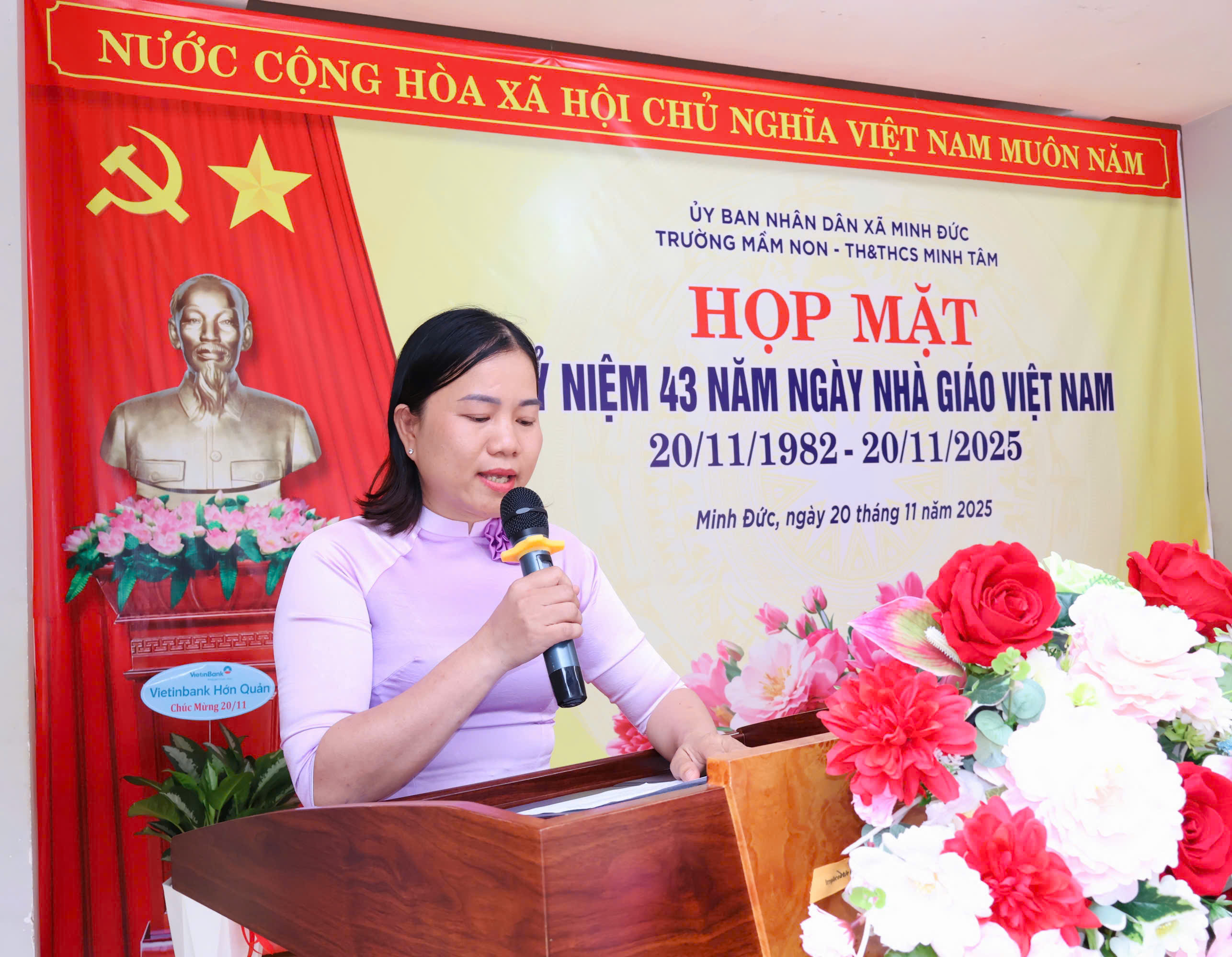 ⭐ Trong không khí trang trọng, các đại biểu và thầy cô đã cùng nhau ôn lại truyền thống 43 năm Ngày Nhà giáo Việt Nam (20/11/1982 – 20/11/2025). Truyền thống ấy tiếp tục là ngọn lửa nuôi dưỡng niềm tự hào, hun đúc tinh thần “tâm trong – trí sáng – hoài bão lớn”, khuyến khích mỗi nhà giáo không ngừng đổi mới, sáng tạo, đáp ứng yêu cầu đổi mới căn bản, toàn diện giáo dục.