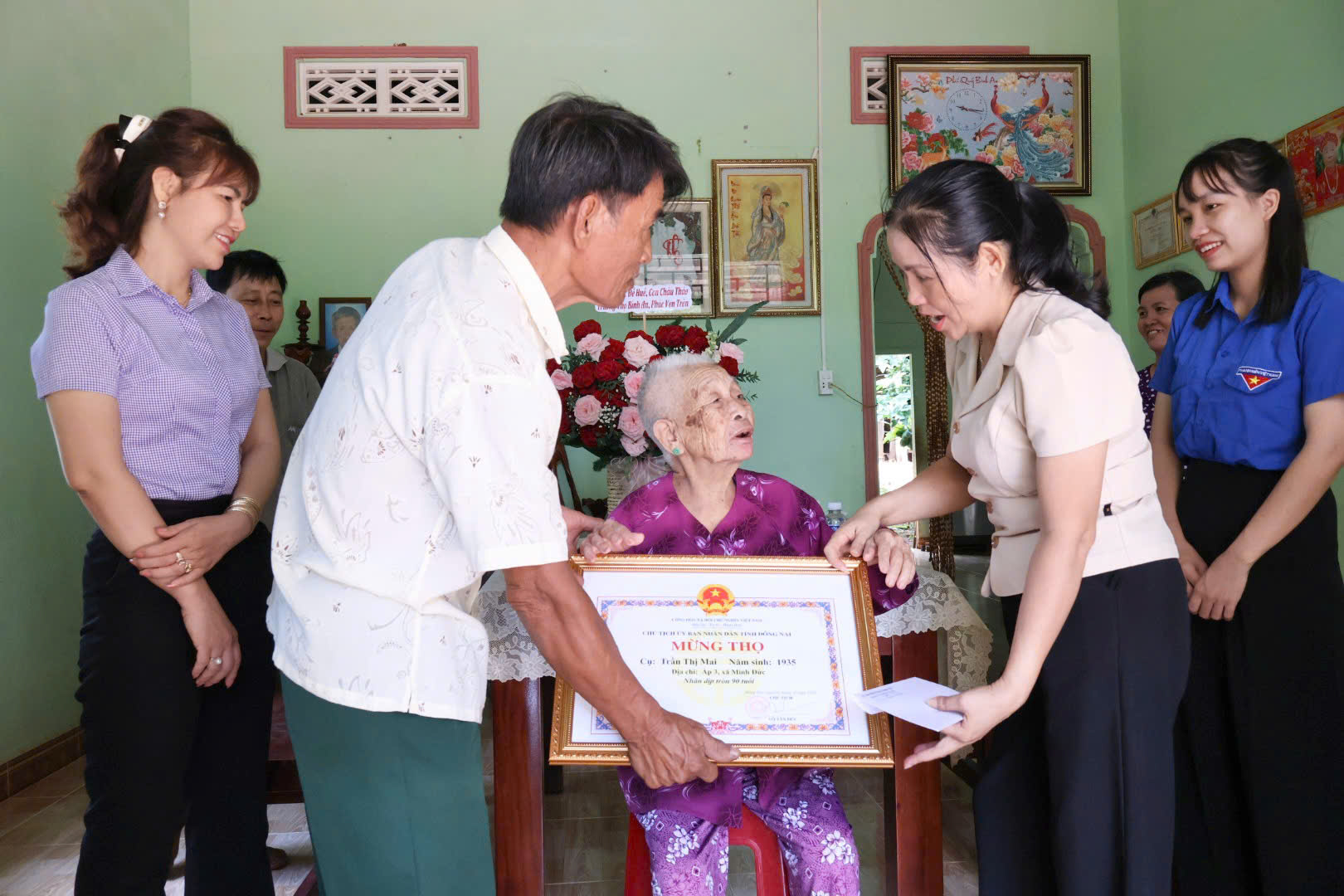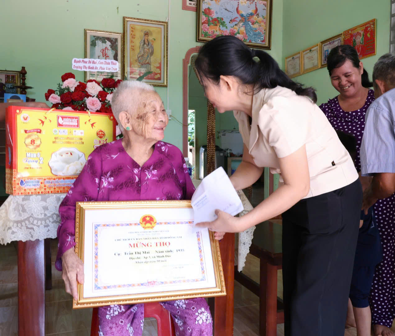 Trong đợt thăm lần này, đoàn đã đến thăm và tặng quà cho các cụ trên 90 tuổi, trong đó có hai cụ đặc biệt thọ cao là cụ Mai Thị Nhi (100 tuổi, ấp 1A) và cụ Đỗ Văn Hựu (101 tuổi, ấp 3). Các cụ được nhận thiếp chúc thọ của Chủ tịch nước, khánh vàng mừng thọ cùng phần quà của địa phương, thể hiện sự trân trọng và quan tâm đặc biệt của Đảng, Nhà nước và chính quyền xã Minh Đức.