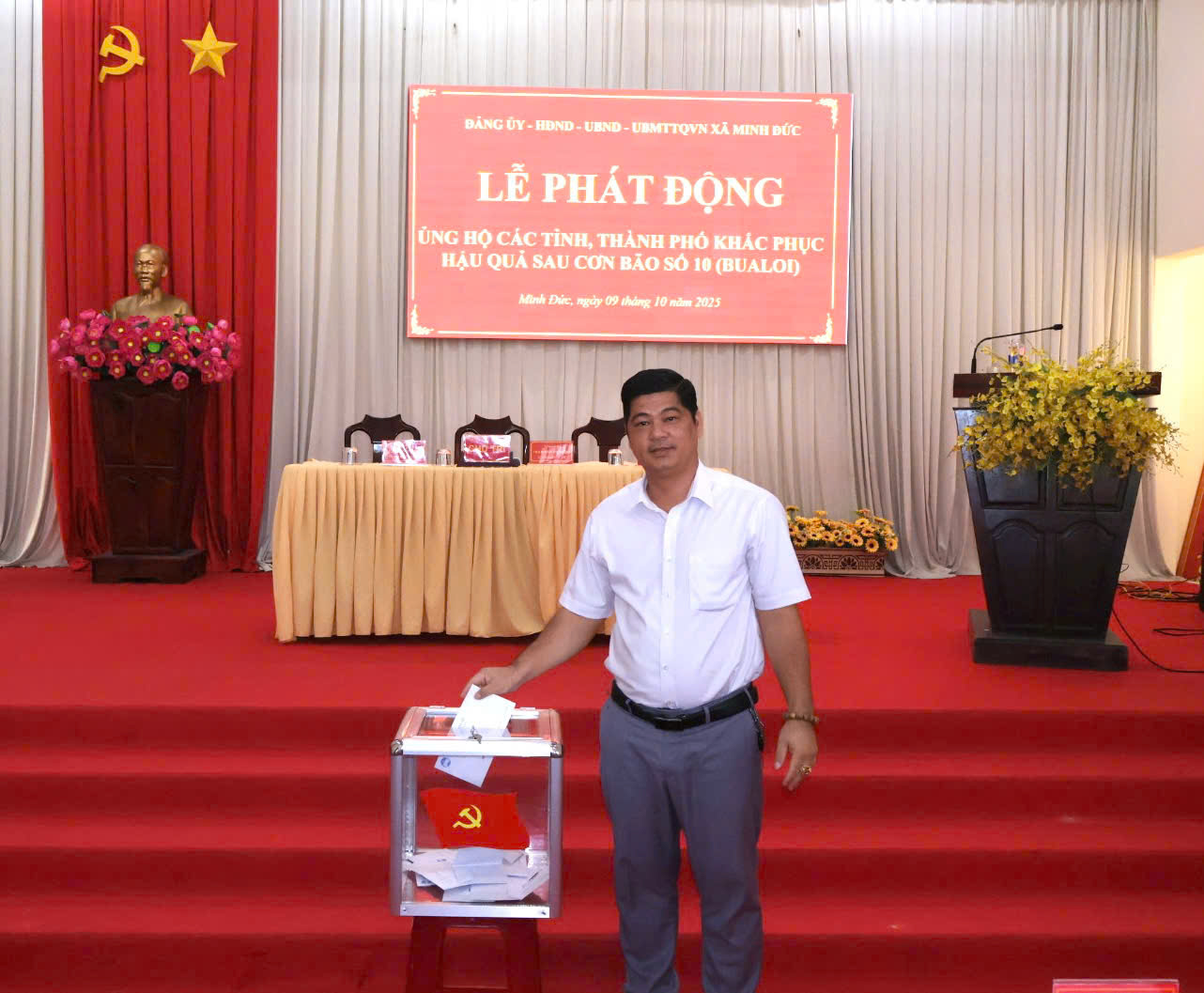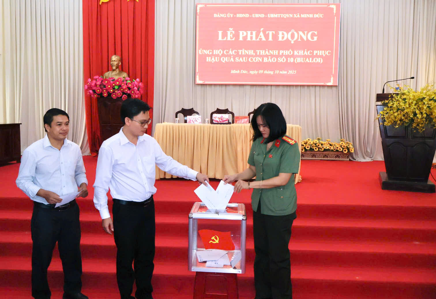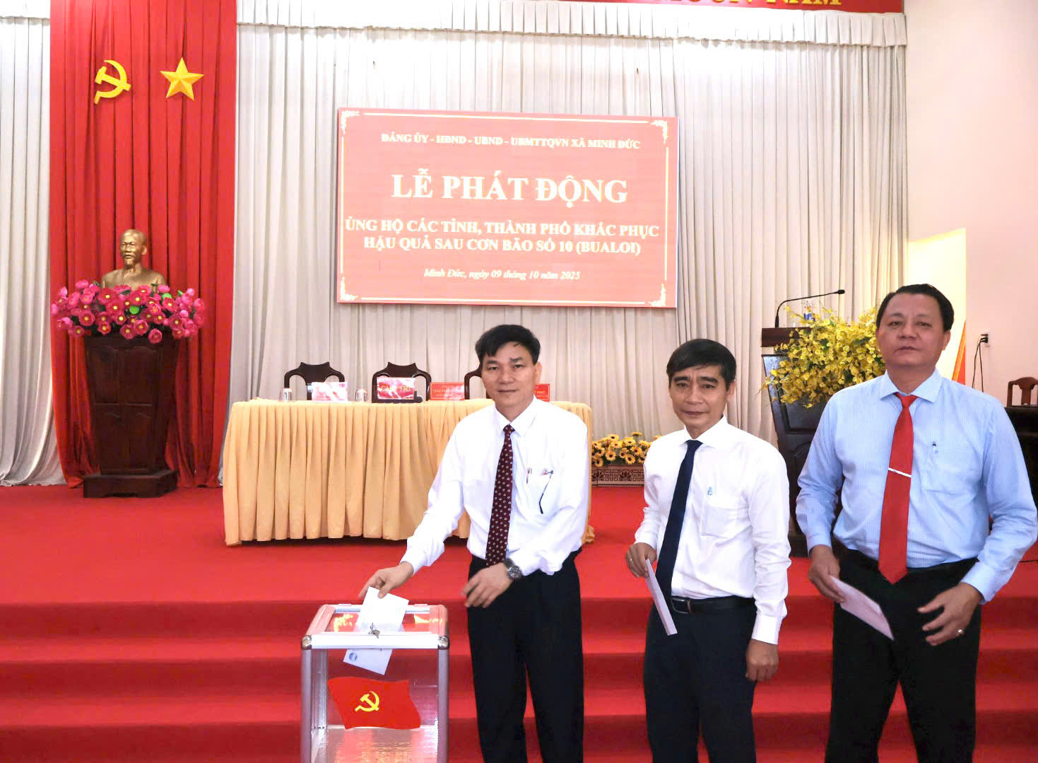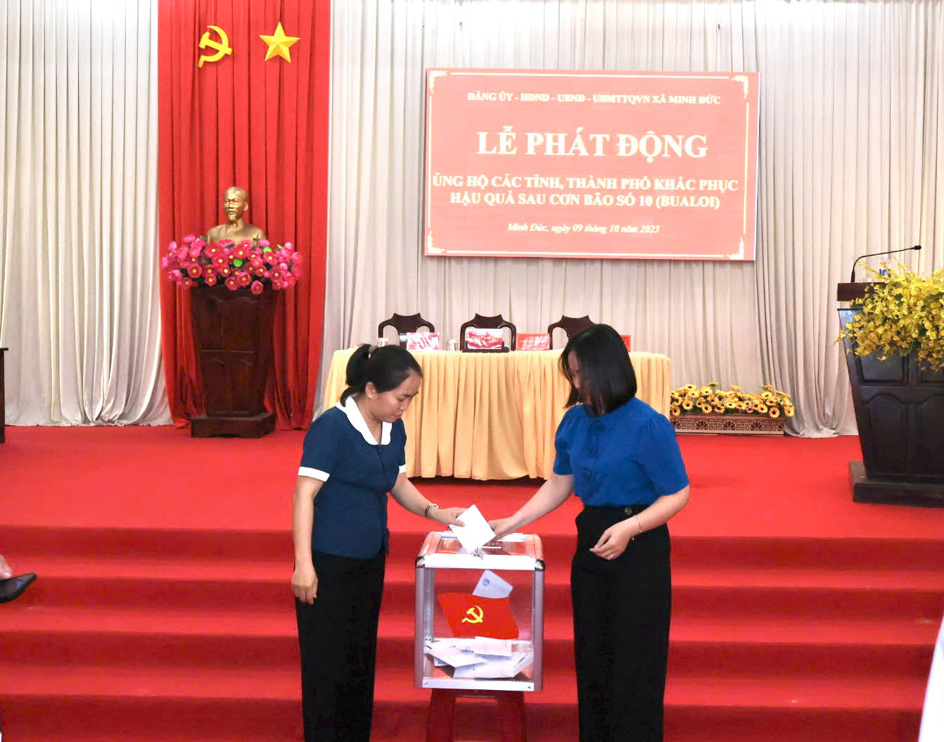 Sáng ngày 09/10/2025, trước khi diễn ra Hội nghị Ban Chấp hành Đảng bộ xã Minh Đức (mở rộng), Ủy ban Mặt trận Tổ quốc Việt Nam xã Minh Đức đã tổ chức phát động đợt quyên góp ủng hộ đồng bào các tỉnh miền Trung đang chịu ảnh hưởng nặng nề do cơn bão Bualoi gây ra.