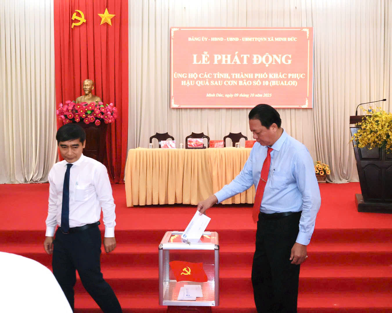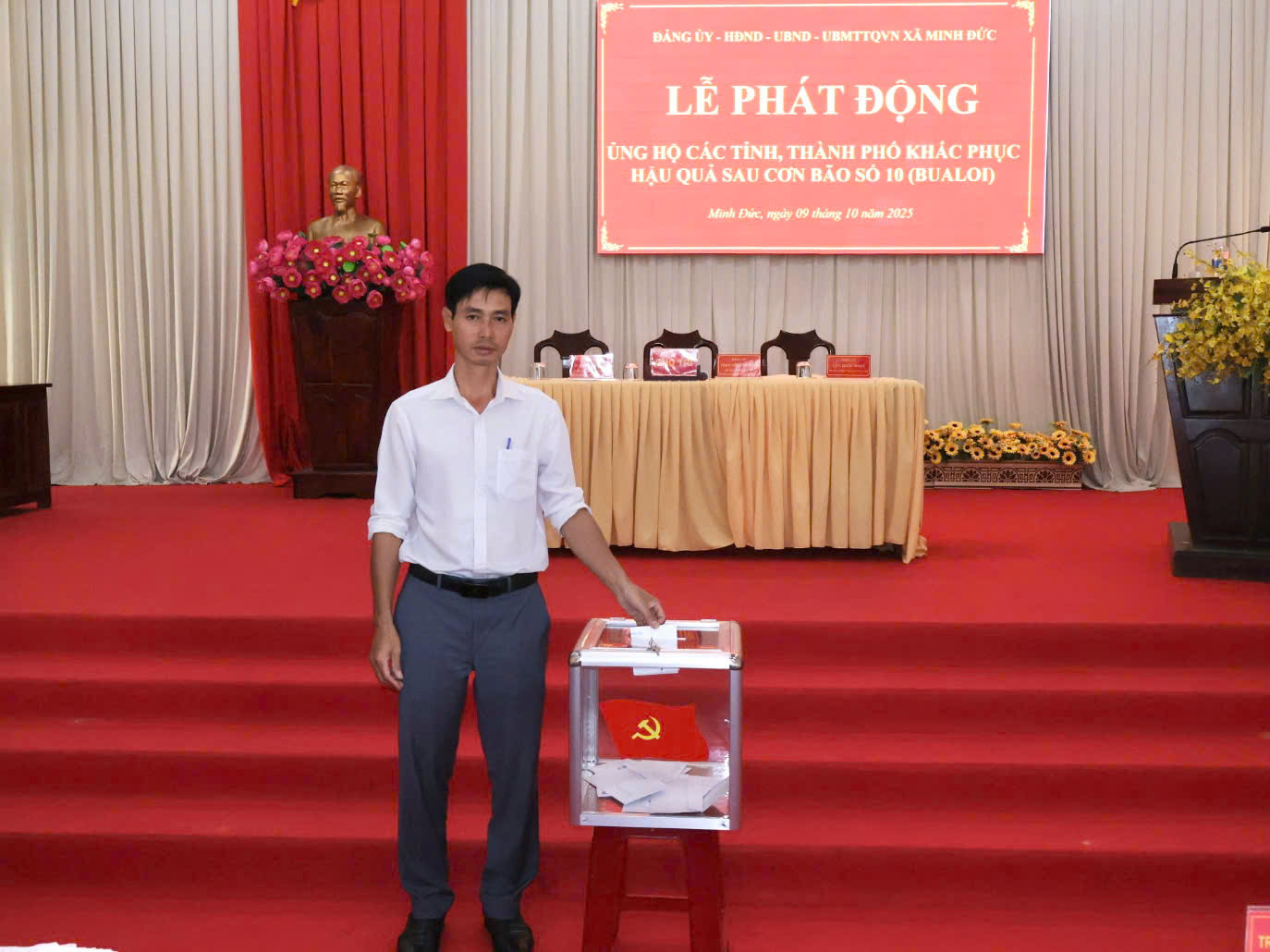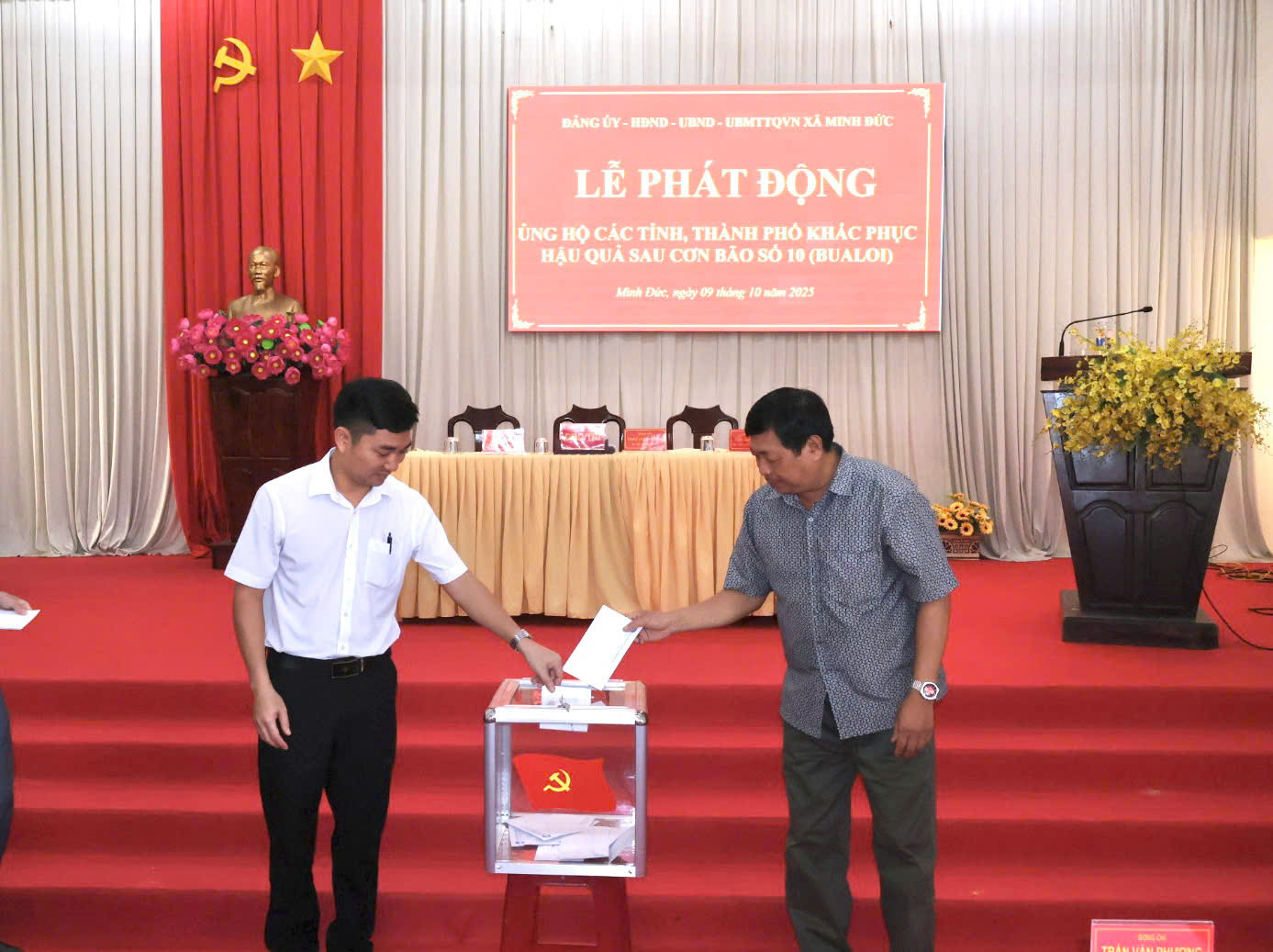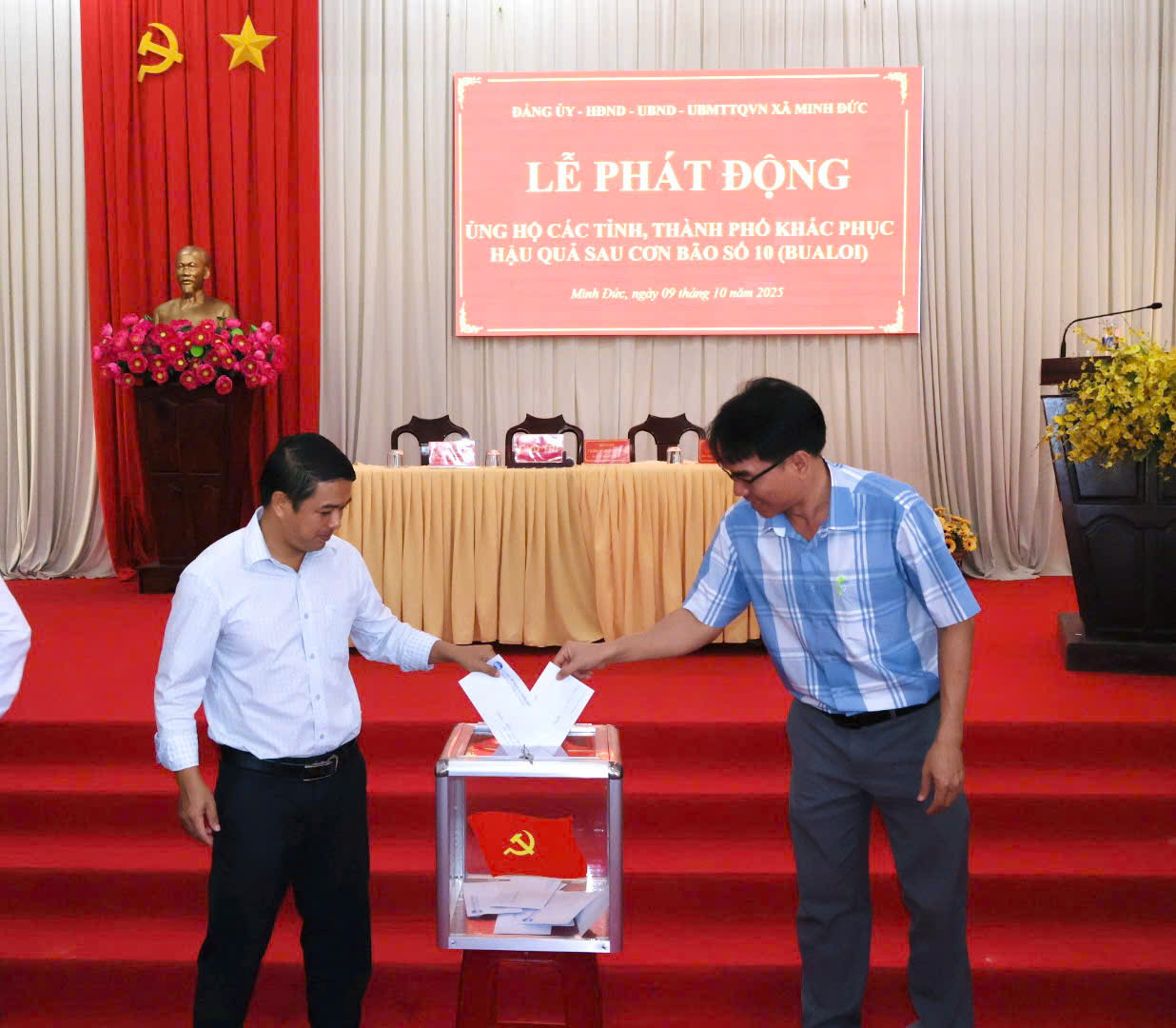 Sáng ngày 09/10/2025, trước khi diễn ra Hội nghị Ban Chấp hành Đảng bộ xã Minh Đức (mở rộng), Ủy ban Mặt trận Tổ quốc Việt Nam xã Minh Đức đã tổ chức phát động đợt quyên góp ủng hộ đồng bào các tỉnh miền Trung đang chịu ảnh hưởng nặng nề do cơn bão Bualoi gây ra.