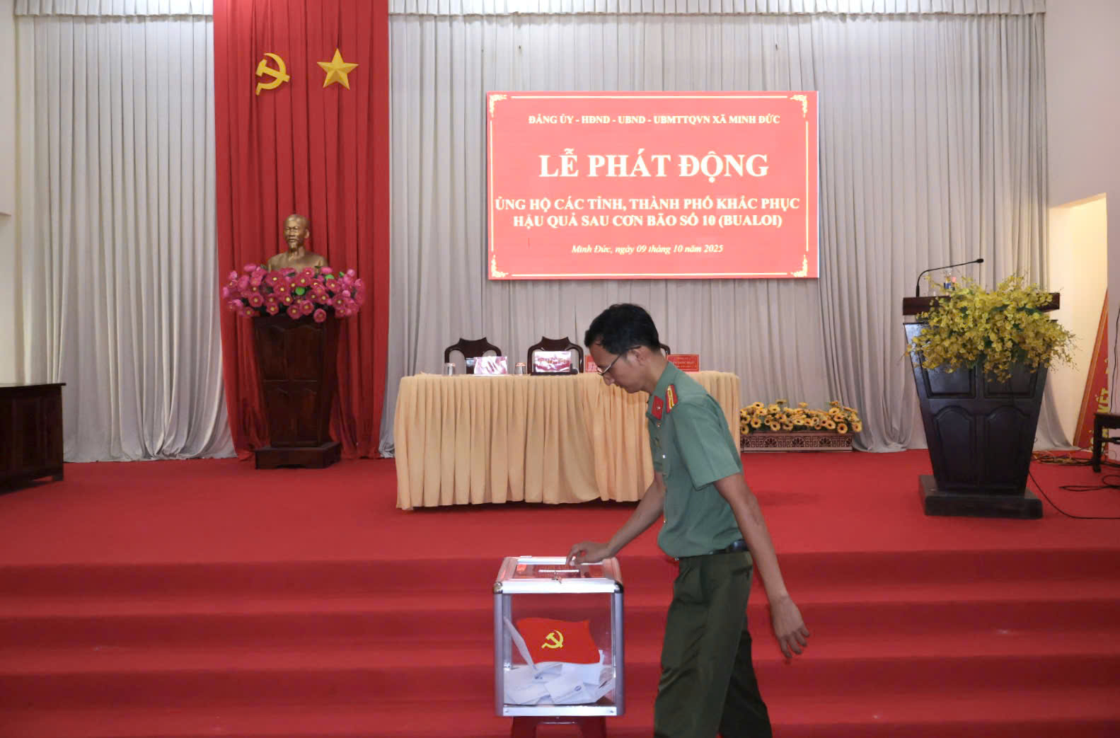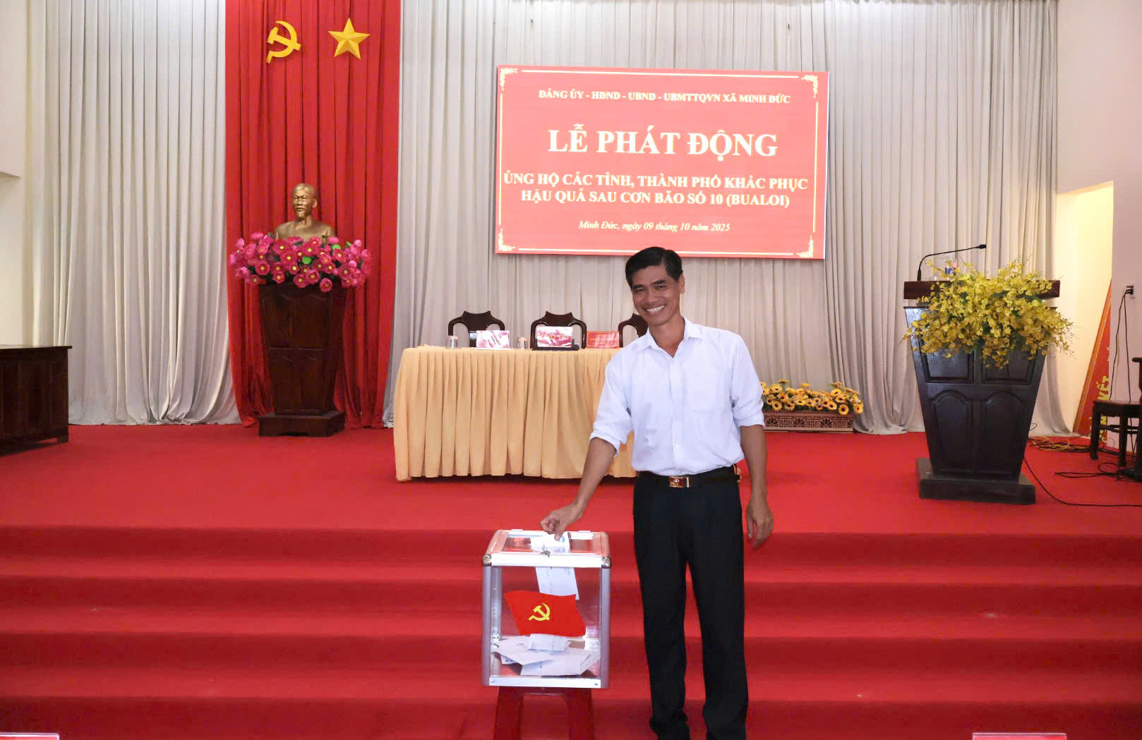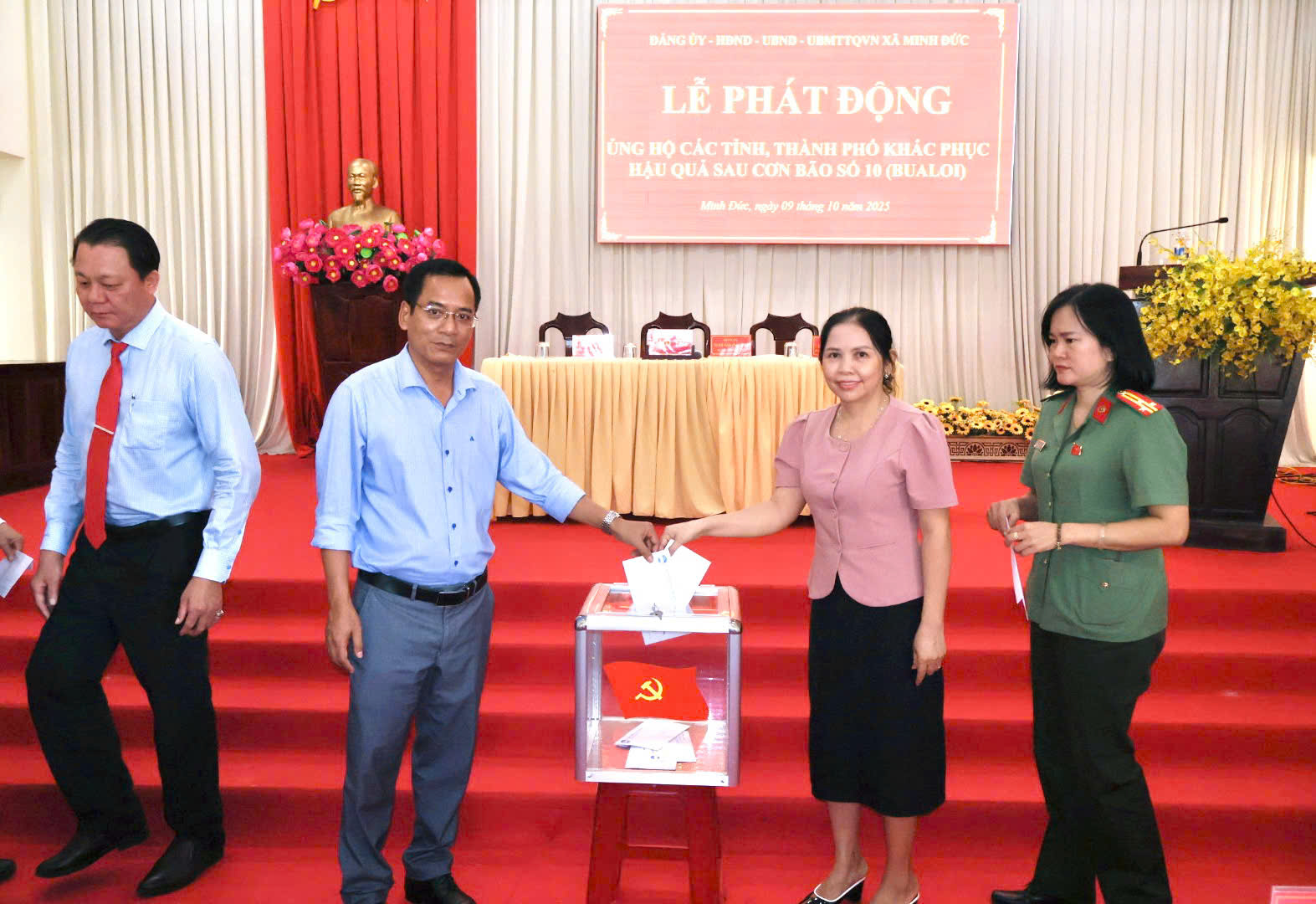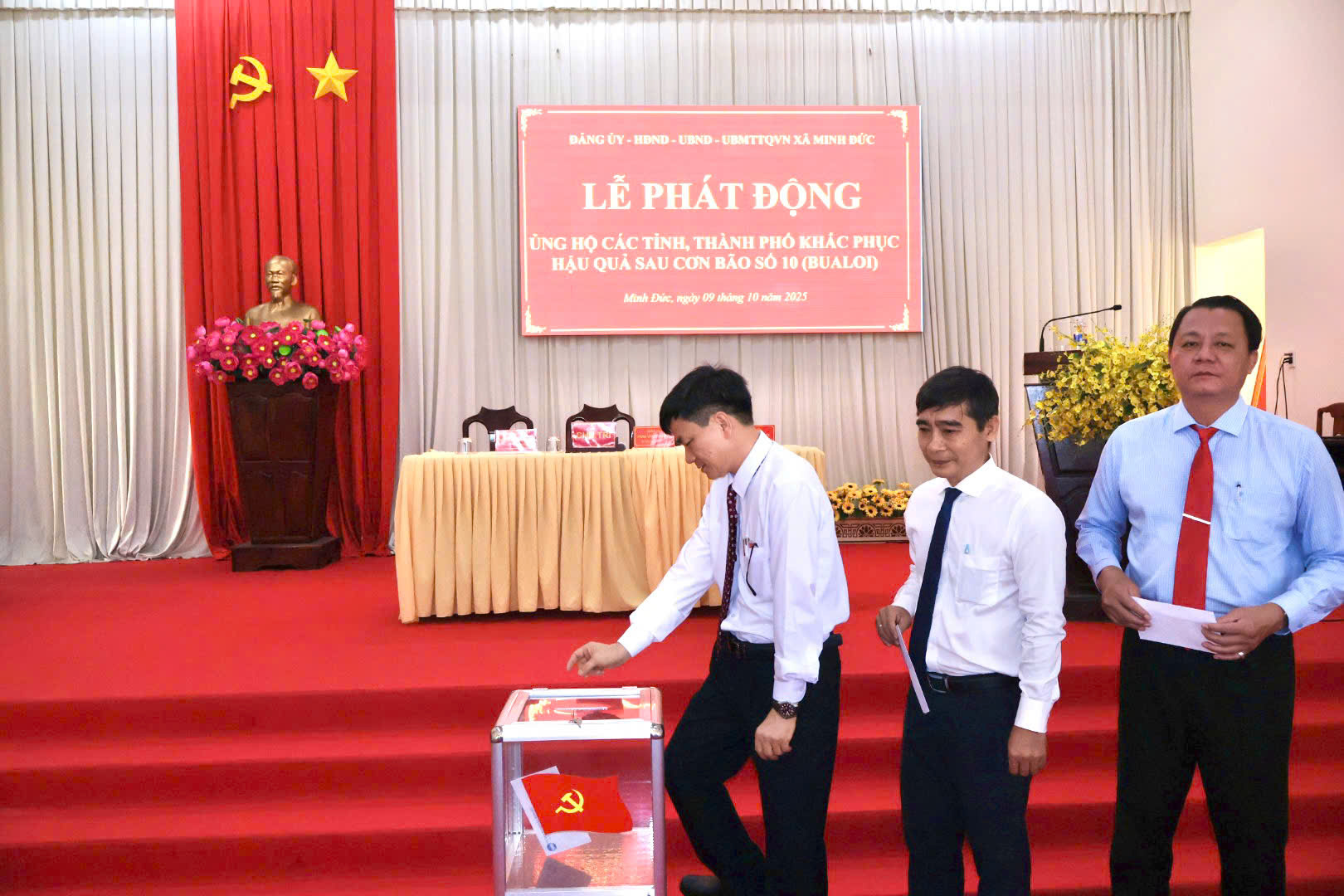 Sáng ngày 09/10/2025, trước khi diễn ra Hội nghị Ban Chấp hành Đảng bộ xã Minh Đức (mở rộng), Ủy ban Mặt trận Tổ quốc Việt Nam xã Minh Đức đã tổ chức phát động đợt quyên góp ủng hộ đồng bào các tỉnh miền Trung đang chịu ảnh hưởng nặng nề do cơn bão Bualoi gây ra.