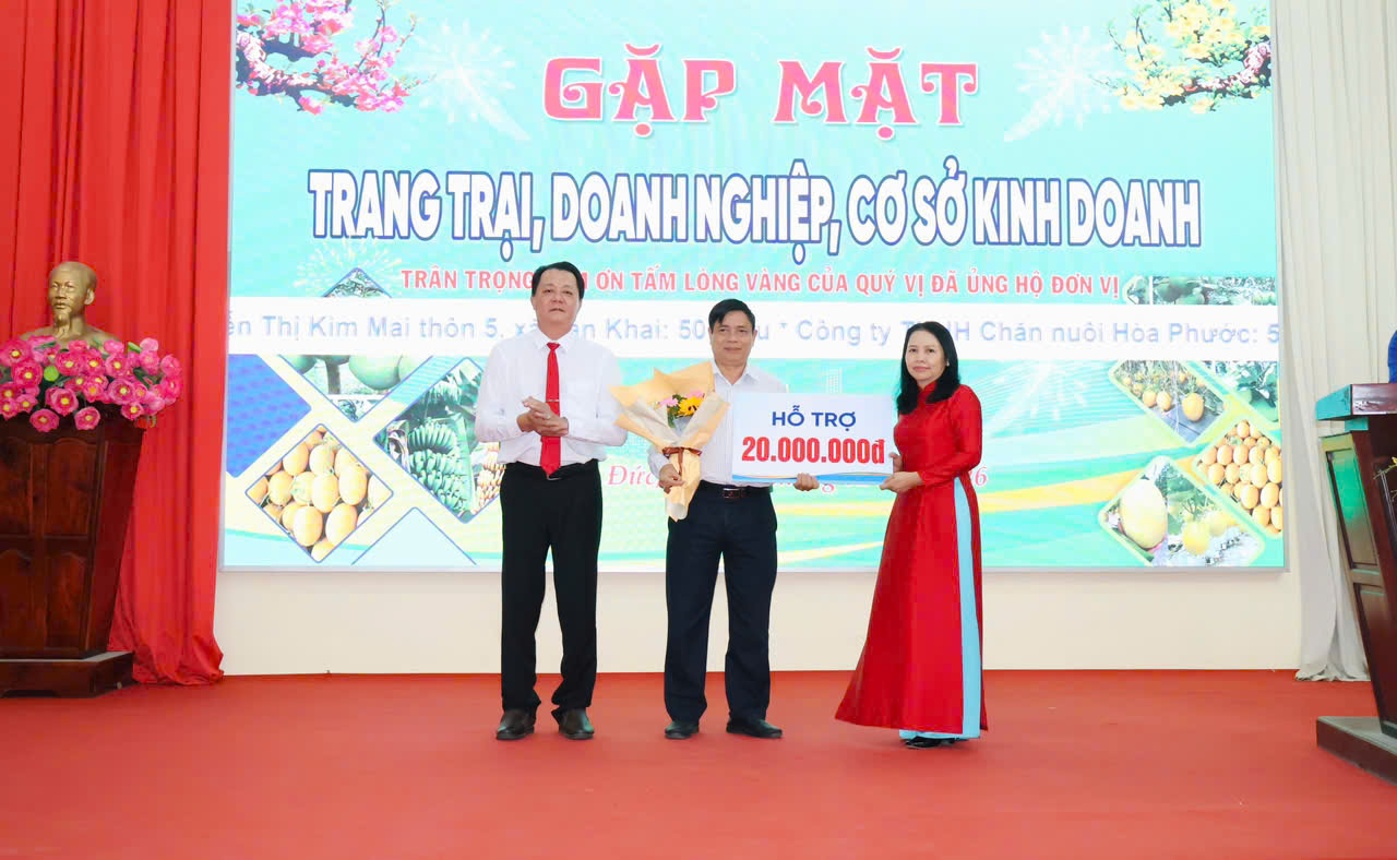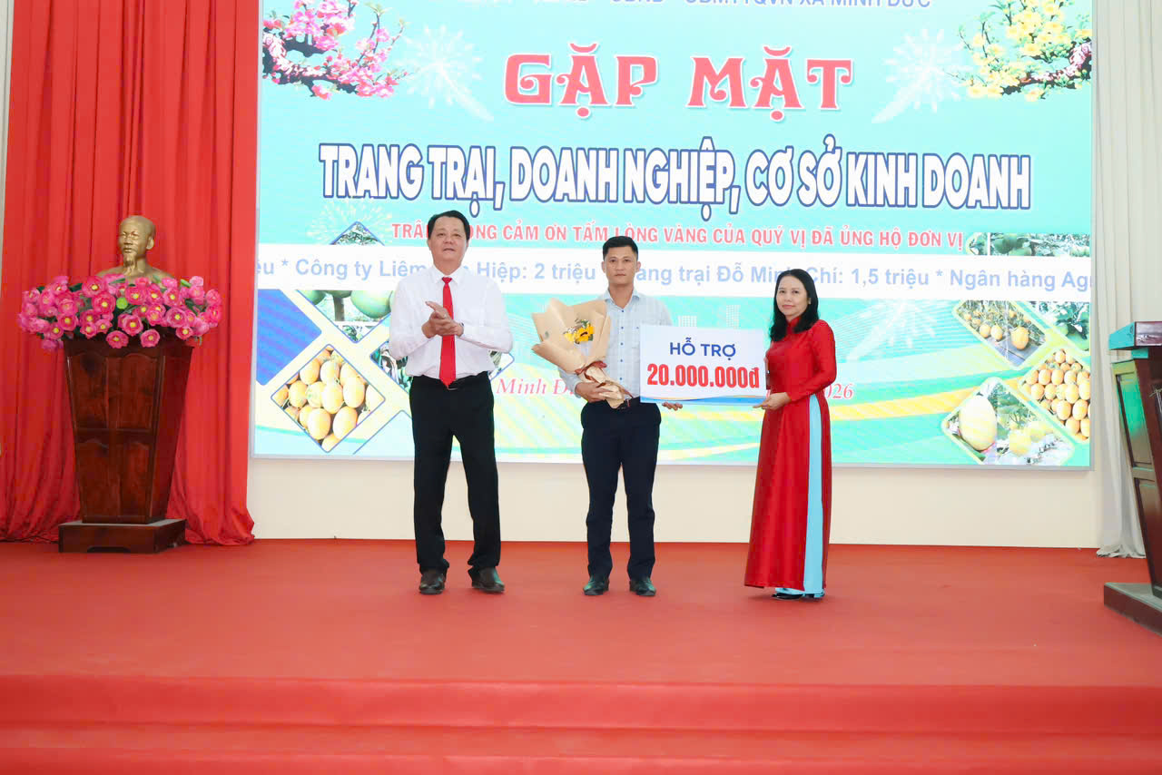 Tại buổi họp mặt, lãnh đạo xã Minh Đức đã tiếp nhận sự ủng hộ của các doanh nghiệp, hợp tác xã, trang trại và cơ sở kinh doanh với tổng số tiền 860,5 triệu đồng, góp phần chăm lo đời sống cho các đối tượng chính sách, hộ nghèo, hộ cận nghèo, người cao tuổi neo đơn và các hoàn cảnh khó khăn trên địa bàn.