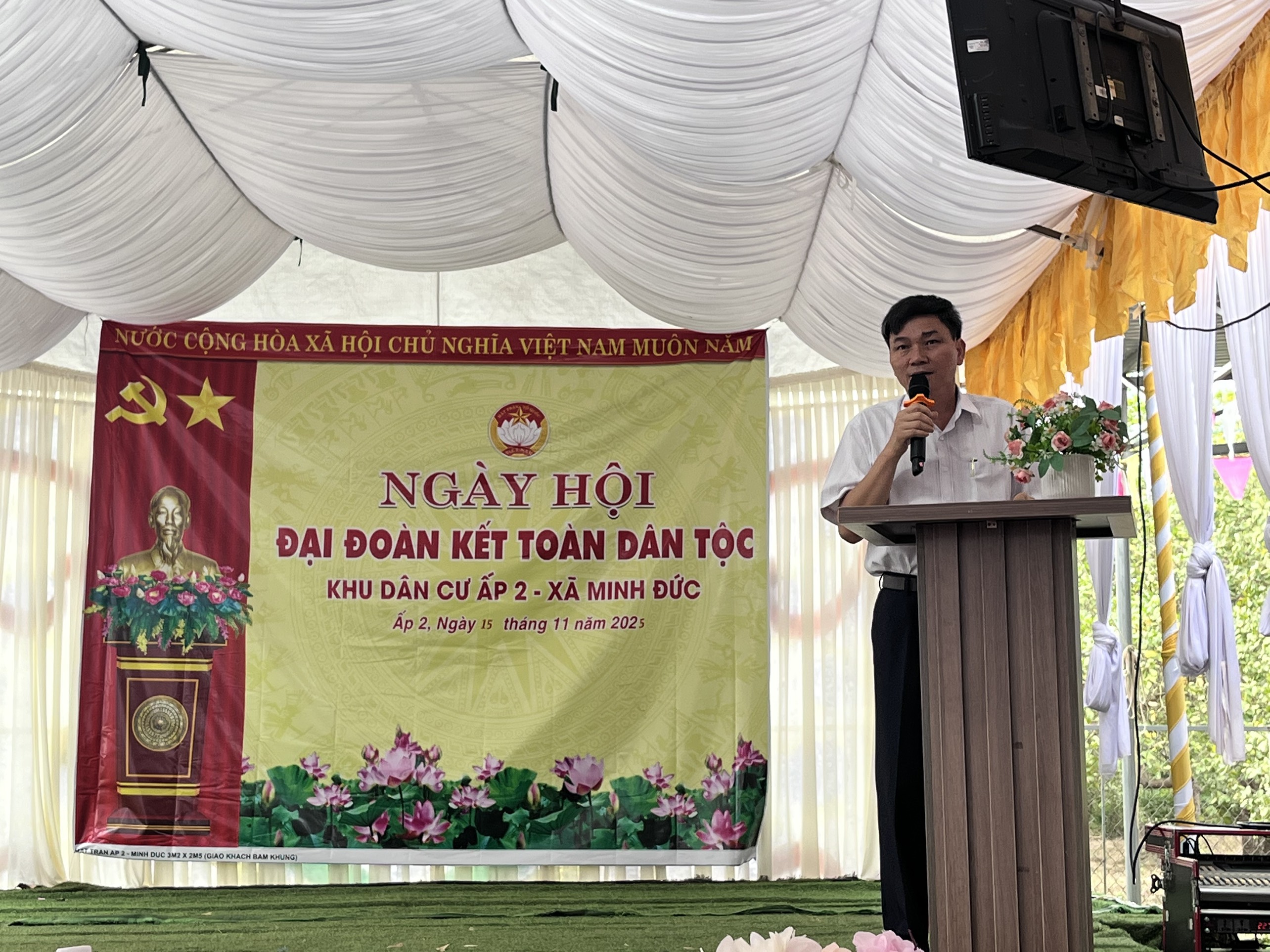 Hướng đến kỷ niệm 95 năm Ngày truyền thống Mặt trận Tổ quốc Việt Nam (18/11/1930 – 18/11/2025), ngày 15/11, Khu Dân cư Ấp 2 – xã Minh Đức long trọng tổ chức Ngày hội Đại đoàn kết toàn dân tộc và tổng kết hoạt động khu dân cư năm 2025.