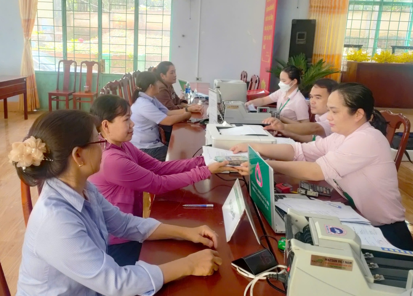 Tại phiên giao dịch, Phòng giao dịch NHCSXH Hớn Quản đã thực hiện thu nợ gốc với số tiền 506 triệu đồng, thu lãi hơn 258 triệu đồng và nhận tiền gửi tiết kiệm hơn 291 triệu đồng thông qua tổ TK&VV. Đồng thời giải ngân số tiền 708 triệu đồng với 15 khách hàng vay vốn chương trình học sinh sinh viên (HSSV) có hoàn cảnh khó khăn để tiếp tục trang trải chi phí học tập và sinh hoạt. Đặc biệt trong đó 01 khách hàng được vay vốn chương trình HSSV học các ngành KHCNKT và toán (STEM) được giải ngân với số tiền là 108 triệu đồng cho năm học đầu tiên.