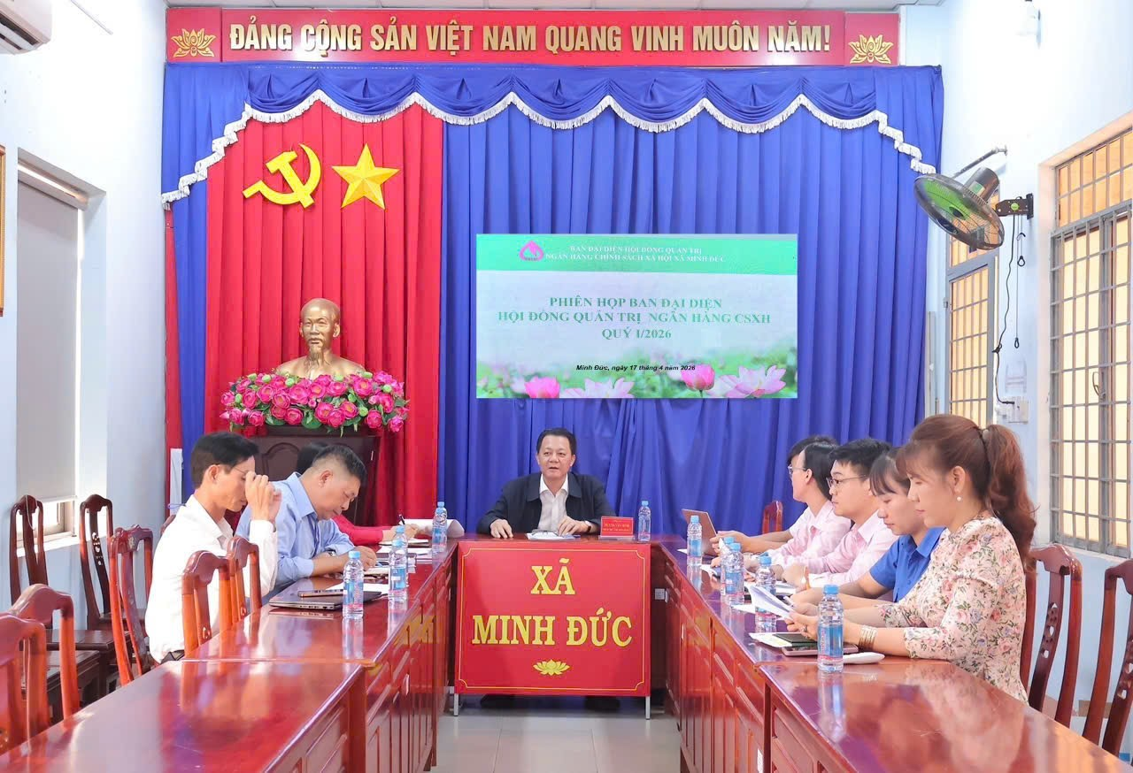 Chiều ngày 17/4/2026, Ban đại diện Hội đồng quản trị Ngân hàng Chính sách xã hội (NHCSXH) xã Minh Đức đã tổ chức phiên họp đánh giá kết quả hoạt động quý I năm 2026, triển khai phương hướng nhiệm vụ quý II năm 2026. Phiên họp được tổ chức dưới sự chủ trì của đồng chí Huỳnh Văn Minh, Phó Bí thư Đảng ủy, Chủ tịch UBND xã, Trưởng Ban đại diện; các thành viên Ban đại diện, các tổ chức chính trị - xã hội nhận ủy thác và Phòng giao dịch NHCSXH Hớn Quản.