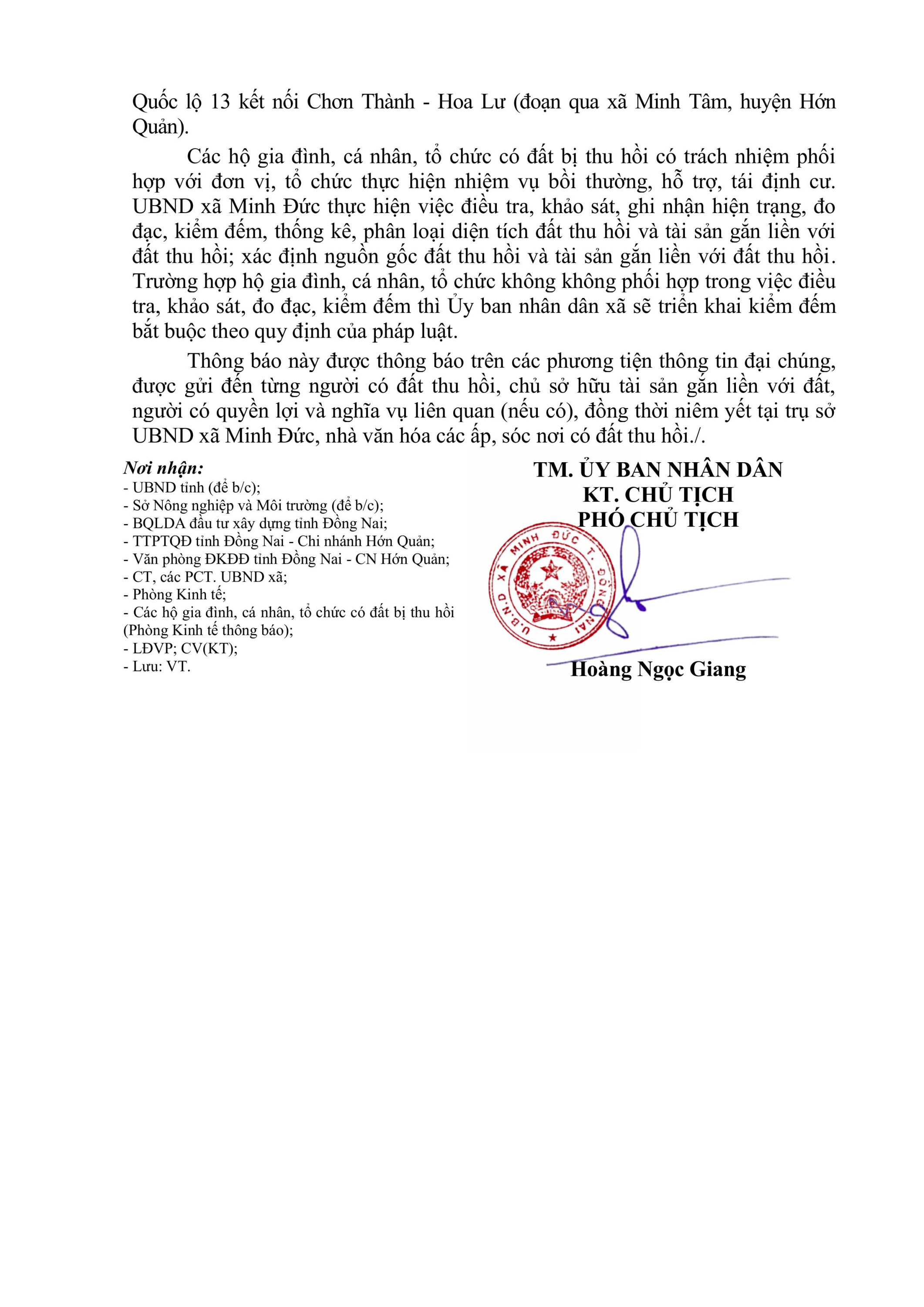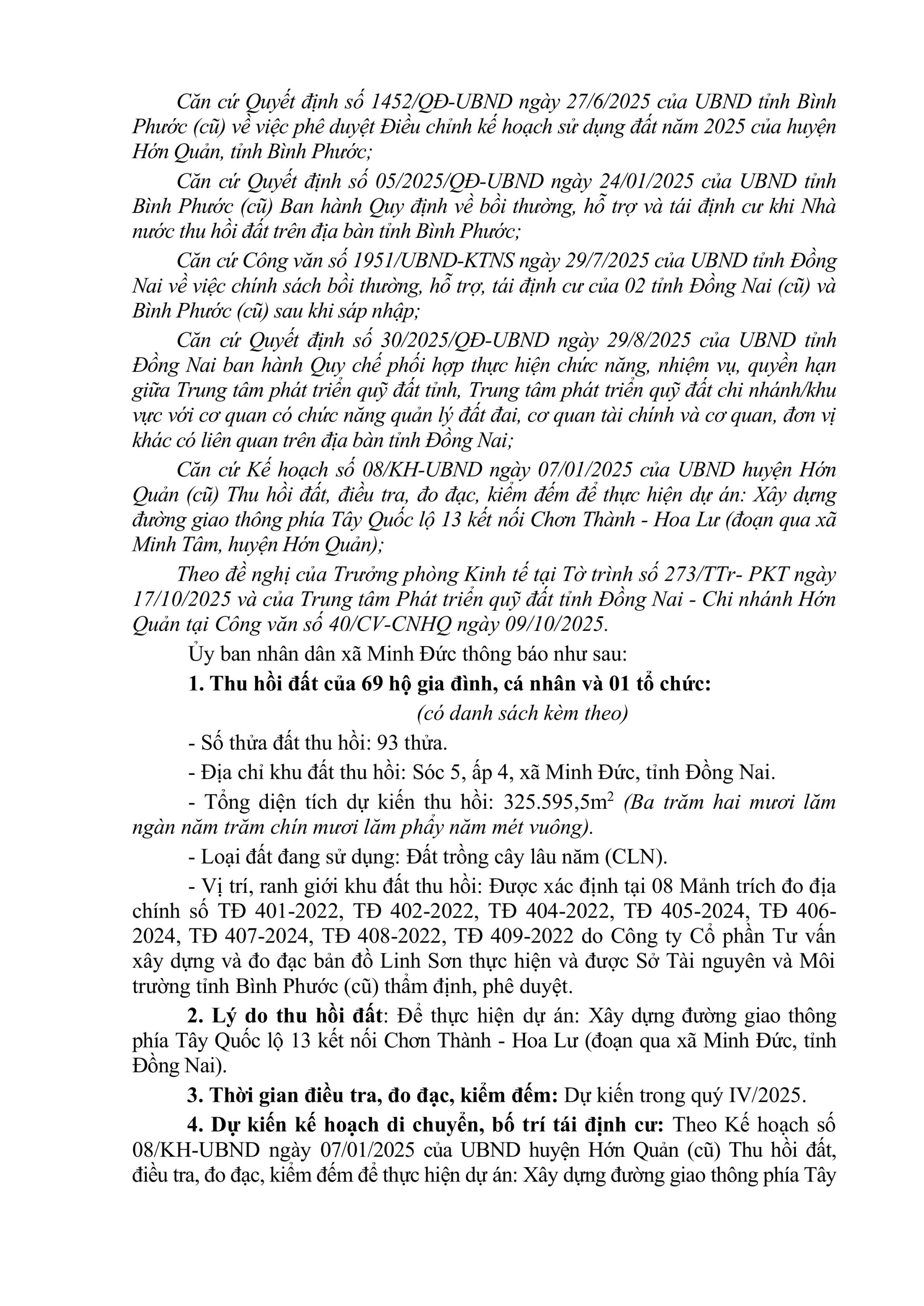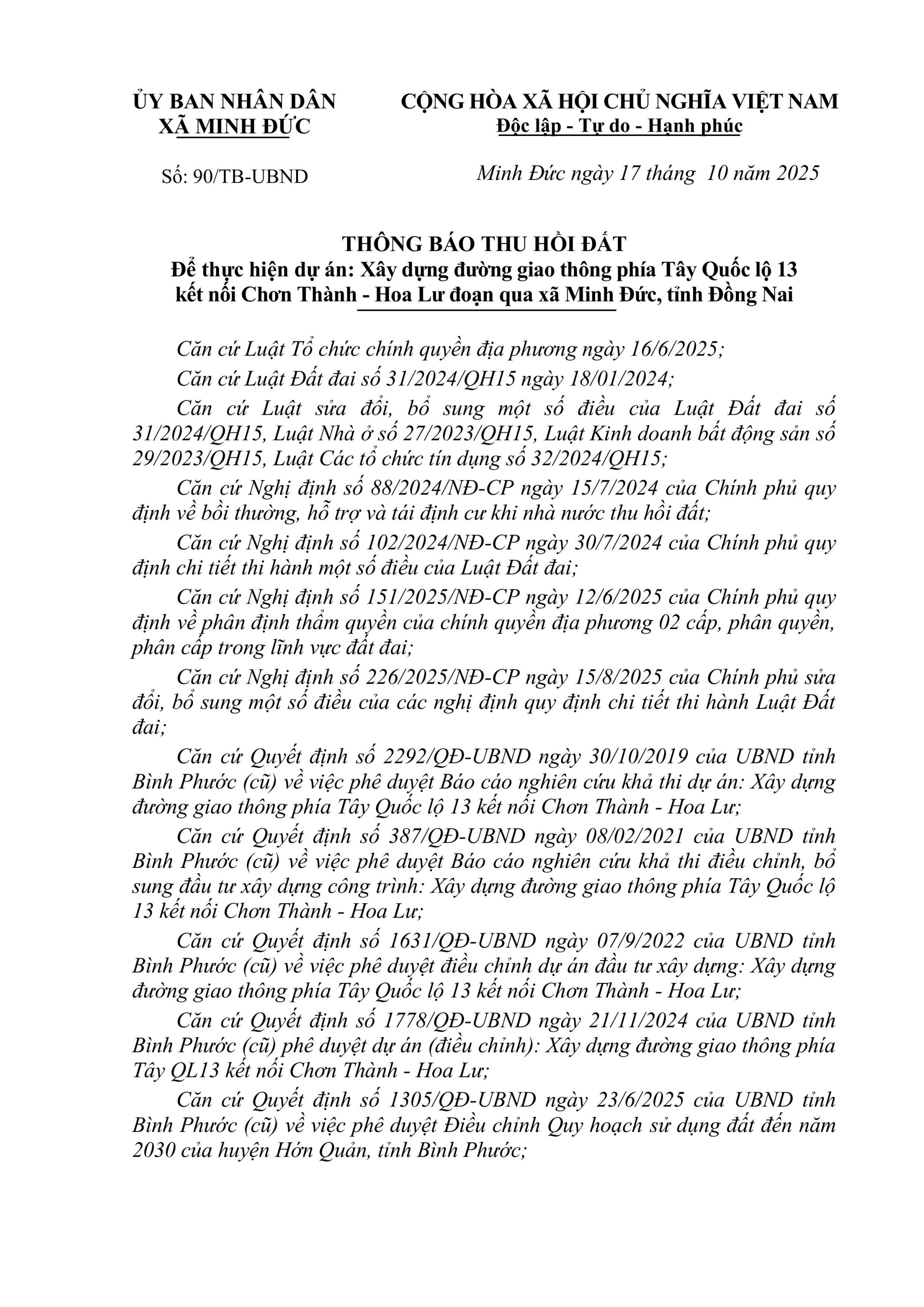 THÔNG BÁO THU HỒI ĐẤT Để thực hiện dự án: Xây dựng đường giao thông phía Tây Quốc lộ 13 kết nối Chơn Thành - Hoa Lư đoạn qua xã Minh Đức, tỉnh Đồng Nai