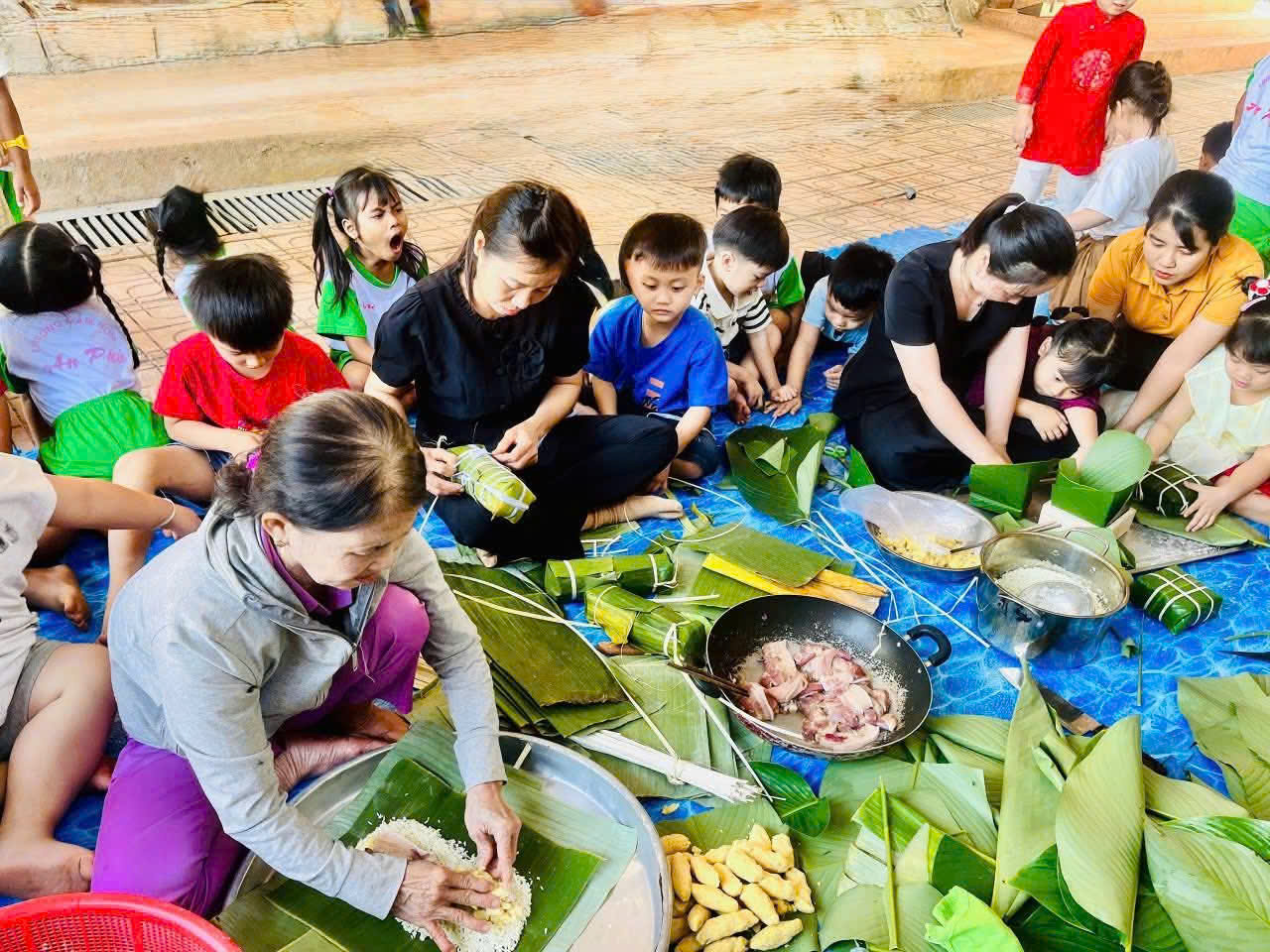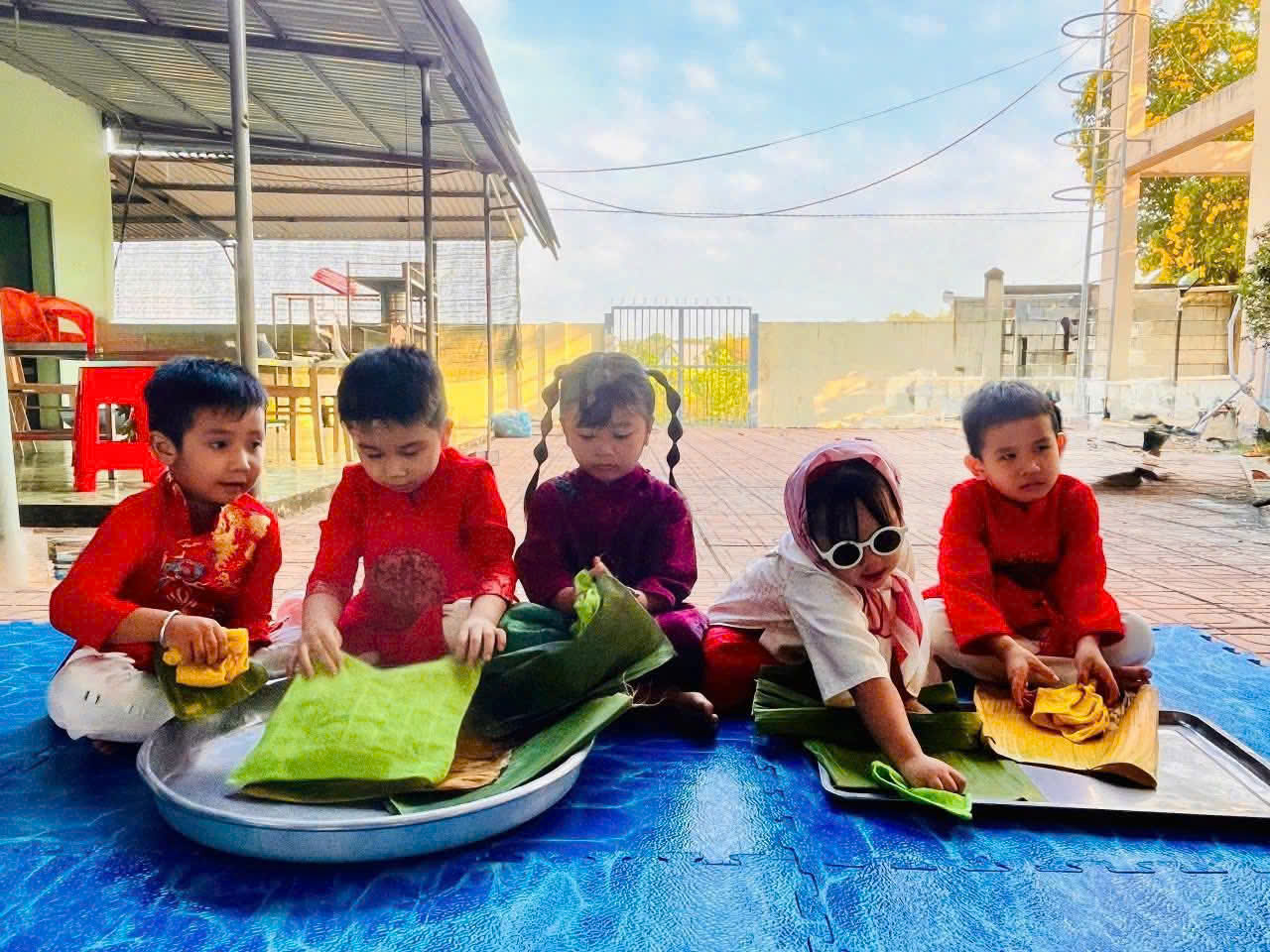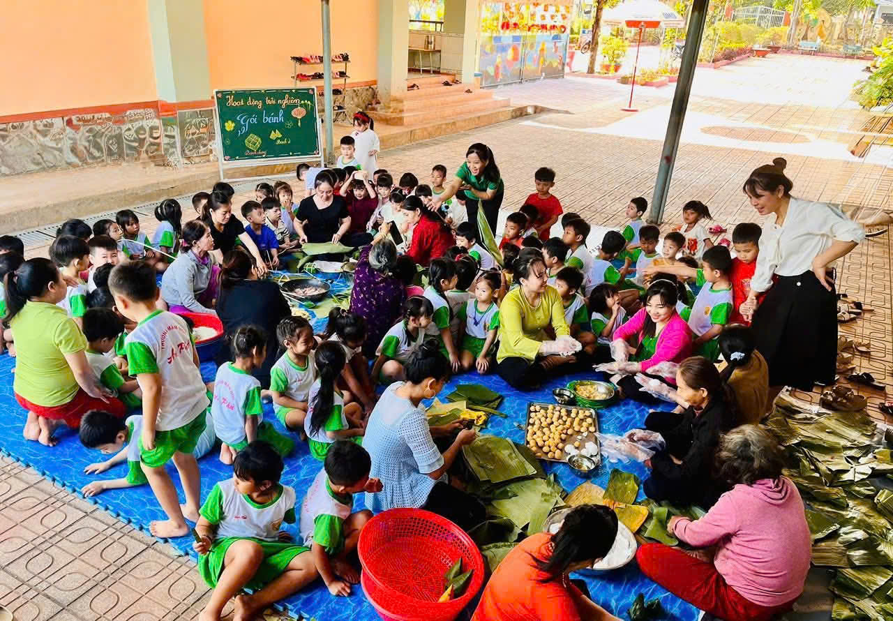Thông qua việc trực tiếp quan sát và tham gia các công đoạn như chuẩn bị nguyên liệu, xếp lá, cho nếp, đậu, thịt và gói bánh, các con không chỉ được tìm hiểu về ý nghĩa của bánh chưng – bánh tét, bánh ít, mà còn được rèn luyện sự khéo léo, tính kiên nhẫn và tinh thần làm việc.