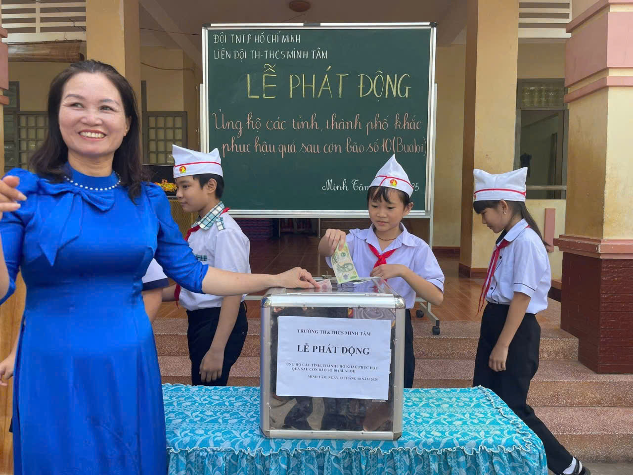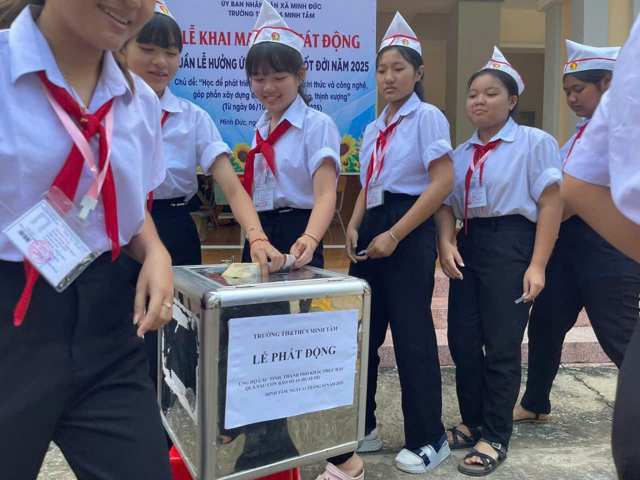 🌸 Sáng ngày 19/11/2025, Trường Tiểu học & THCS Minh Tâm (xã Minh Đức, tỉnh Đồng Nai) đã long trọng tổ chức lễ phát động ủng hộ các tỉnh, thành phố chịu thiệt hại nặng nề do cơn bão số 10 (Bualoi). Buổi lễ diễn ra trong không khí trang nghiêm, thấm đượm tinh thần tương thân tương ái, với sự tham gia đầy đủ của toàn thể cán bộ, giáo viên và học sinh nhà trường.
