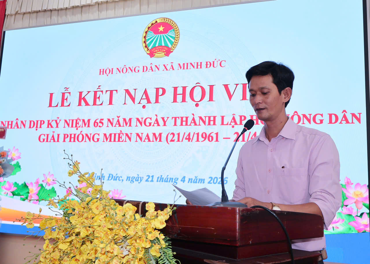 Hướng tới kỷ niệm 65 năm Ngày thành lập Hội Nông dân Giải phóng miền Nam (21/4/1961 – 21/4/2026), ngày 21/4/2026, tại Hội trường UBND xã, Ban Chấp hành Hội Nông dân xã Minh Đức đã tổ chức Lễ kết nạp hội viên mới, góp phần củng cố và phát triển tổ chức Hội ngày càng vững mạnh.