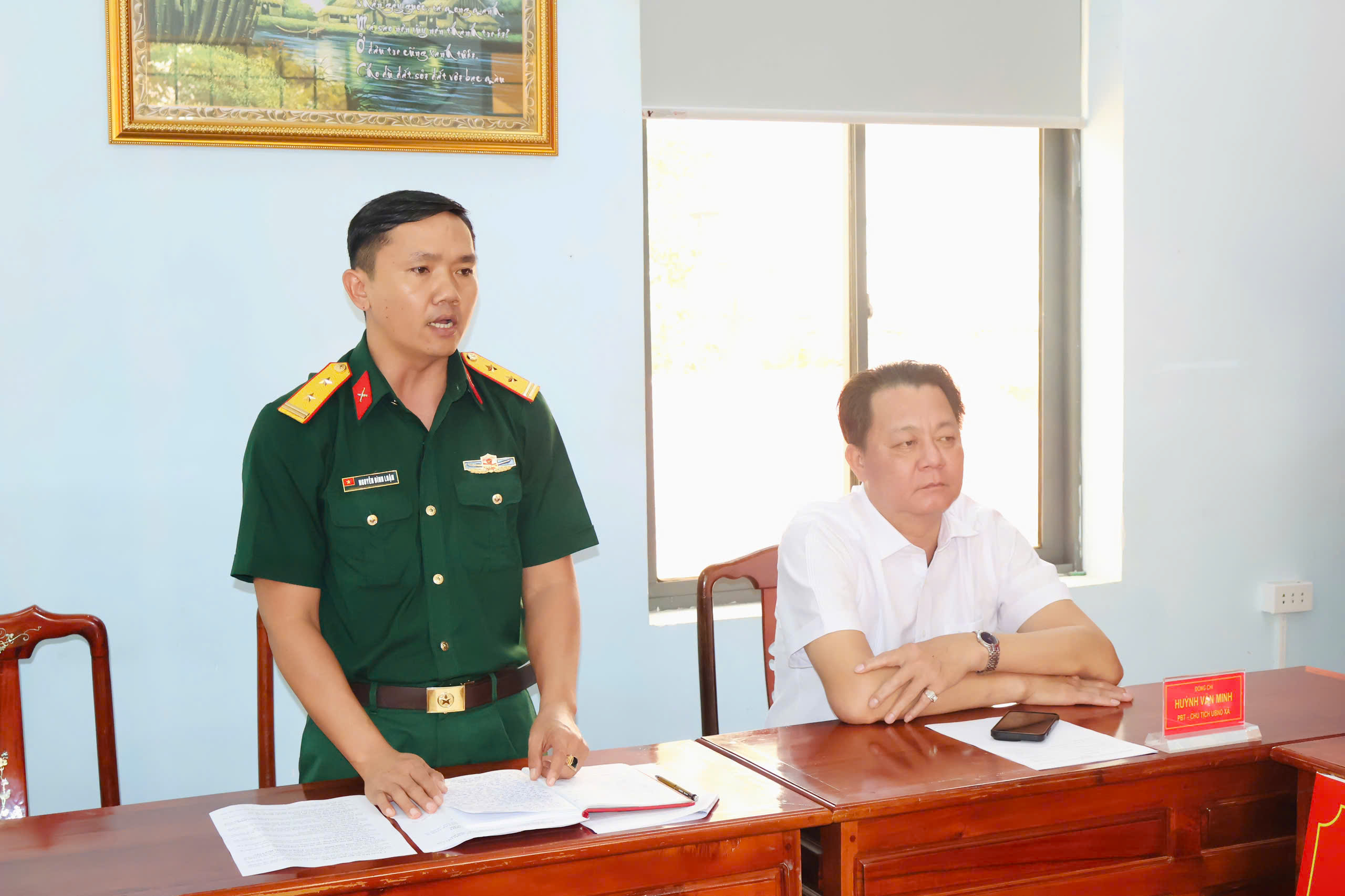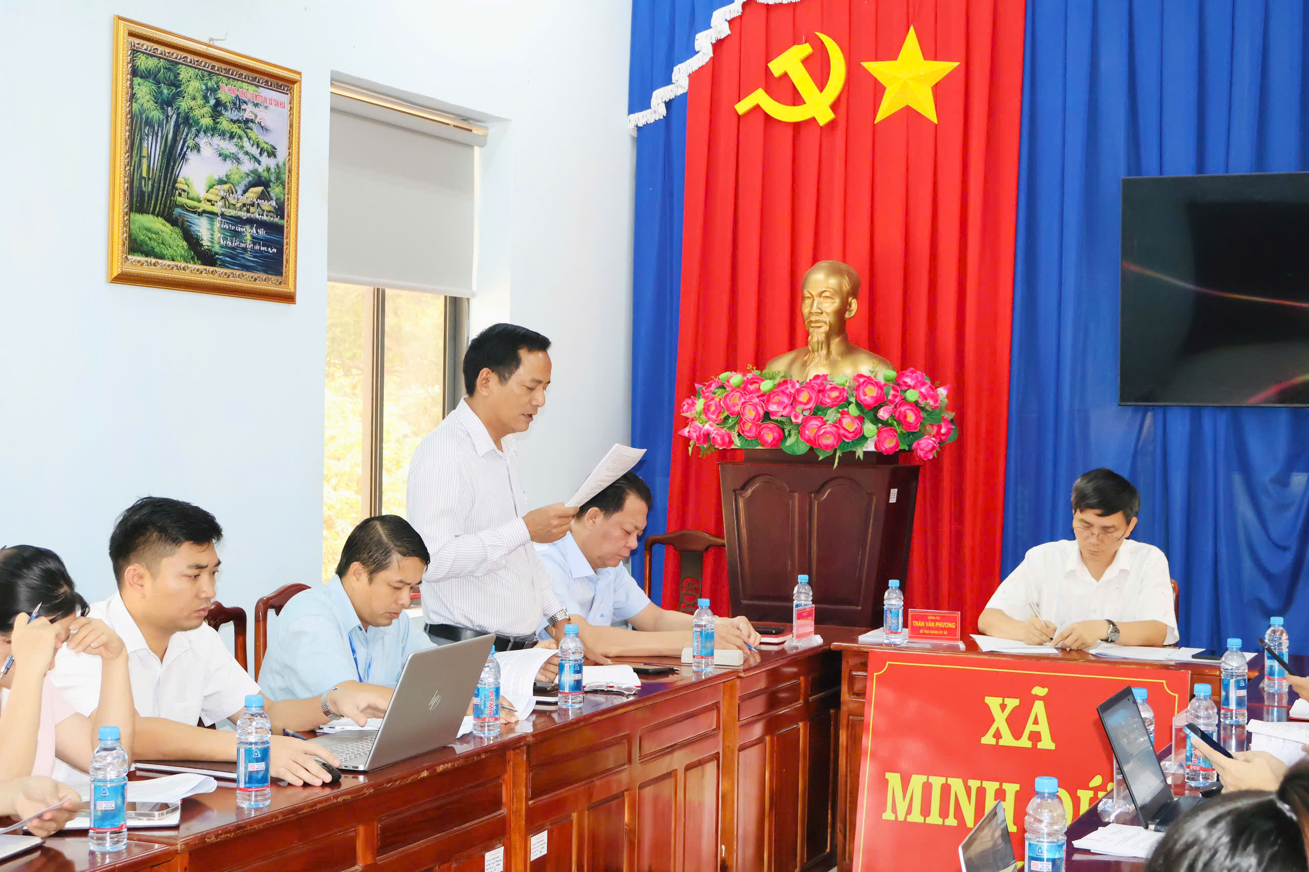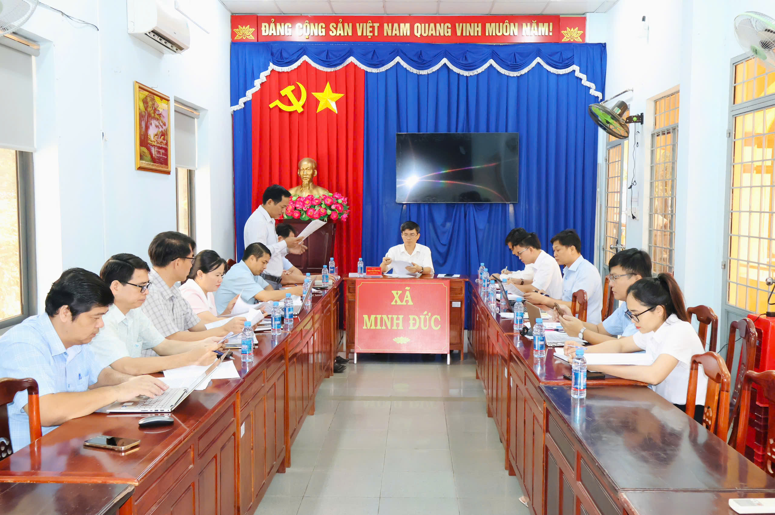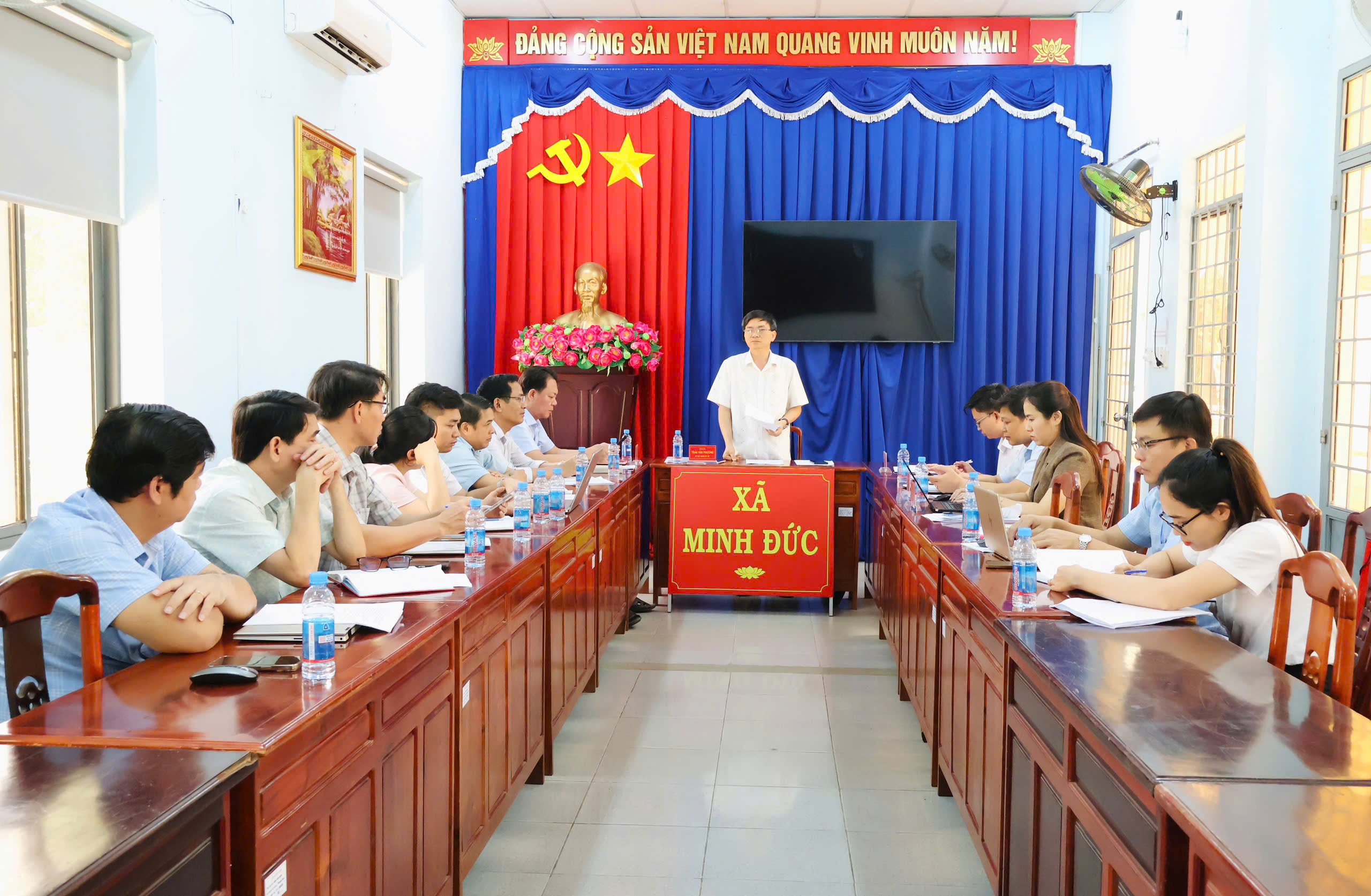 Tham dự hội nghị có đồng chí Trần Văn Phương – Bí thư Đảng ủy, Chủ tịch HĐND xã; đồng chí Huỳnh Văn Minh – Phó Bí thư Đảng ủy, Chủ tịch UBND xã; đồng chí Lê Thanh Hoàng – UVBTV, Trưởng Ban xây dựng Đảng xã; cùng các đồng chí trong Ban Chỉ huy Quân sự xã Minh Đức.