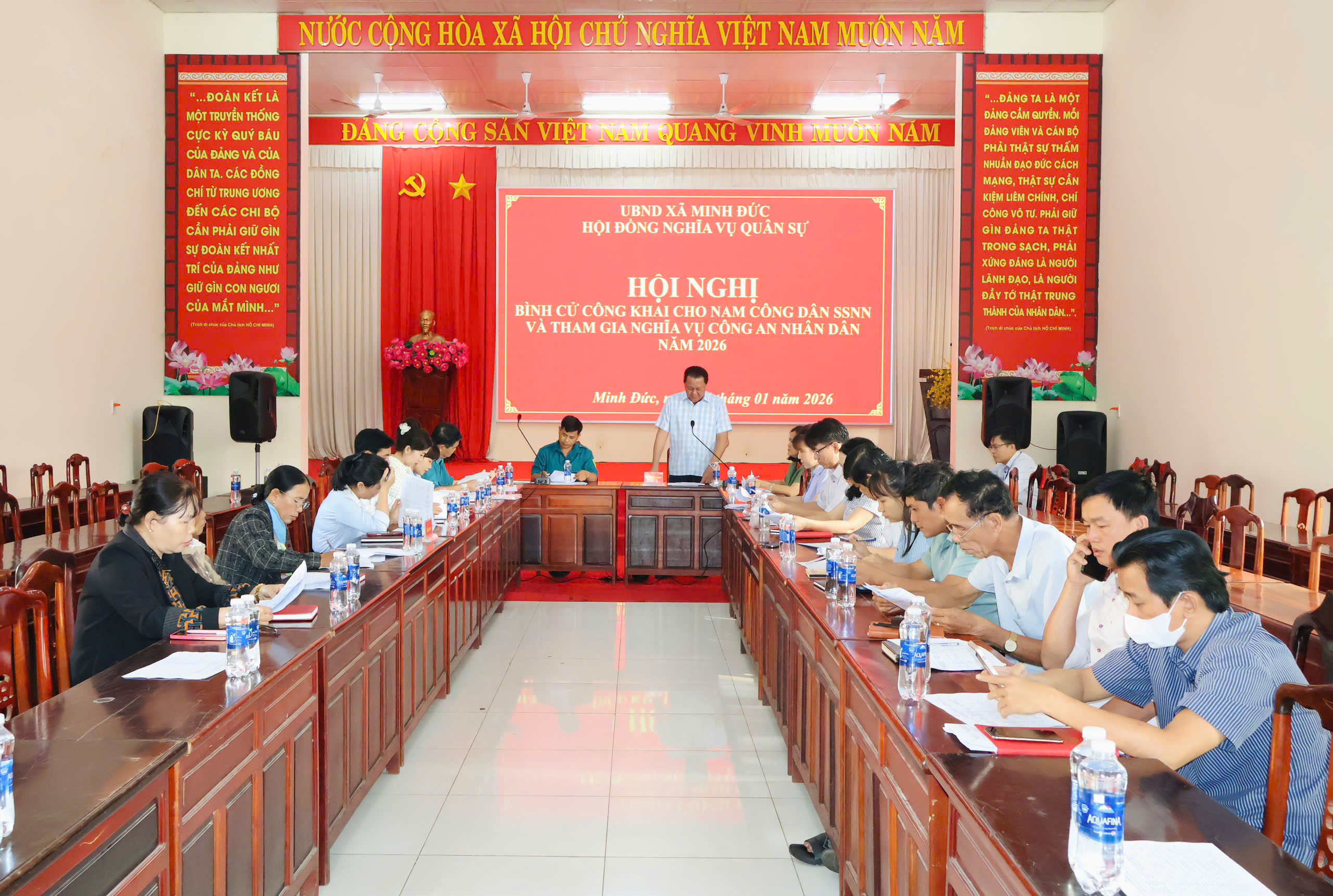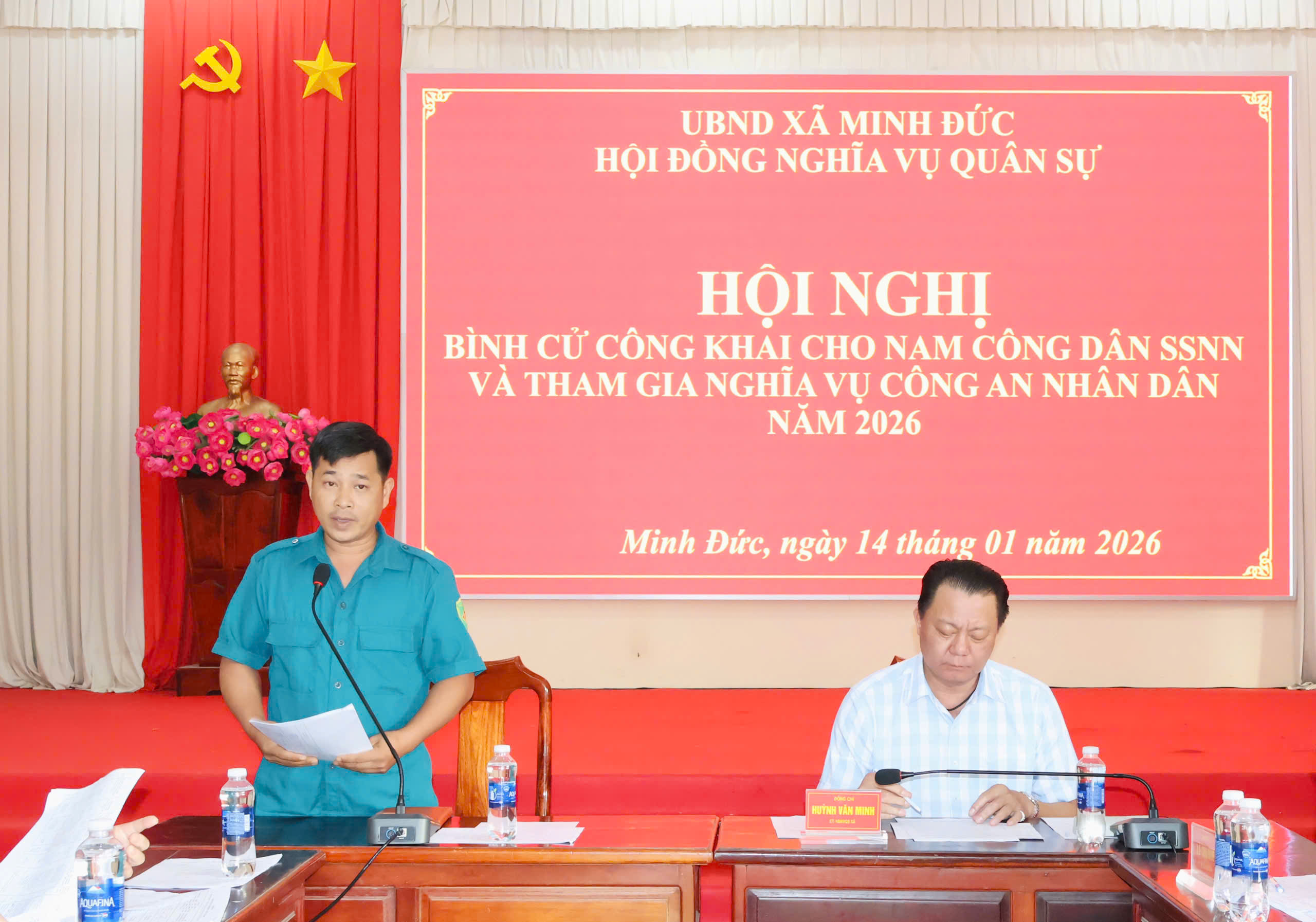 Sáng 14/01/2026, tại Hội trường UBND xã, Hội đồng Nghĩa vụ quân sự (NVQS) xã Minh Đức tổ chức Hội nghị bình cử công khai cho nam công dân tham gia nghĩa vụ quân sự và tham gia nghĩa vụ công an năm 2026.