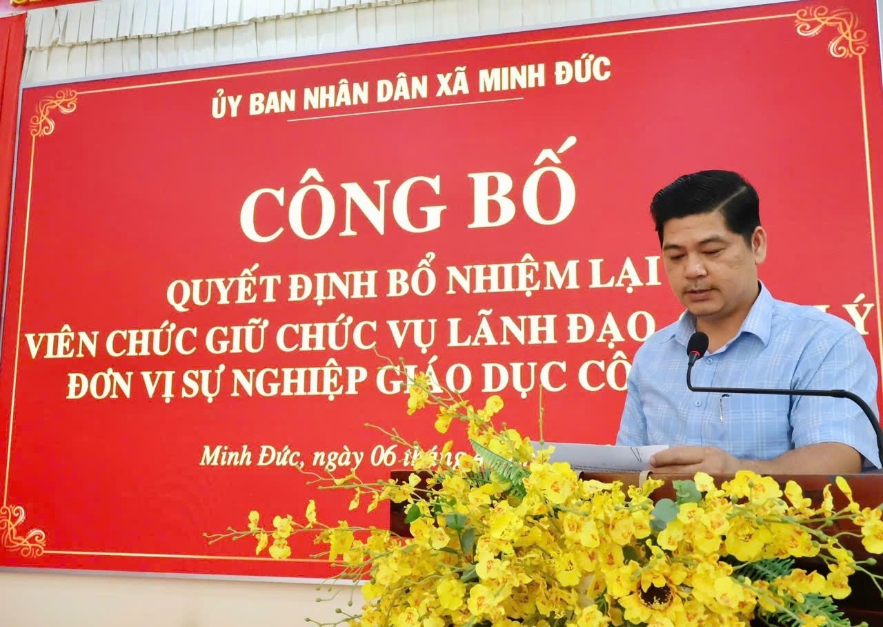 Chiều ngày 6/4/2026, Ủy ban nhân dân xã Minh Đức tổ chức Lễ công bố và trao quyết định bổ nhiệm lại viên chức giữ chức vụ lãnh đạo, quản lý đơn vị sự nghiệp giáo dục công lập.