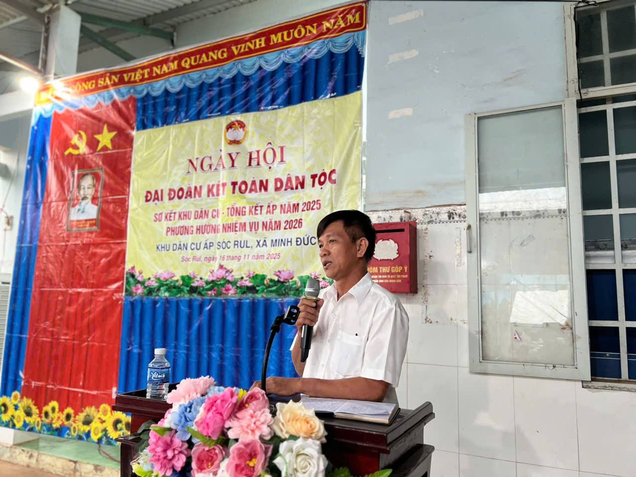 Chiều ngày 16/11/2025, Ấp Sóc Rul, xã Minh Đức đã long trọng tổ chức Ngày hội Đại đoàn kết toàn dân tộc năm 2025 kết hợp tổng kết hoạt động ấp. Đây là hoạt động có ý nghĩa sâu sắc nhằm ôn lại truyền thống vẻ vang của Mặt trận Tổ quốc Việt Nam và tăng cường sự gắn kết trong cộng đồng dân cư.