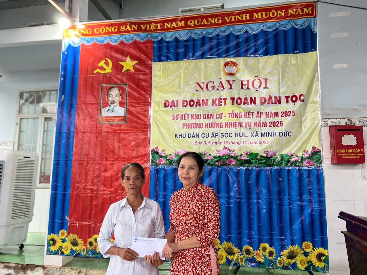 Bà Nguyễn Thị Quý – Ủy viên Ban Thường vụ Đảng ủy, Chủ tịch Ủy ban MTTQ Việt Nam xã Minh Đức; Ông Nguyễn Anh Tuấn – Phó Chánh Văn phòng Đảng ủy xã Minh Đức; Cùng đại diện Chi bộ, Ban ấp và đông đảo bà con nhân dân ấp Sóc Rul.