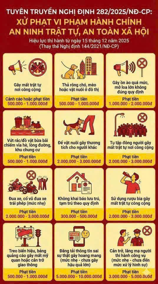 Nhằm tăng cường công tác quản lý nhà nước, giữ gìn an ninh trật tự, an toàn xã hội, Chính phủ đã ban hành Nghị định số 282/2025/NĐ-CP về xử phạt vi phạm hành chính trong lĩnh vực an ninh, trật tự, an toàn xã hội (có hiệu lực thi hành từ ngày 15/12/2025, thay thế Nghị định số 144/2021/NĐ-CP). Theo đó, nhiều hành vi vi phạm thường gặp trong khu dân cư đã được quy định cụ thể mức xử phạt.