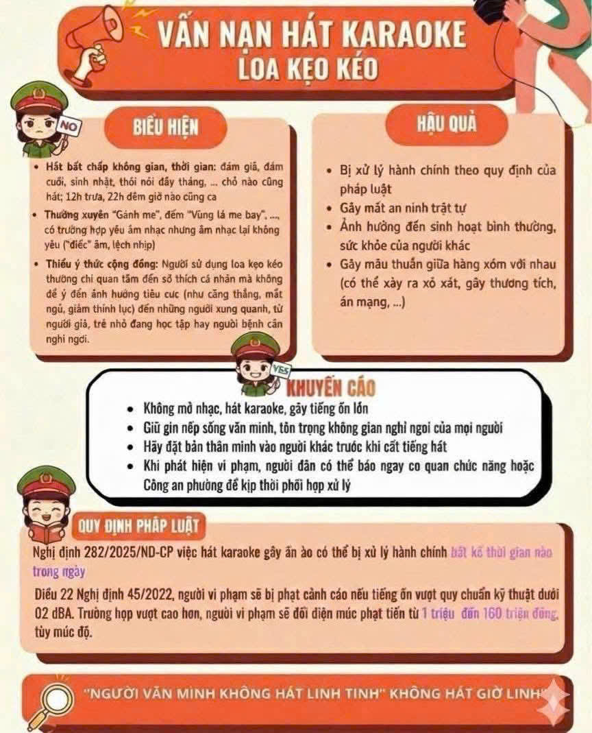 Trong những năm gần đây, cùng với sự phát triển của đời sống vật chất và tinh thần, nhu cầu giải trí của người dân ngày càng tăng cao. Trong đó, hoạt động hát karaoke tại gia đình, khu dân cư trở nên phổ biến. Tuy nhiên, bên cạnh những mặt tích cực, tình trạng hát karaoke bằng loa kéo với âm lượng lớn, kéo dài nhiều giờ, không đúng thời gian quy định đã và đang gây ra nhiều hệ lụy tiêu cực, ảnh hưởng trực tiếp đến đời sống sinh hoạt, sức khỏe, học tập, lao động và an ninh trật tự tại khu dân cư.